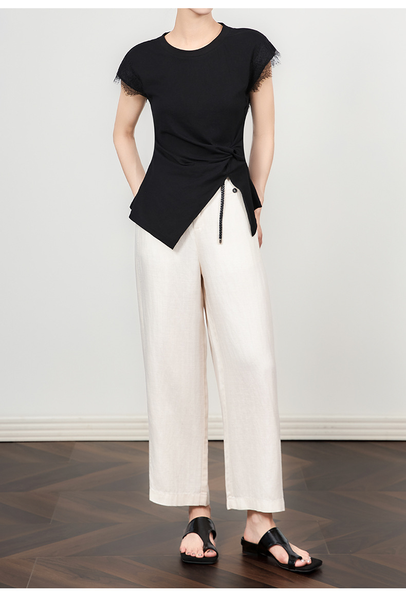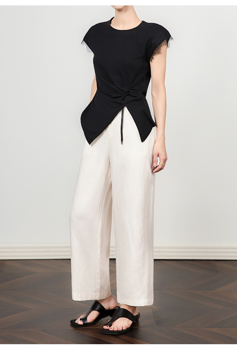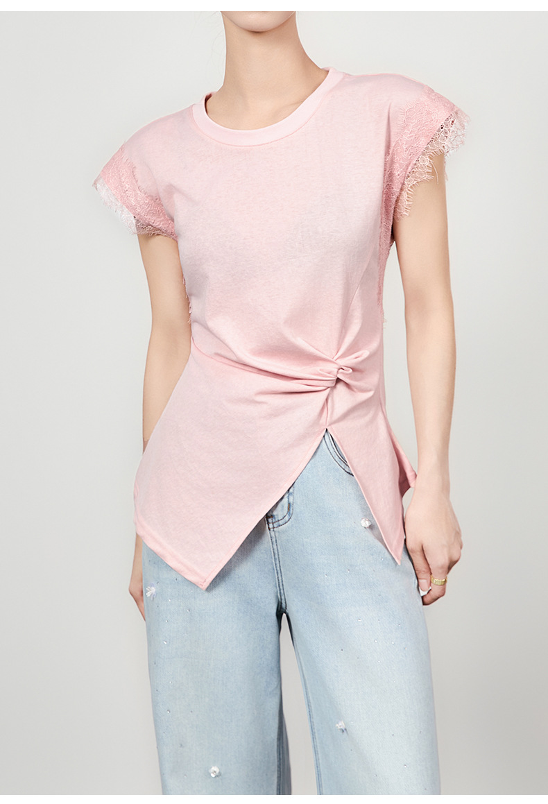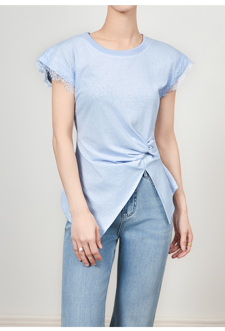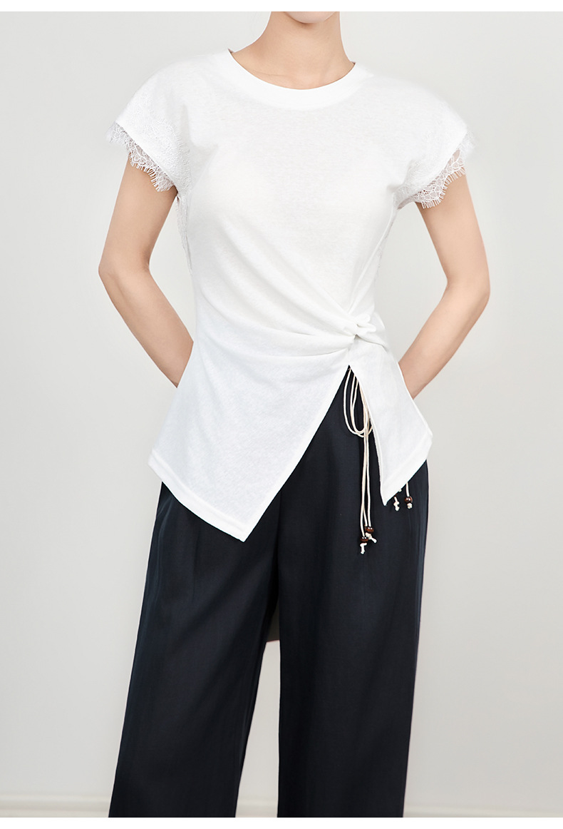 「高货wl」全新升级【铂金会员165/天猫219/差价54】(14459)洛诗琳夏季新款小众设计感蕾丝拼接褶皱收腰显瘦圆领T恤