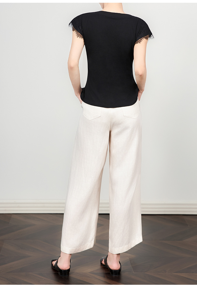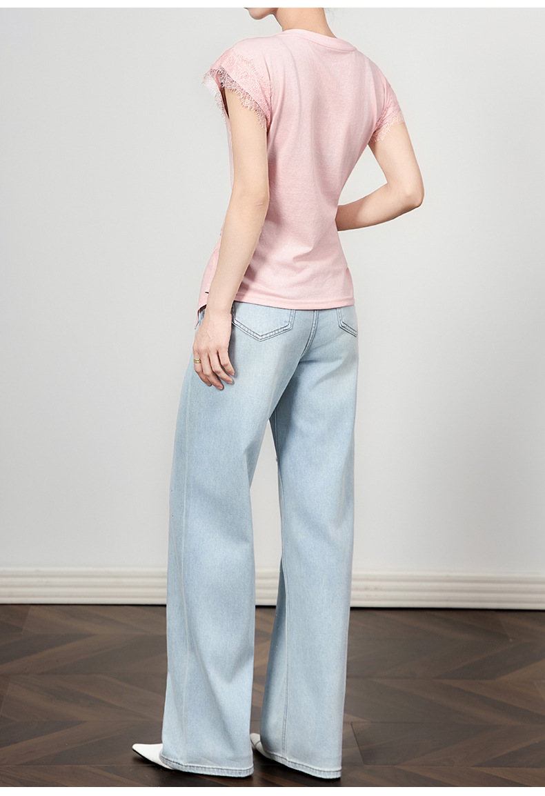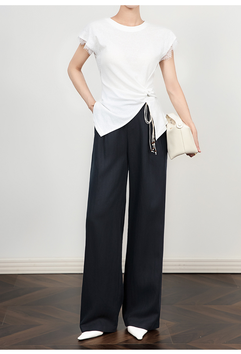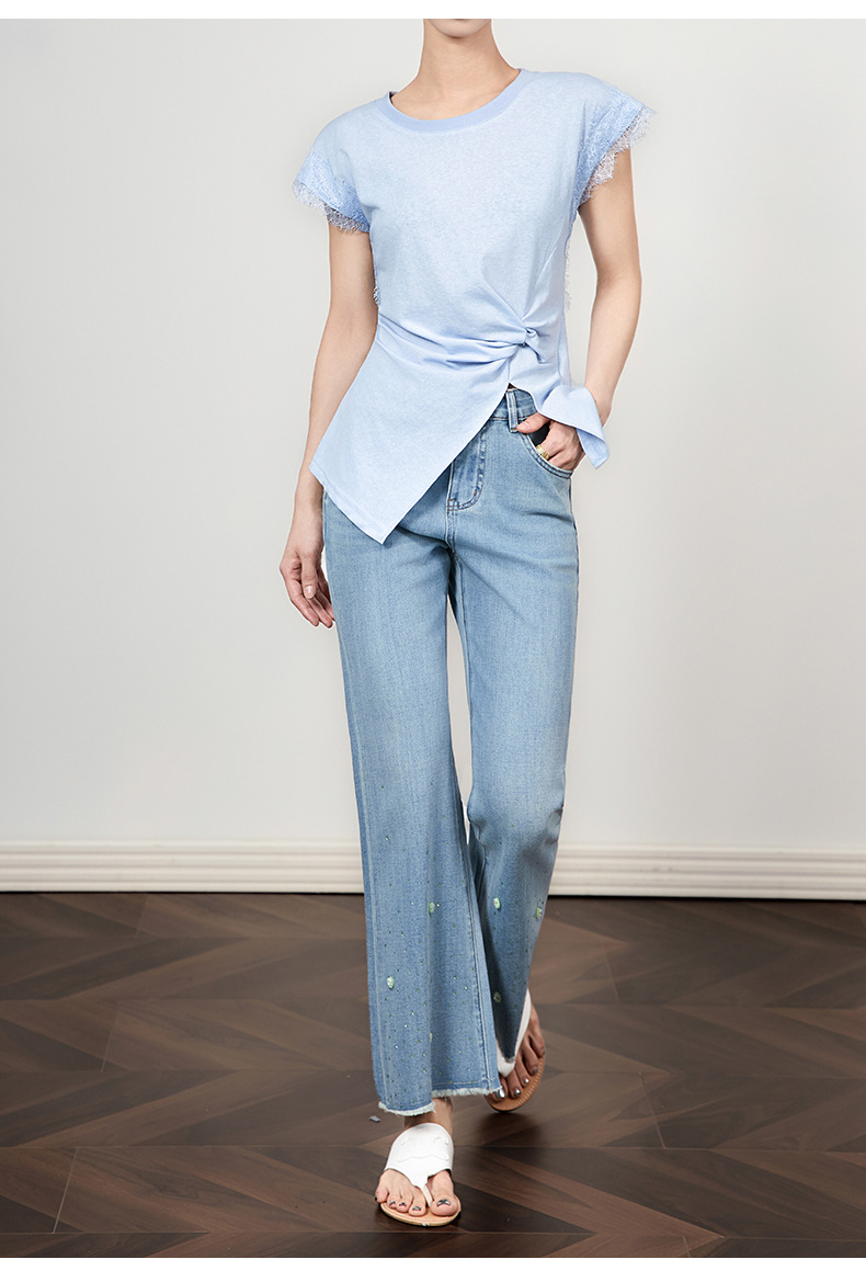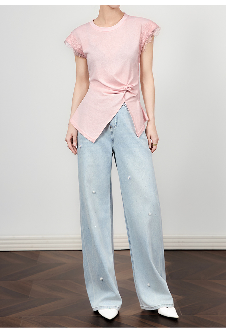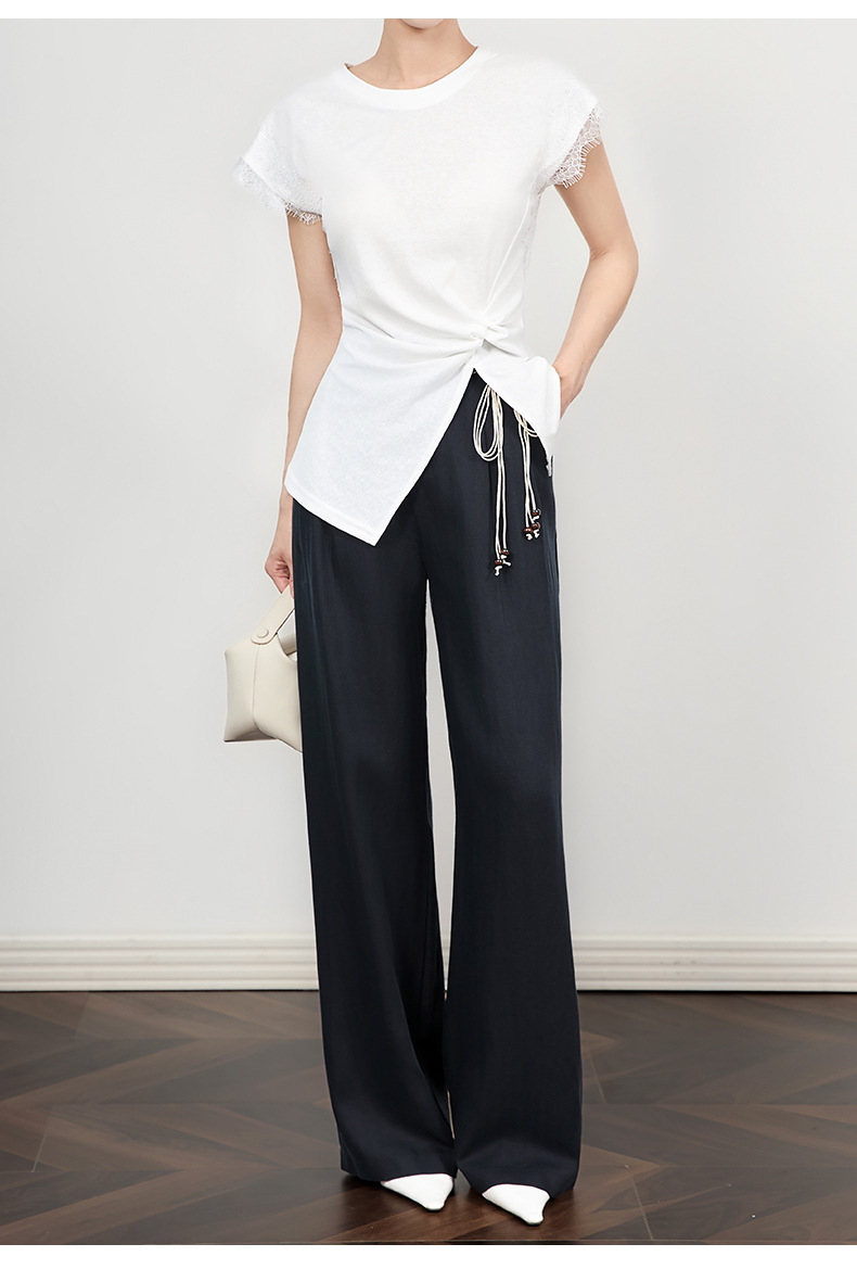 「高货wl」全新升级【铂金会员165/天猫219/差价54】(14459)洛诗琳夏季新款小众设计感蕾丝拼接褶皱收腰显瘦圆领T恤