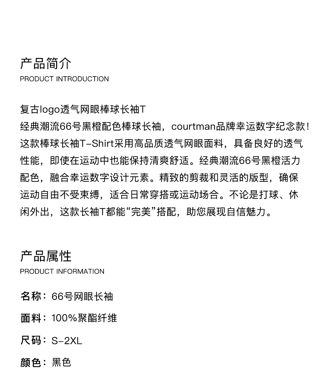 COURTMAN野球帝 66号数字上衣投篮服网眼长袖T恤健身运动男训练服