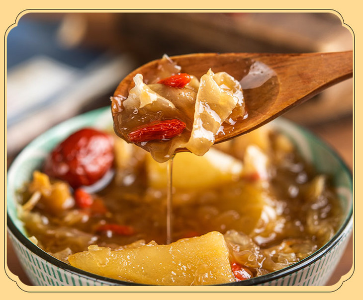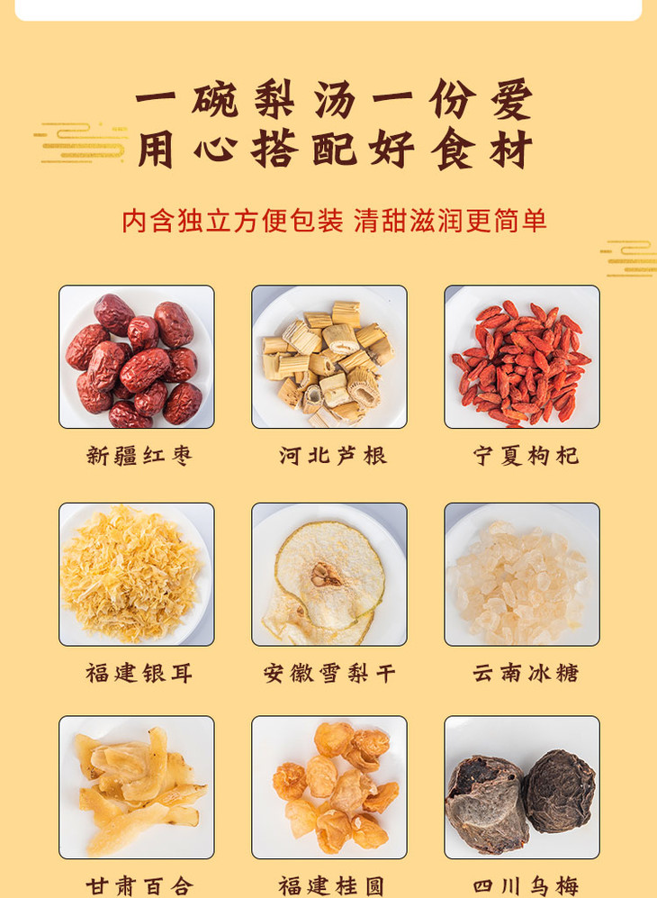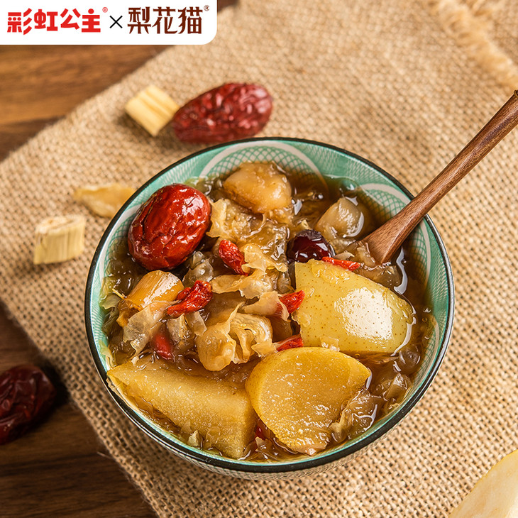 【配料】干银耳、干百合、鲜芦根、干梨片、枸杞、红枣、冰糖、桂圆干