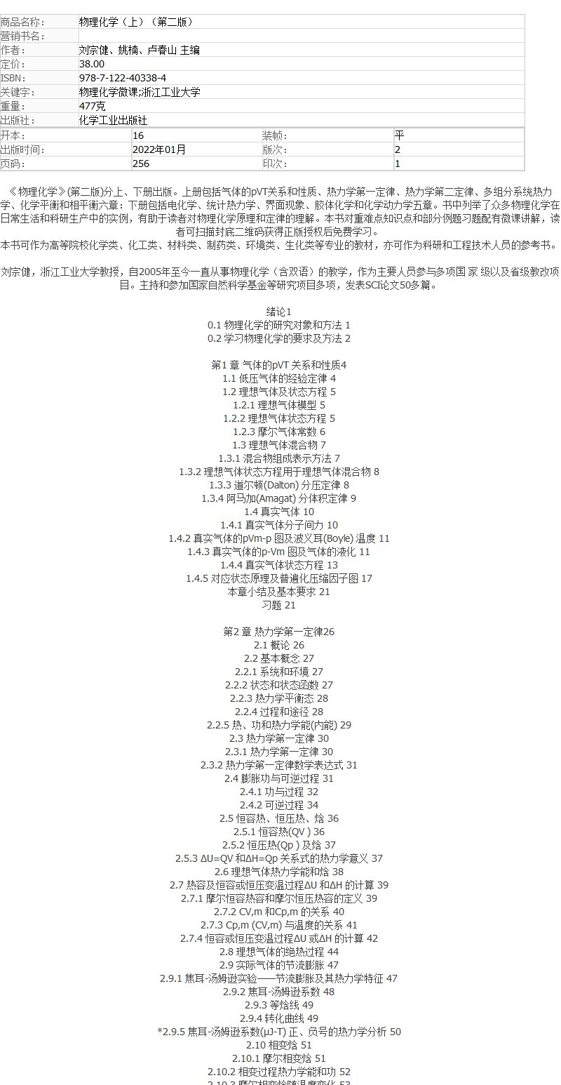 物理化学 刘宗健 上 第二版 气体pVT关系和性质 热力学第一定律 多组分系统热力学 化学平衡和相平衡 高等院校化学化工类专业教材