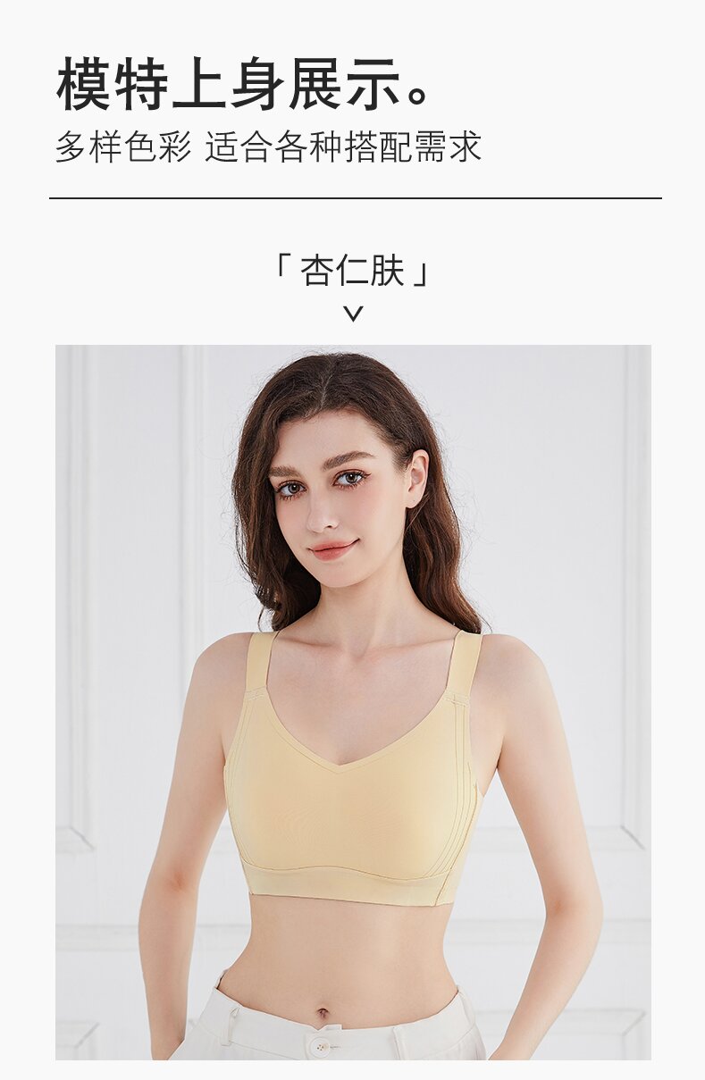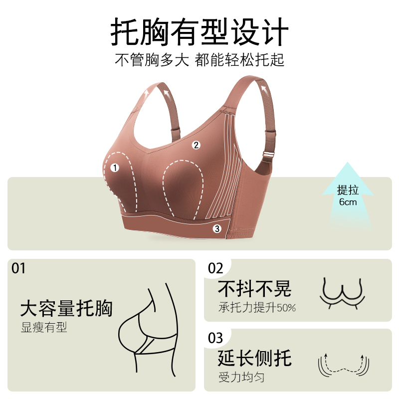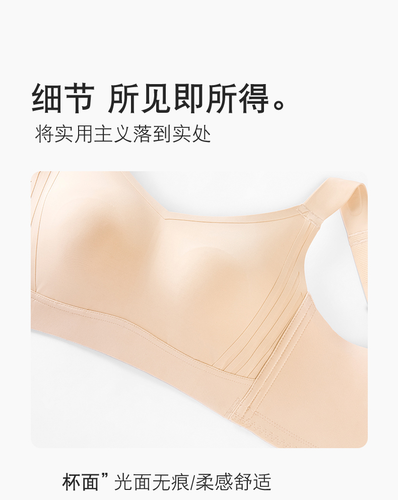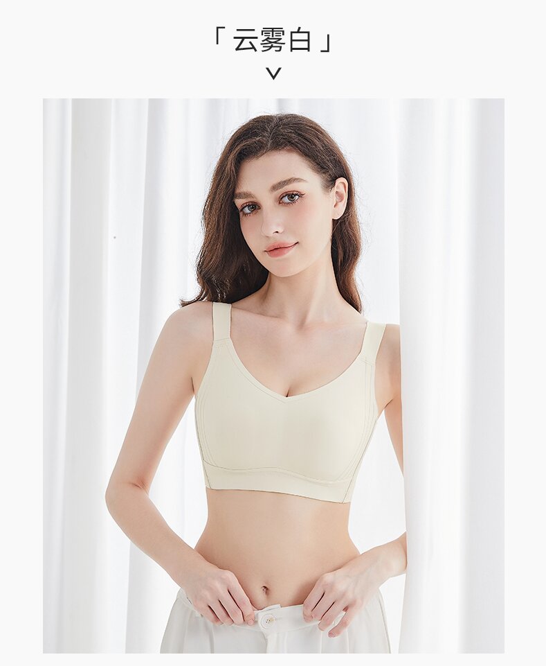 3、侧面包裹隐藏赘肉,收拢副乳全面包容,平服无痕。杯内隐藏侧托片,轻塑胸型,侧收不外扩。宽侧比双胶骨高弹力,帮助侧收快速锁脂塑型,再度稳定多余脂肪,抬手不移位,给予胸部全方位舒适的包容呵护。