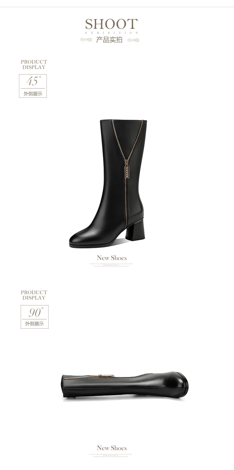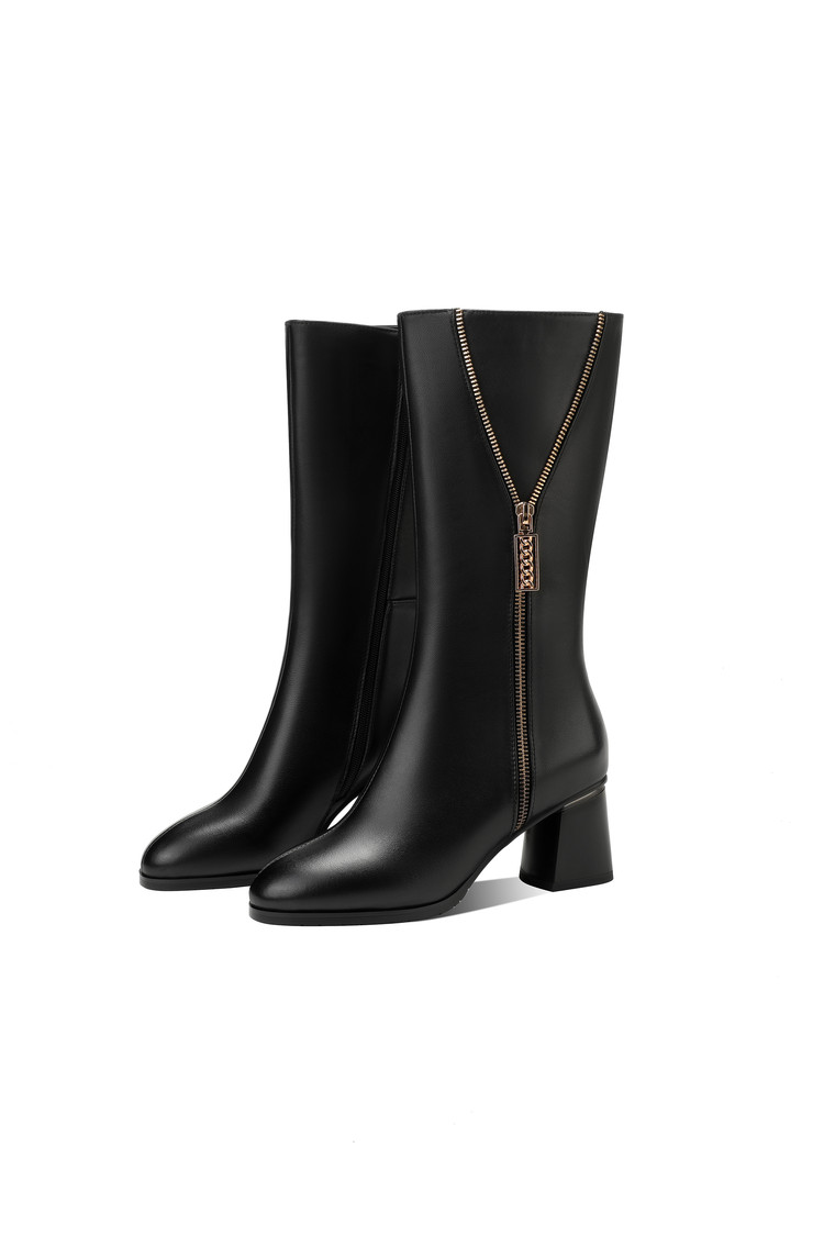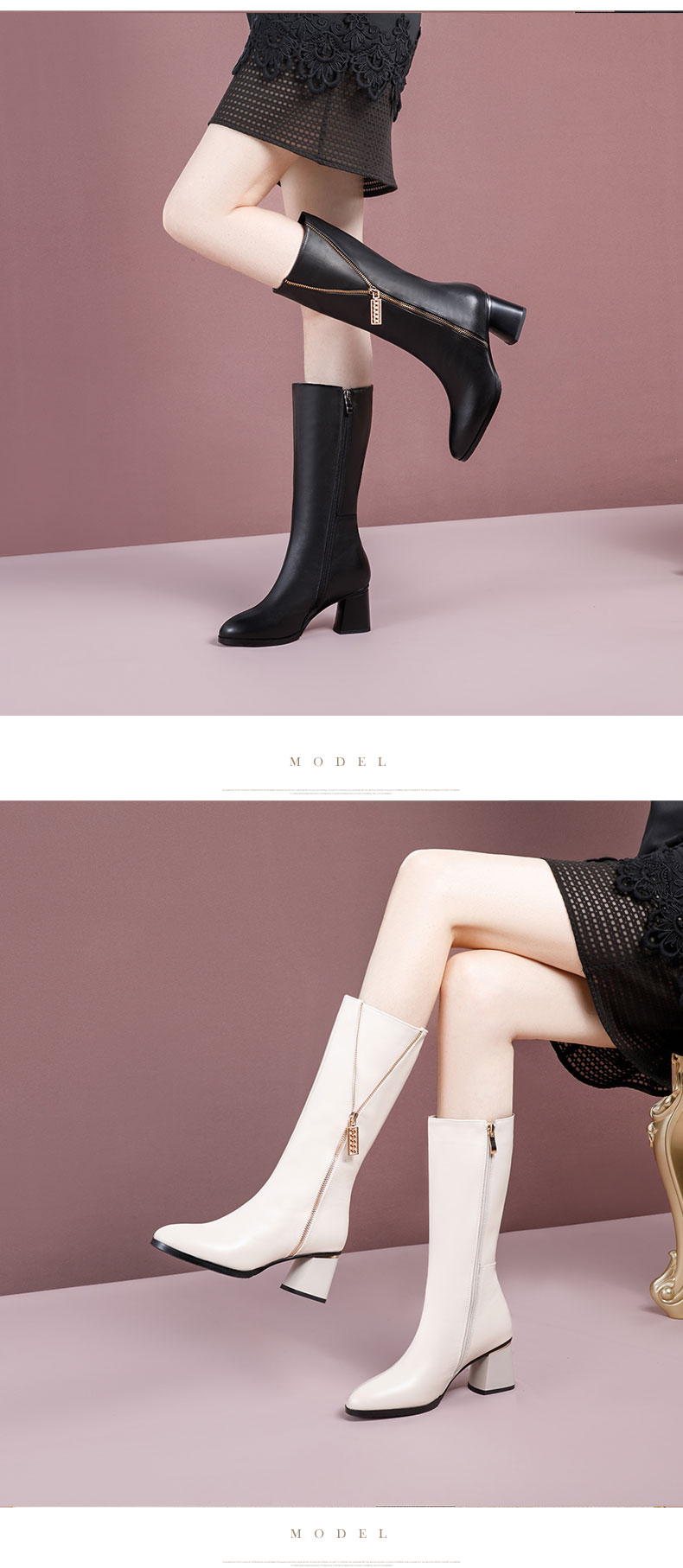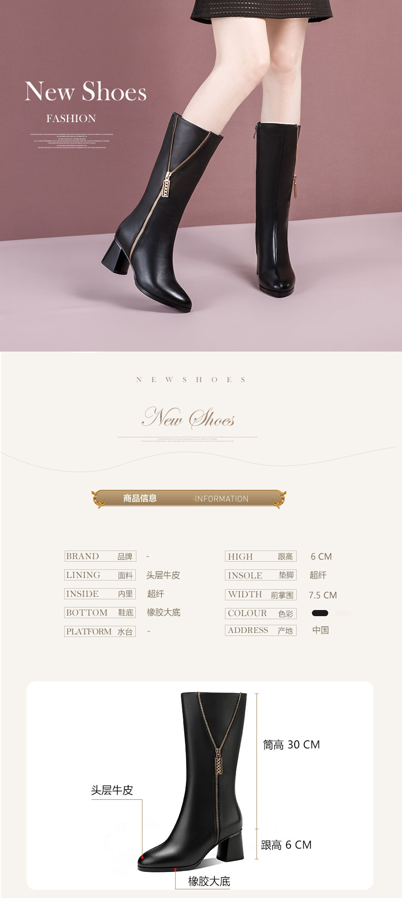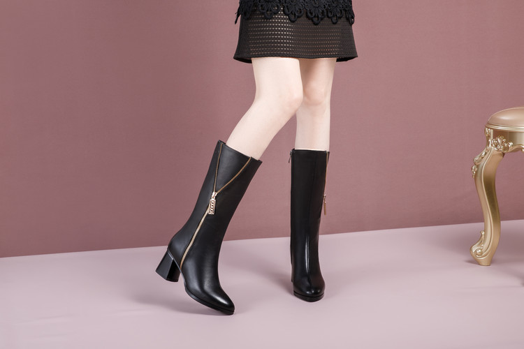 【预售7天】真软皮中筒靴女秋冬新款高跟加绒保暖靴子女时尚百搭洋气粗跟皮鞋JLD&5070