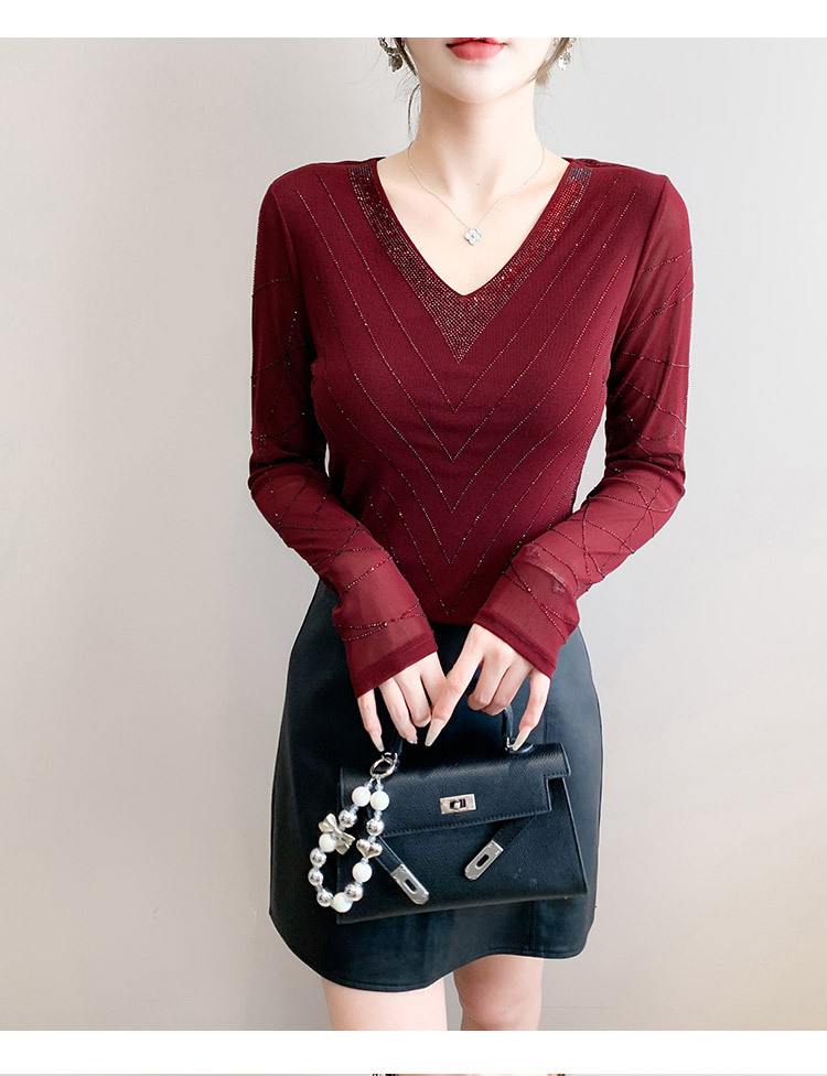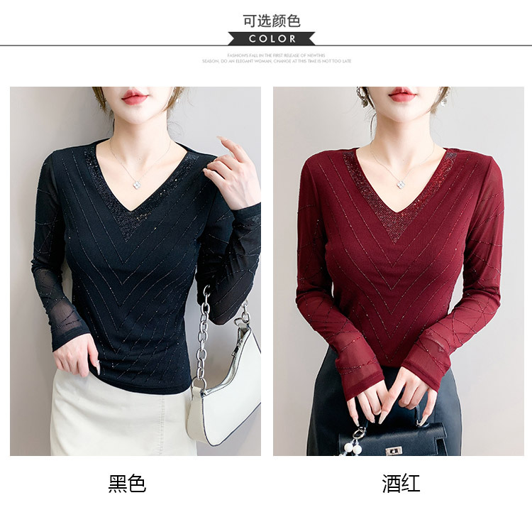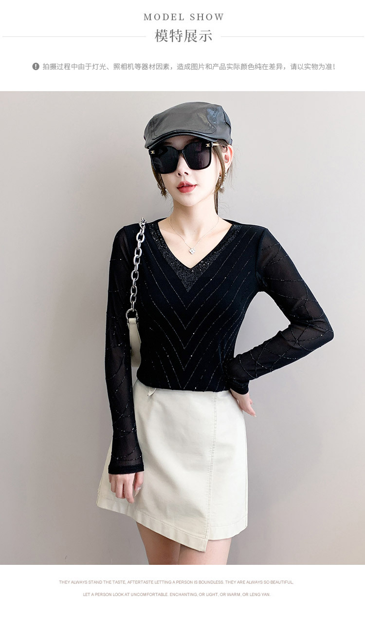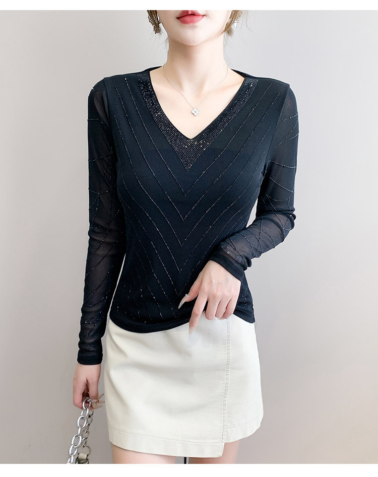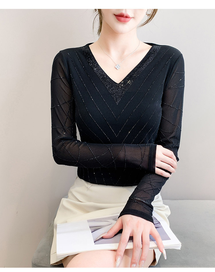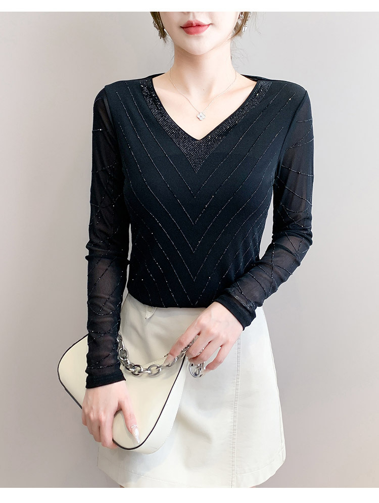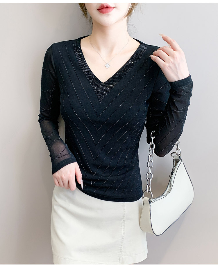 KQL 461H8019性感V领重工艺镶钻T恤上衣修身显瘦打底衫