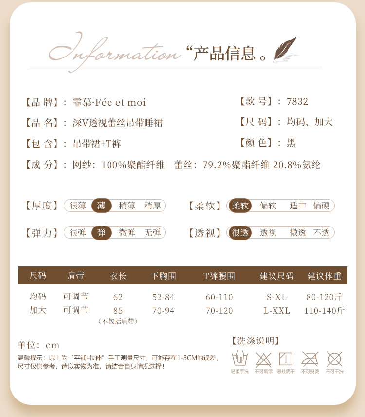 【V领睡裙】霏慕深V蕾丝肩带式睡裙7832
