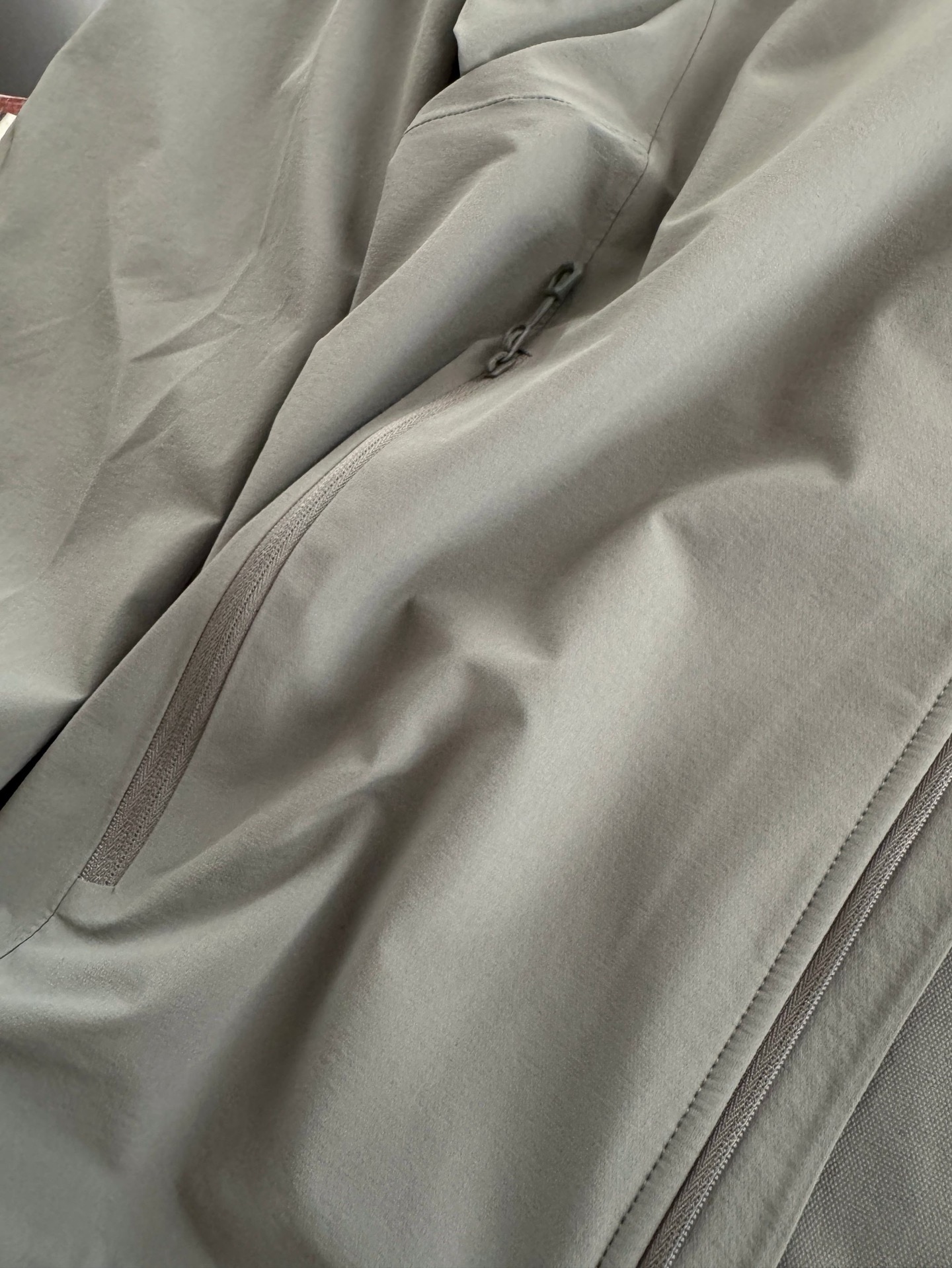 ⚠ 90D高弹力87%锦纶13%氨纶轻量化薄款梭织软壳面料,经DWR防泼水处理,不惧风雨透汽干爽!轻薄,但质地柔韧有筋骨,有立挺挺感,也有舒适自在感,不拘束不压身,完全不会有硬邦邦的塑料感!