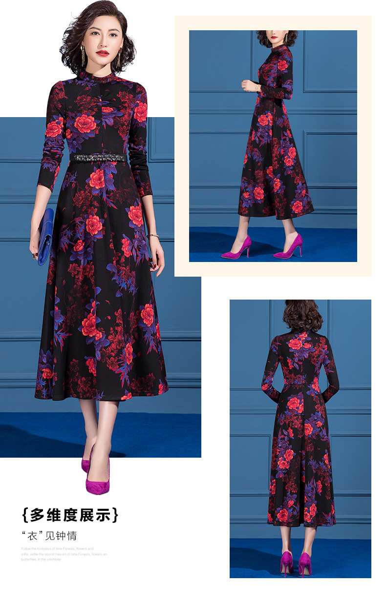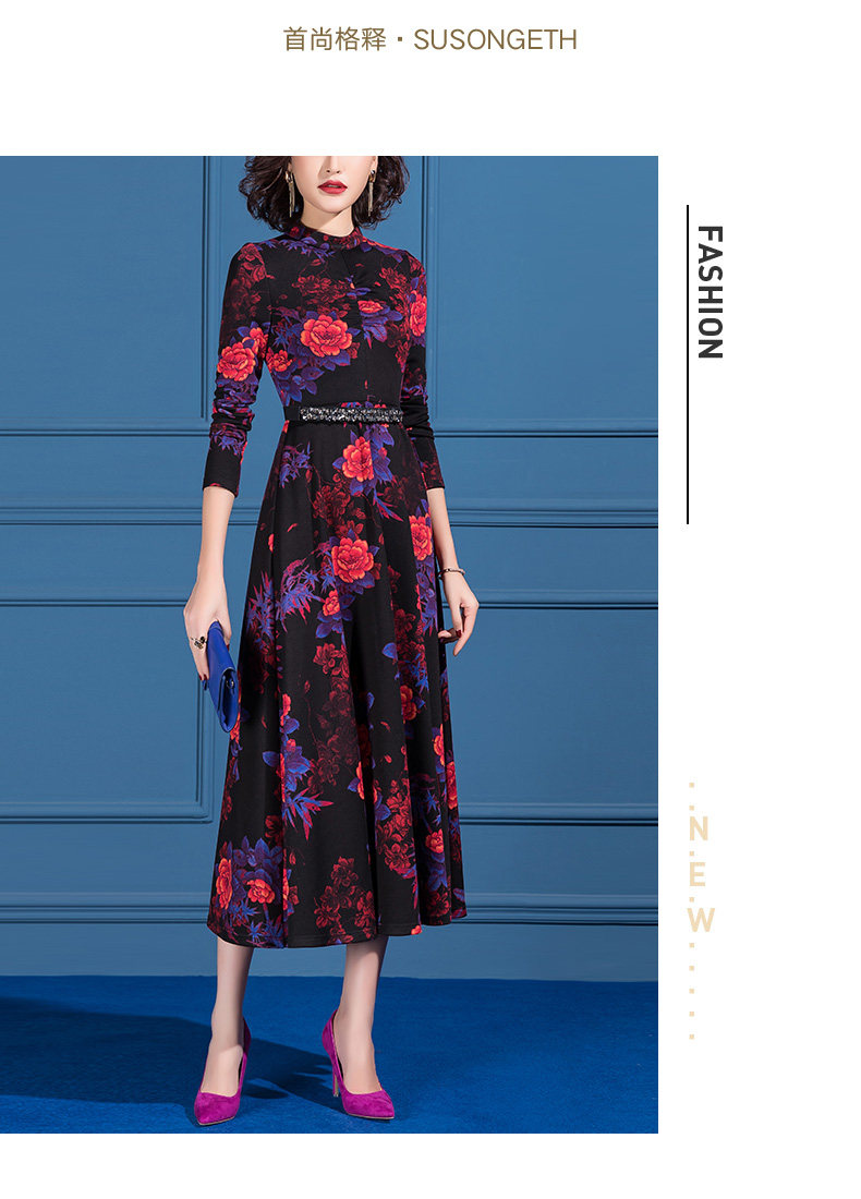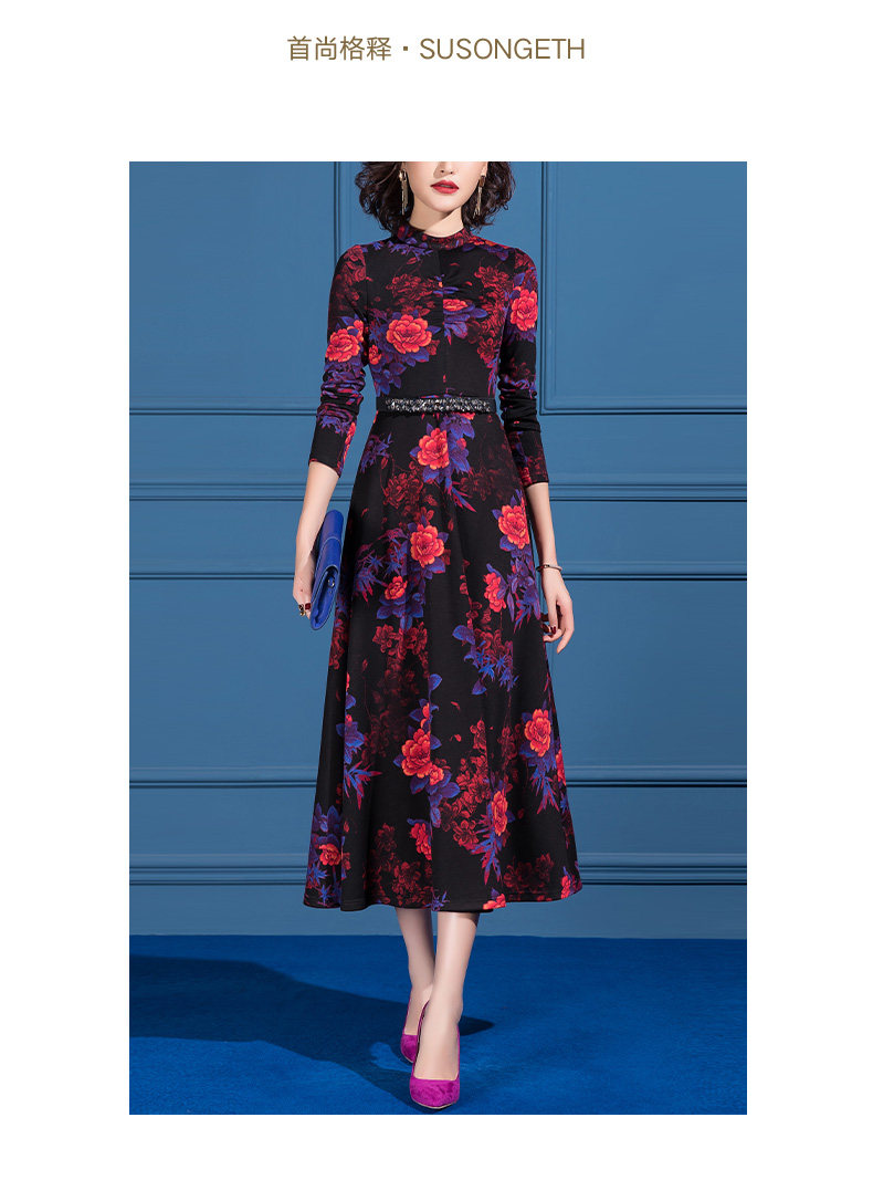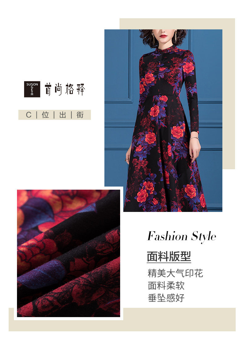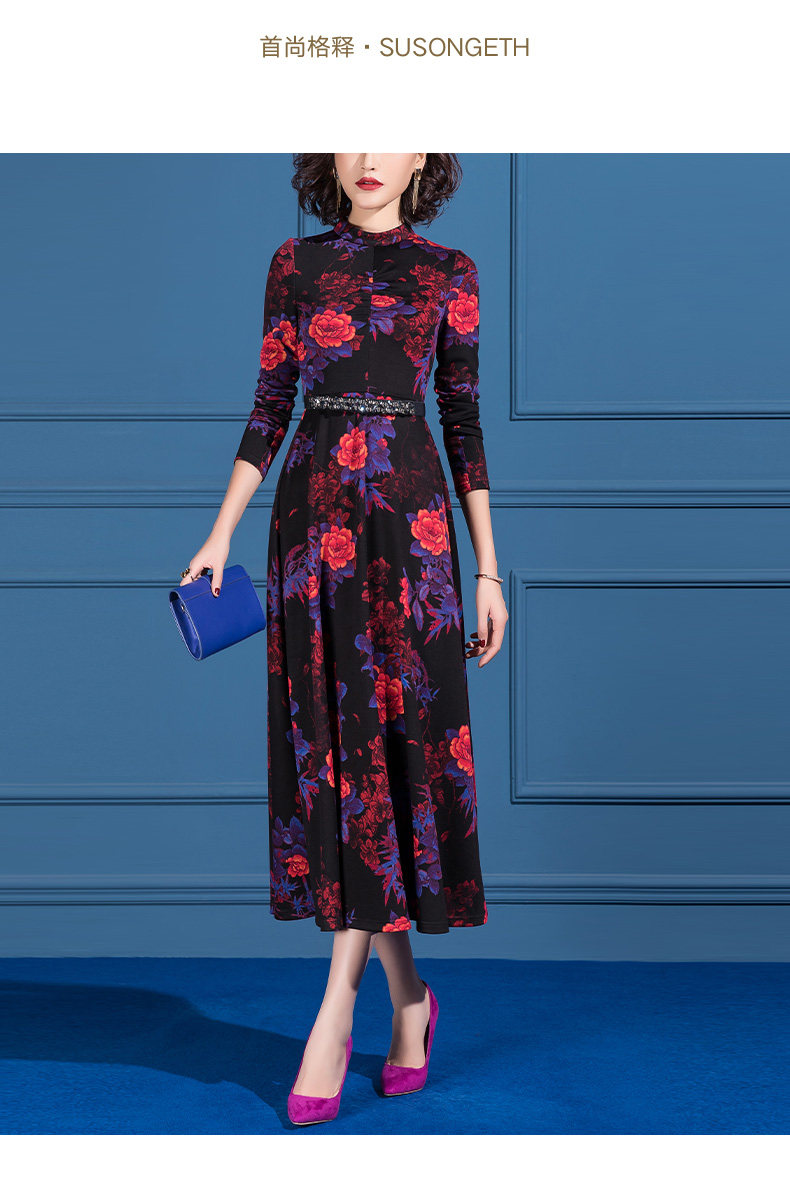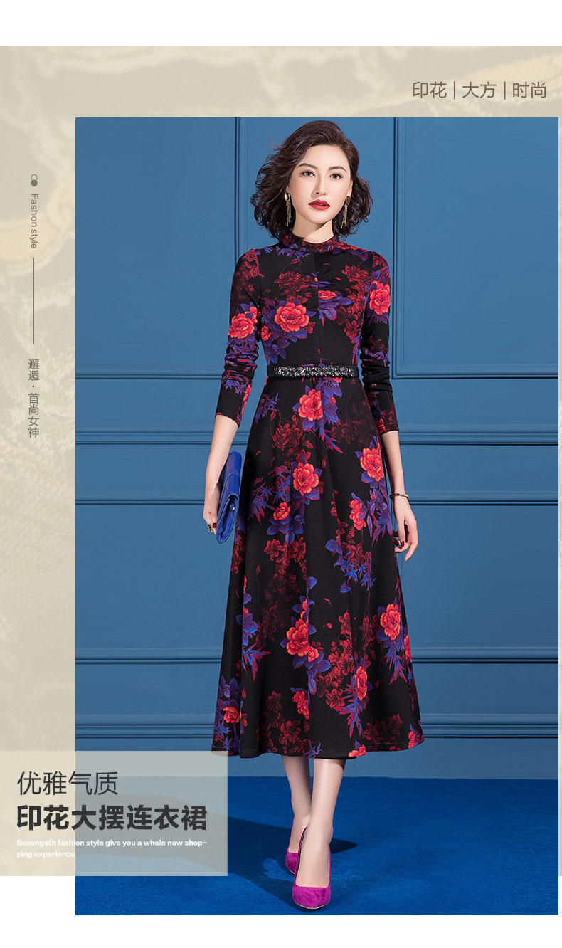 SSGS-42157长袖连衣裙秋冬中长款收腰显瘦印花A字大摆裙子
