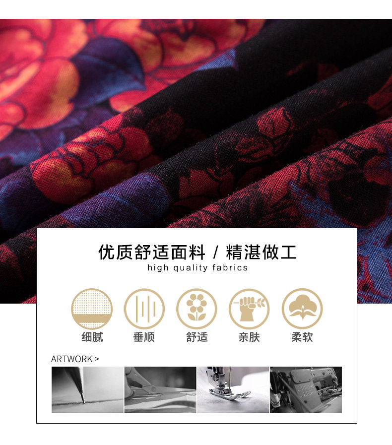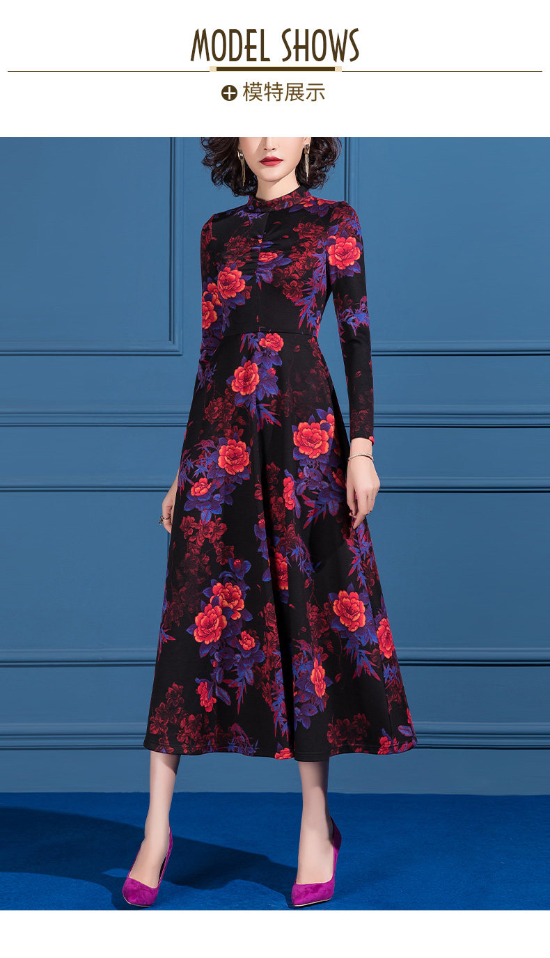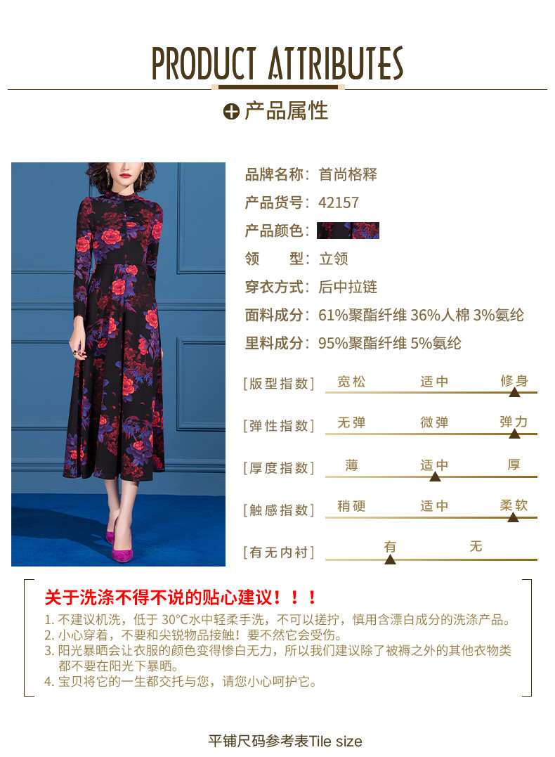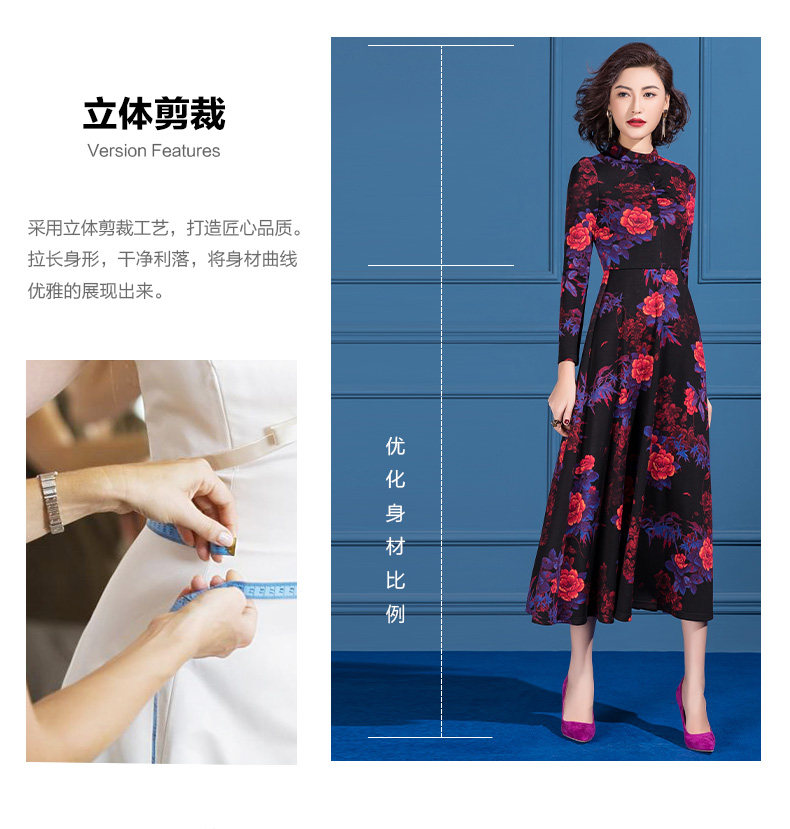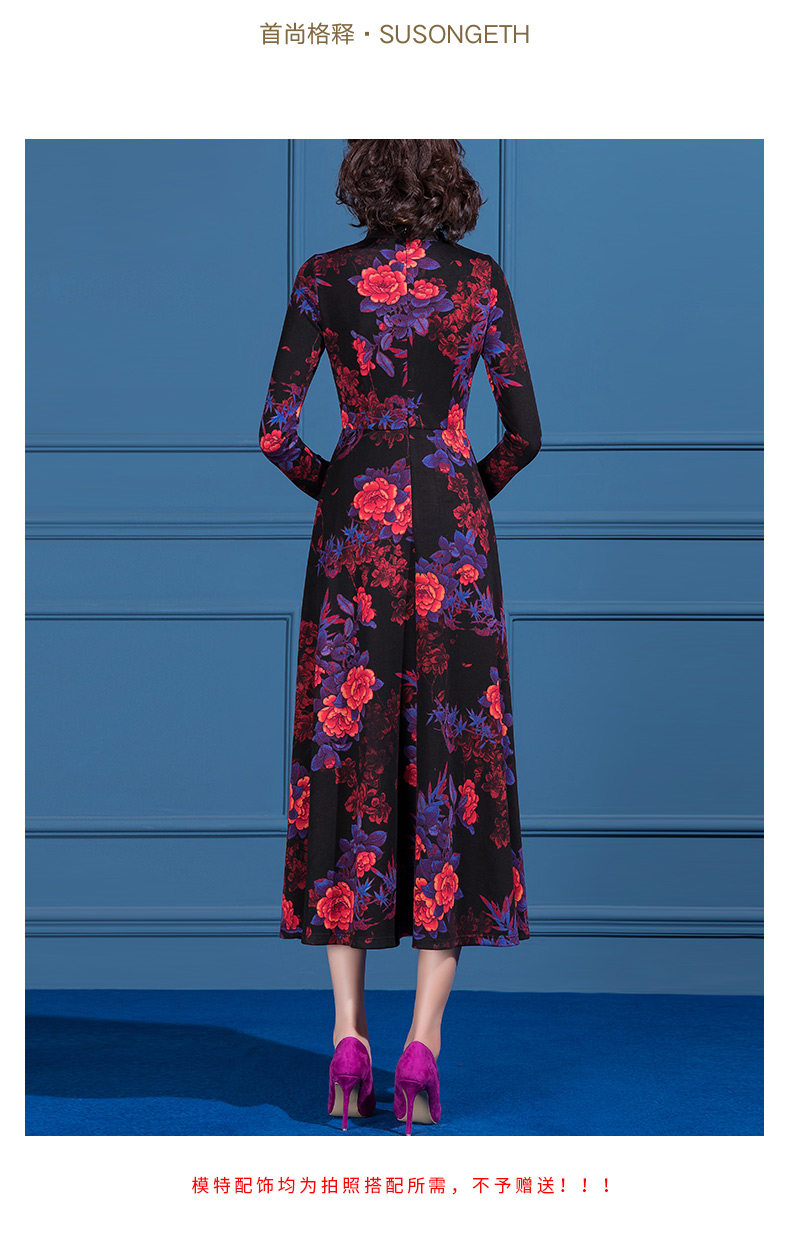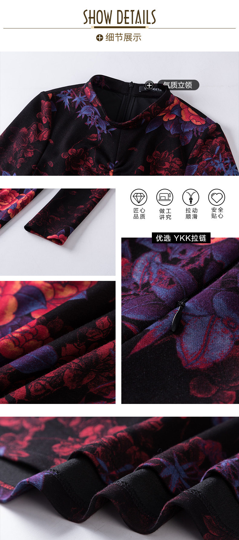 SSGS-42157长袖连衣裙秋冬中长款收腰显瘦印花A字大摆裙子