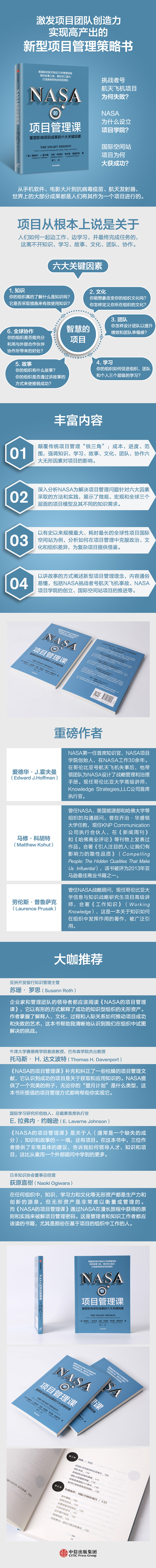 《NASA的项目管理课》补充和纠正了一些枯燥的项目管理文献,它认识到成功的项目是关于获取和应用知识的。NASA提供了一个美的例子,无论你的“登月计划”是什么类型,这本书所提倡的项目管理方式都将帮助你实现它。