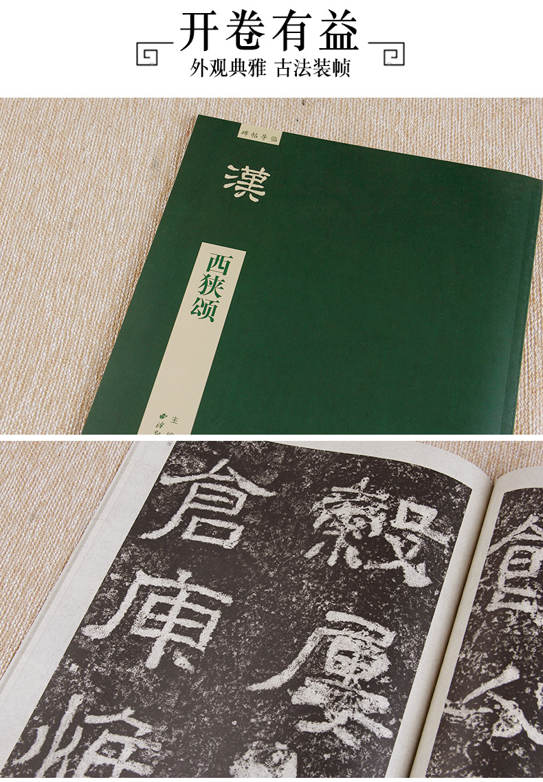 《碑帖导临:西狭颂》书法古朴方劲,刚健整饬,用笔多方笔起收,少作提按,取中锋行笔,兼参侧锋作波磔。尤其是笔画转折处外方内圆,方处棱角分明,圆处刚劲深含拗力。此碑在汉隶中具有独特的地位,其书法篆意楷形,既严劲又灵动。杨守敬评其:“方整雄伟,首尾无一缺失,尤可宝重。”徐树钧则说:“疏散俊逸,如风吹仙袂,飘飘云中,非复可以寻常蹊径探者,在汉隶中别饶意趣”。