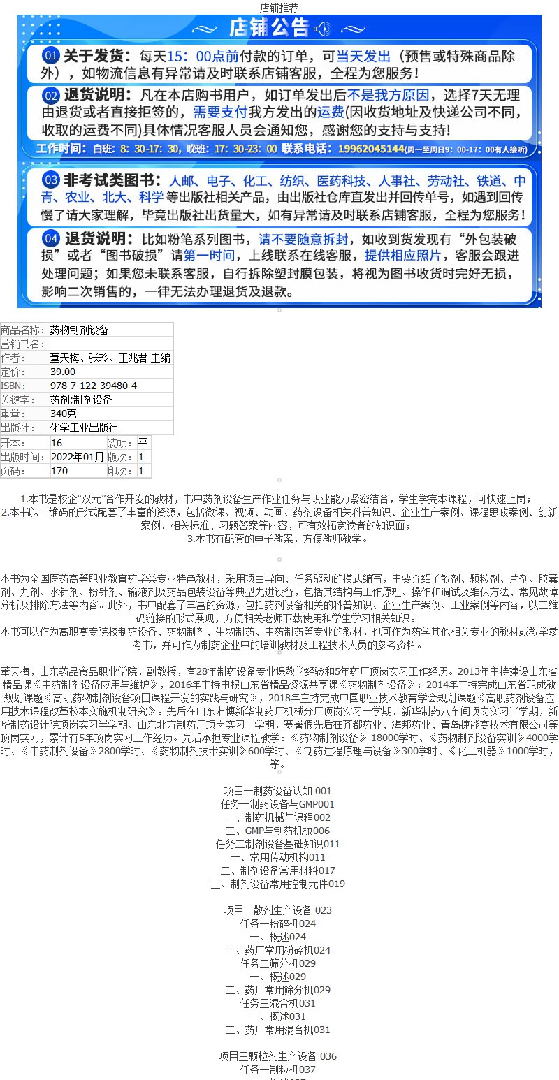 药物制剂设备 董天梅 全国医药高等职业教育药学类专业特色教材 药剂设备科普知识书籍 高职高专院校制药设备 药物制剂等专业教材 无 化学工业出版社 9787122394804