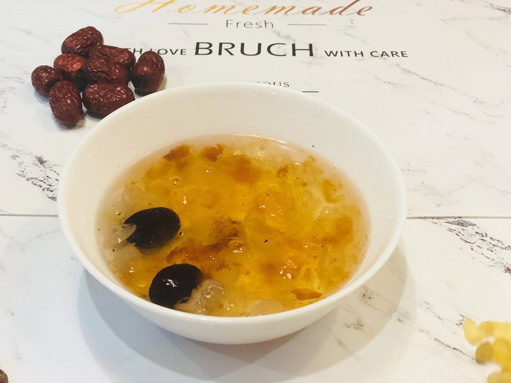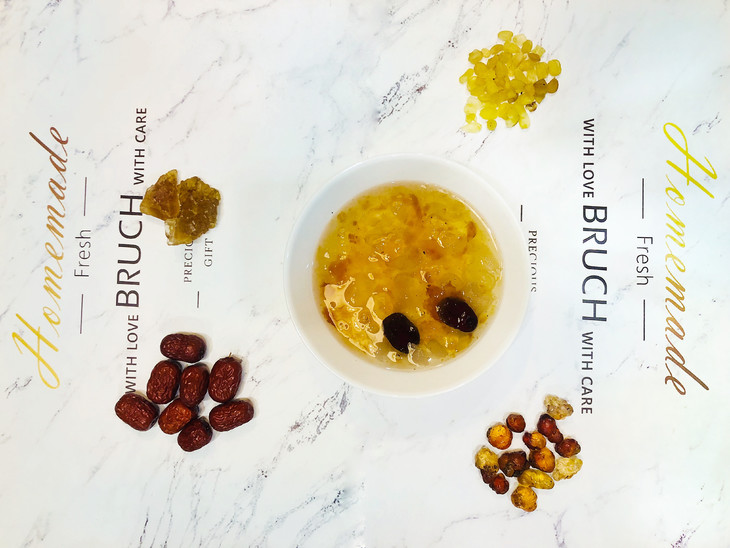 3、制做:把泡发后的桃胶、皂角米、黄金耳放入炖盅或者电饭锅,加入10-15倍的水,冰糖少许,盖上盖子,大火后小火(电饭锅直接选煲汤煮粥功能),大约25-30分钟即可。软糯的胶原蛋白就可以出锅了。