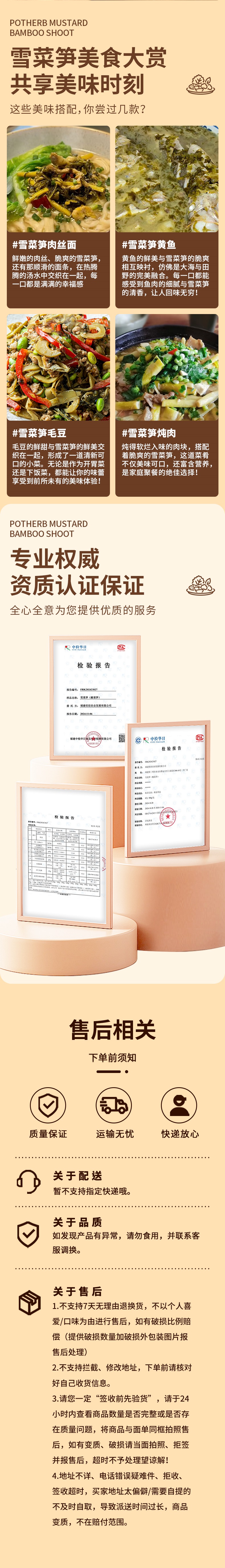 品名:竹帮主雪菜笋 规格:188g/袋*5袋;拍几份发几个包裹,不一定能同时到达,请耐心等待 发货地/产地:三明 包装方式:装装 保质期:10个月 物流信息:默认中通快递,不支持指定快递 发货区域:新疆、西藏、青海不发;内蒙、甘肃、宁夏、北京、上海、深圳+1元; 物流详情:周六、周日及节假日除外,正常48小时内发货,到货时间约为2~5天,请耐心等待 售后说明:收到货后有质量问题,在24小时内都可以拍照(坏果+快递单面箱子一起拍)上传,申请按坏果比例理赔或联系客服,生鲜性质特殊,因地址错误,手机号联系不上,拒收等造成的损失无法售后,请理解; |
