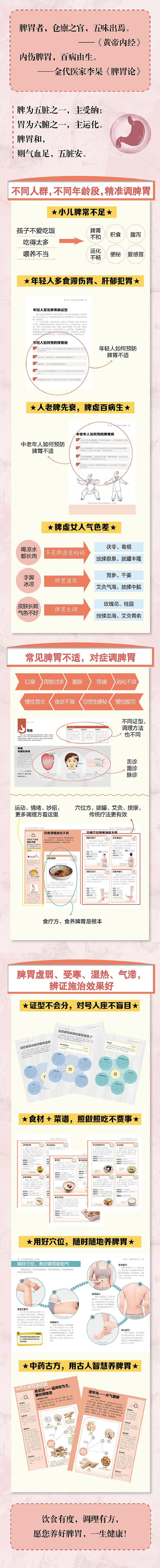 脾胃是气血生化之源。脾胃好,人体自然也会健康。 由于工作和生活压力大、饮食不规律、经常熬夜等原因,越来越多的人出现了脾胃问题。本书针对不同人群和不同病症给出相应的食疗方、穴位方、运动方。针对脾胃虚弱、脾胃湿热、脾胃受寒、脾胃气滞四大类脾胃问题进行了具体的阐述,并给出了行之有效的解决方案,是一本全家受益的养胃书。