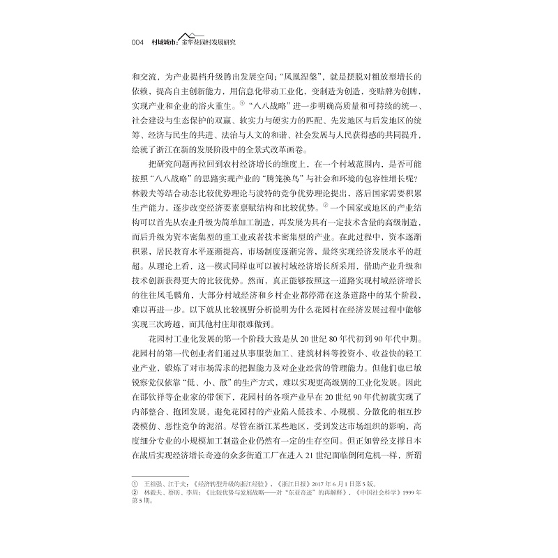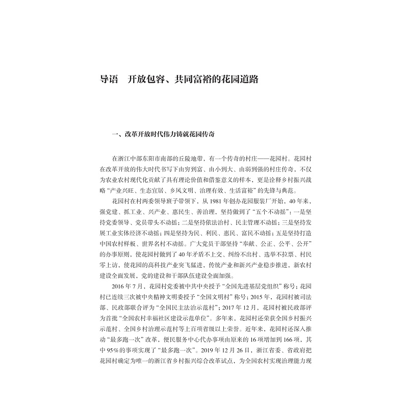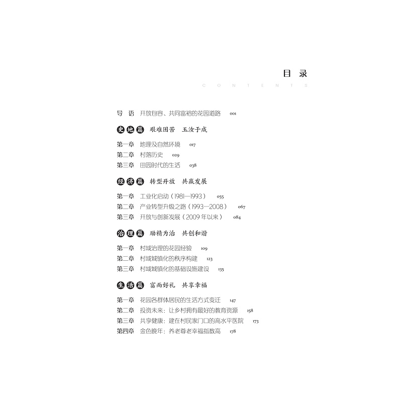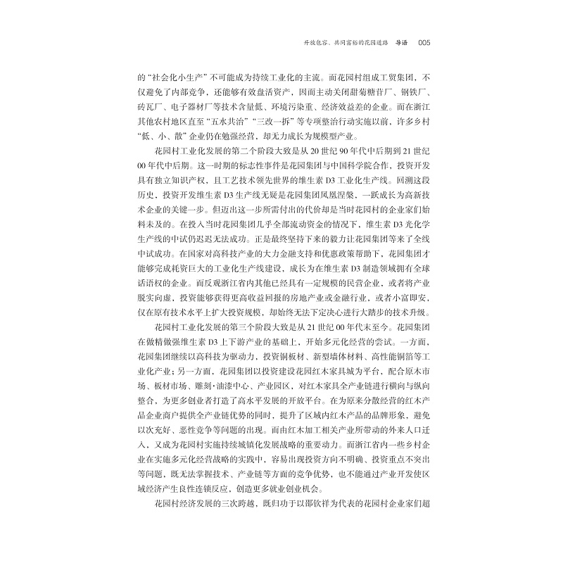 本书系“中国村庄发展的浙江样本研究丛书”之一。本书以改革开放进程中“明星村庄”的发生发展逻辑为研究线索,创新提出传统农业村庄如何就地进行城镇化发展,进而成为具有一定经济社会辐射力的城镇的研究问题。通过村庄改革开放前历史地理基础、产业升级路径、社会治理经验、公共福利提升、精神文明建设等全景式历史资料呈现,提炼东阳花园村的改革发展经验,为部分具有发展基础的中国村庄健康可持续推进城镇化提供样本。本书以宏大的历史站位、深刻的分析视角,将花园村成功推进工业化、城镇化的历程与经验呈现于读者,采取文献资料、人物访谈与现场观察相互印证的研究策略,尽可能还原真实历史,在梳理村庄发展历史脉络的同时,保留了一部分具有人文关照的历史细节,达成既看得见历史,也看得见人物的效果。