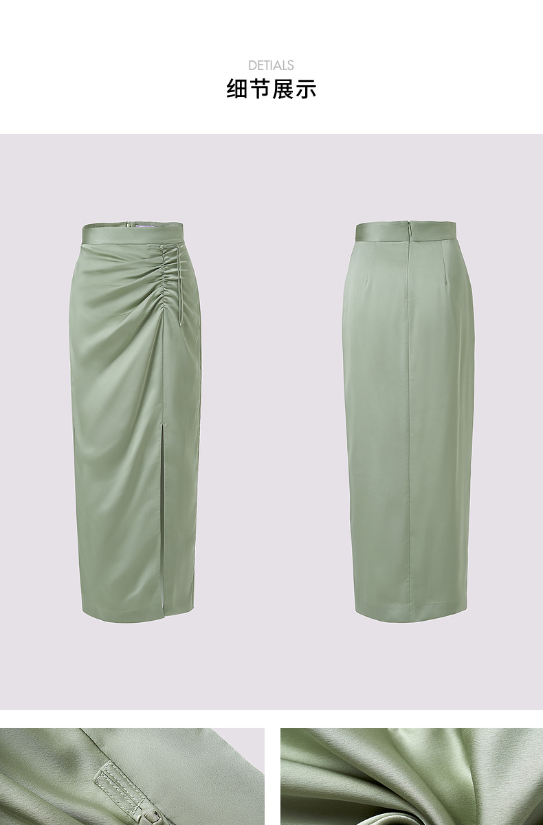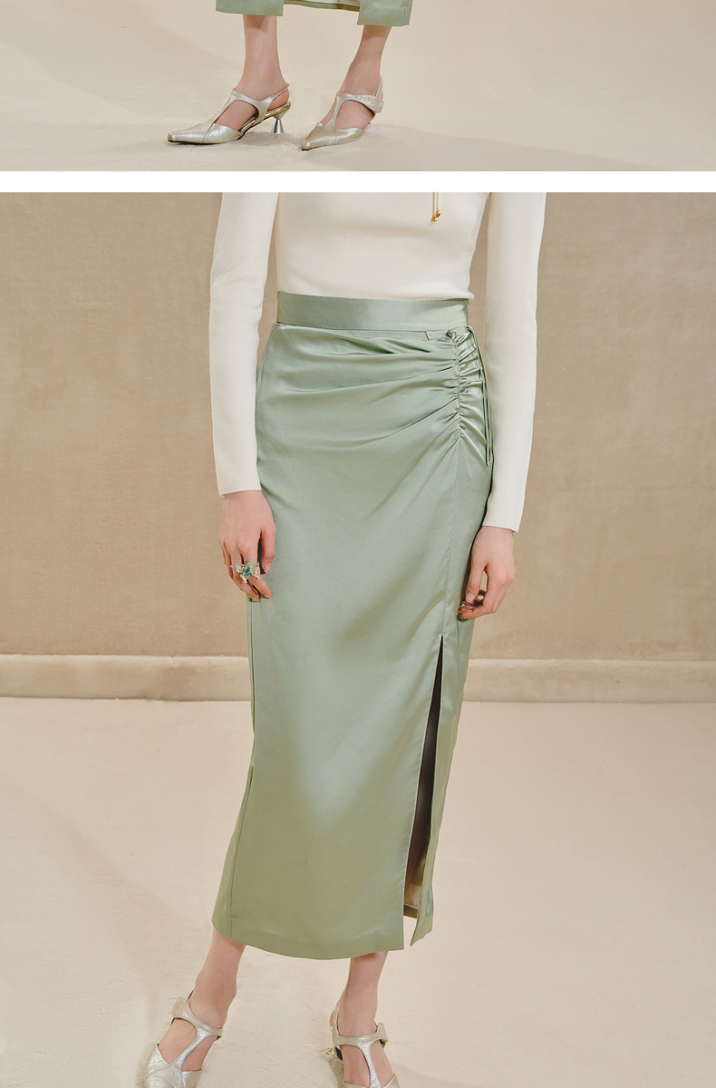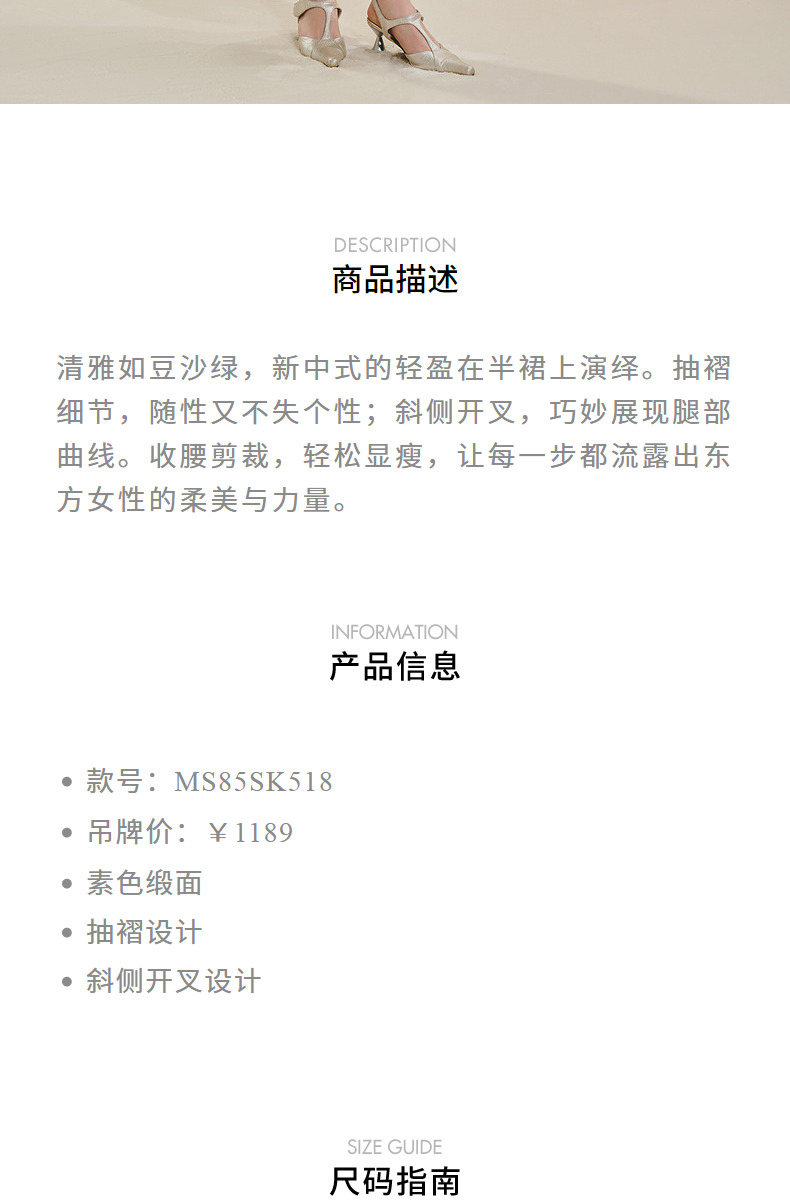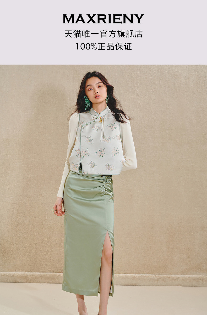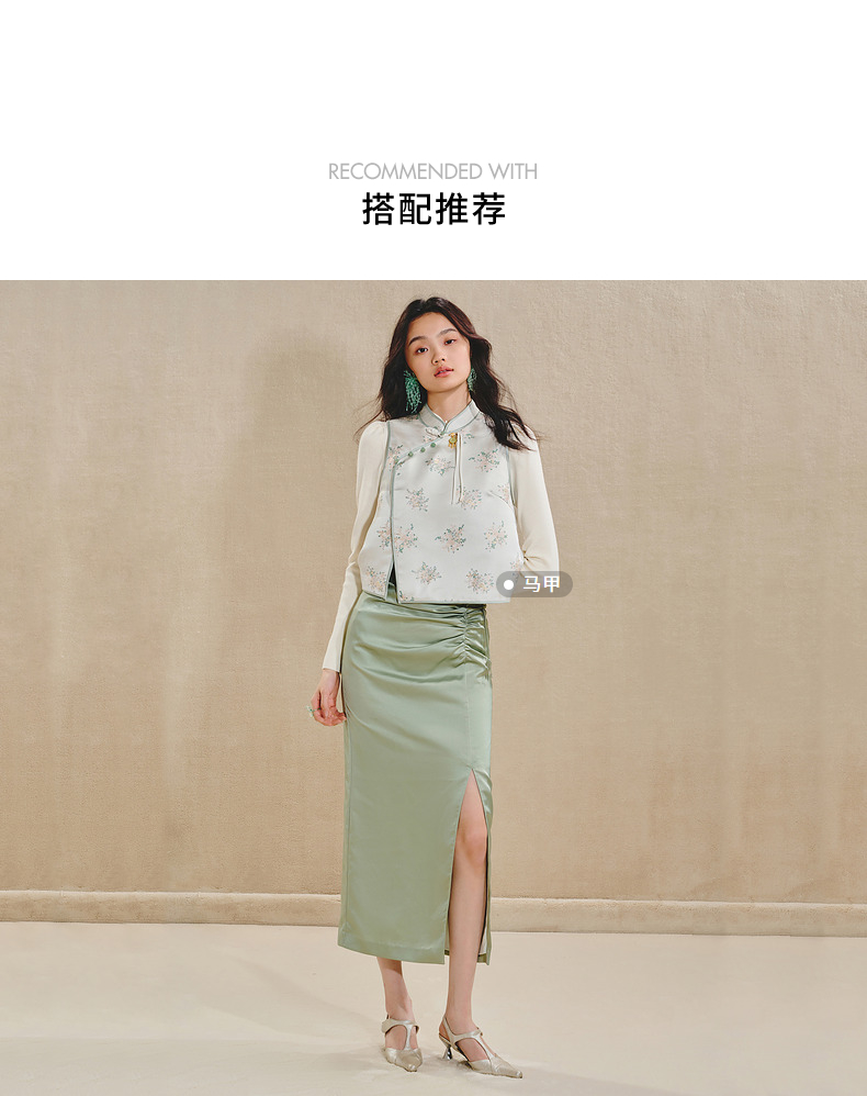 MAXRIENY清雅新中式半裙2024秋冬新款抽褶优雅开叉高腰长裙(货号:MS85SK518)