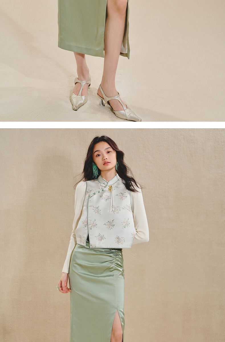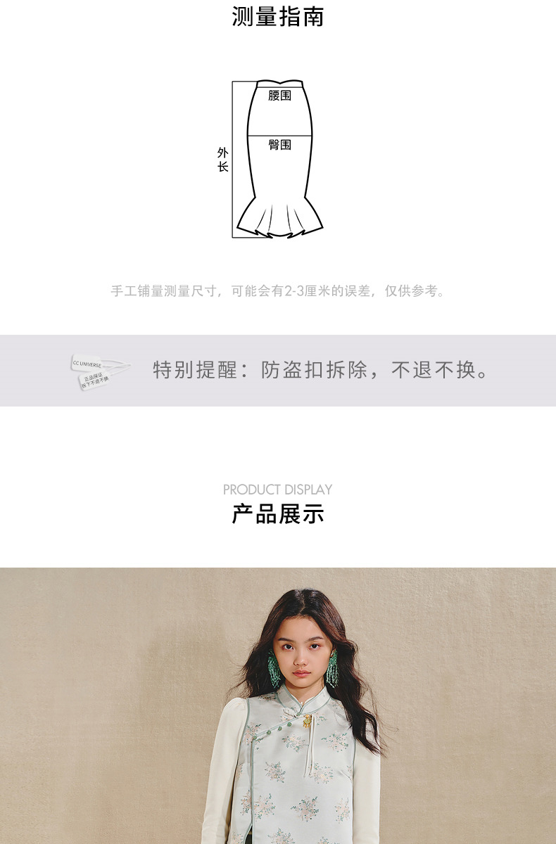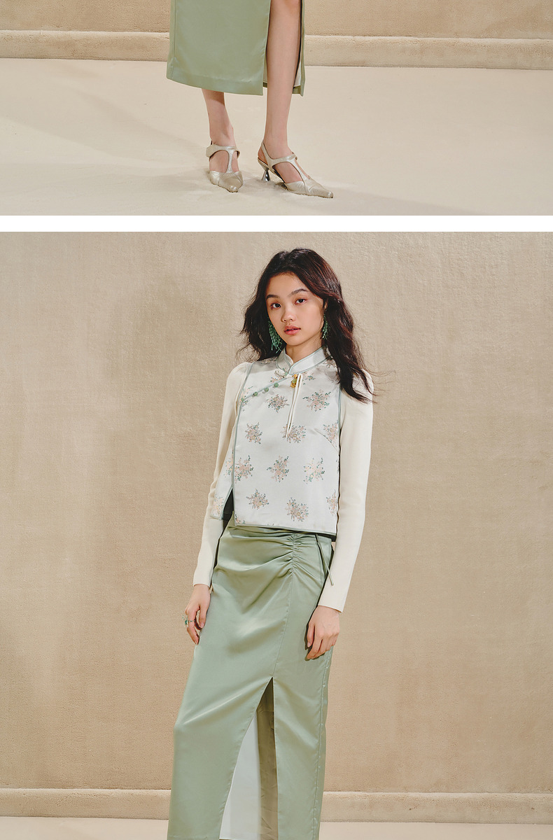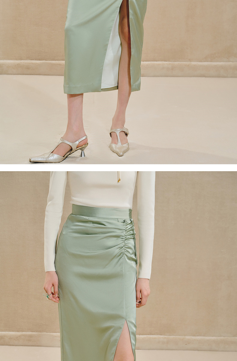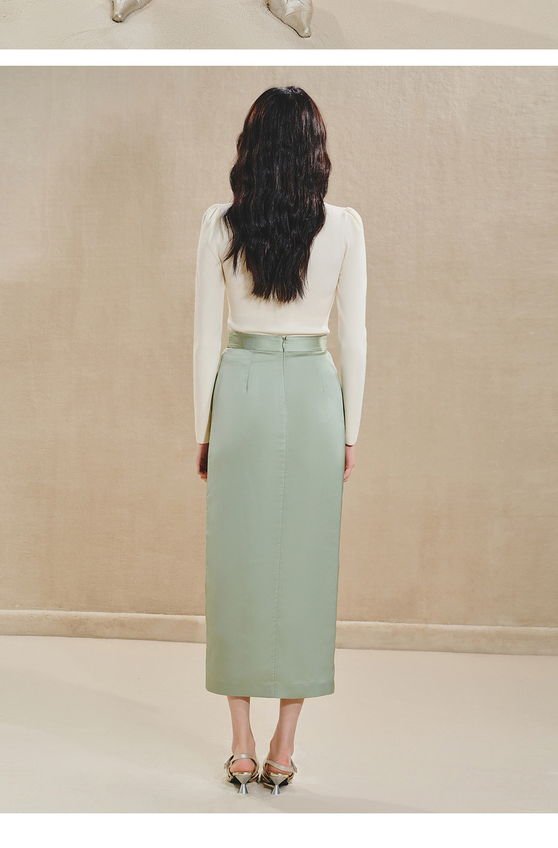 MAXRIENY清雅新中式半裙2024秋冬新款抽褶优雅开叉高腰长裙(货号:MS85SK518)
