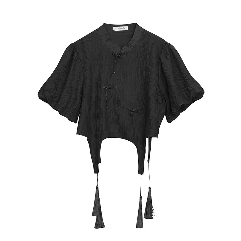 超值购【诗铭洛可】W998国风上衣流苏盘扣压皱短袖小衫A12-2