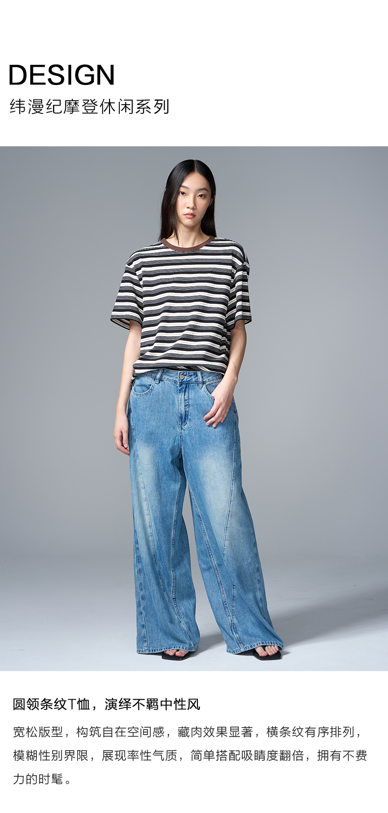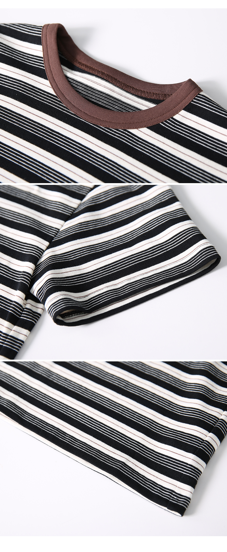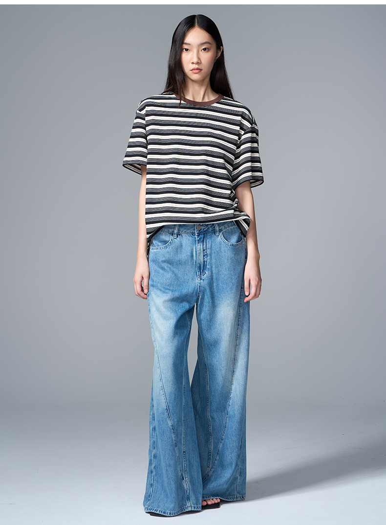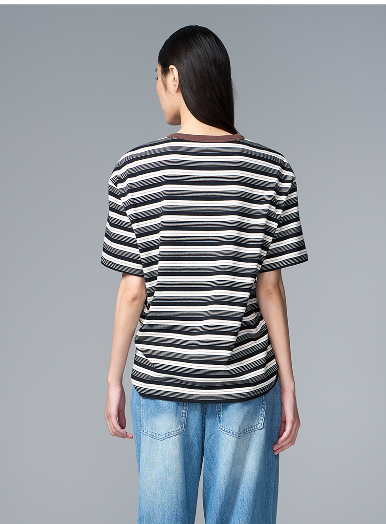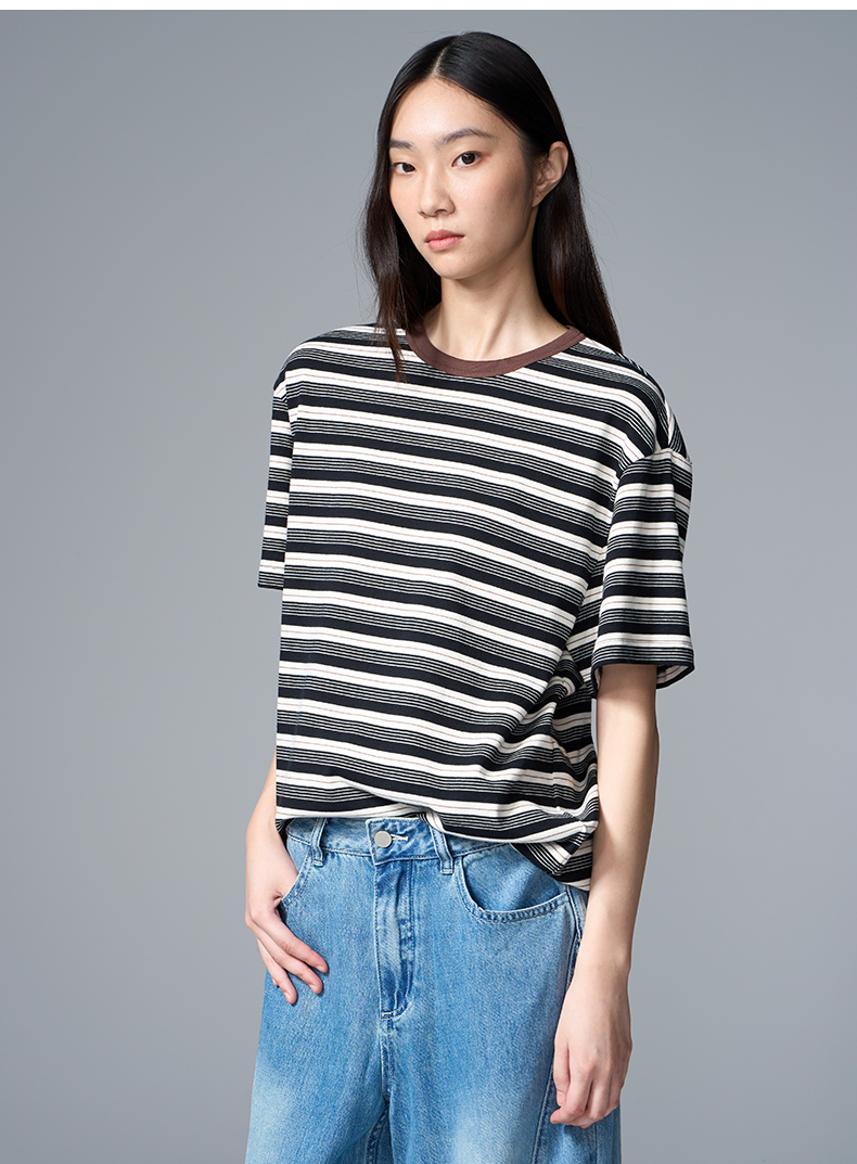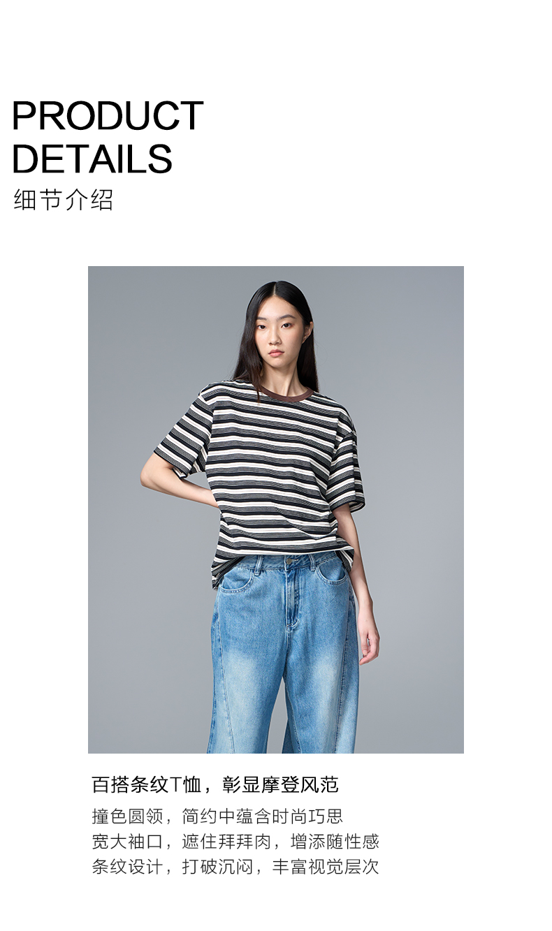 VIMAGE纬漫纪纯棉圆领复古百搭宽松撞色条纹t恤上衣2025夏季新款V2302922