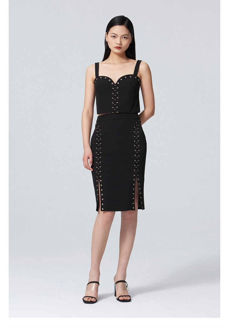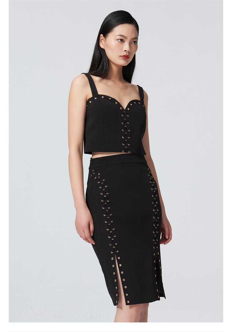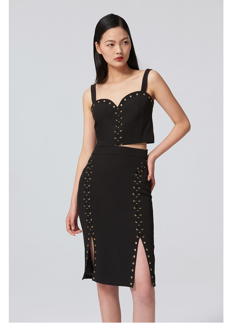 【桃乐茜】气眼绑带设计开叉黑色修身半裙/00090A
