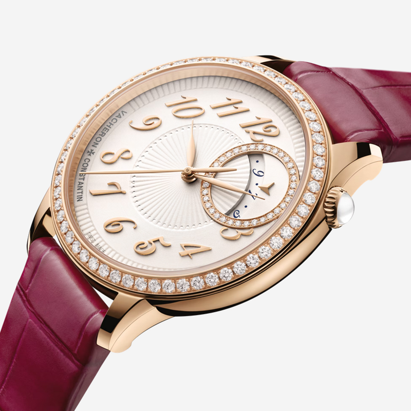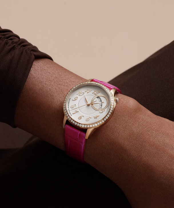 镜面材质 | 蓝宝石水晶玻璃 | 表盘 | 18K 5N粉红金表壳,表圈镶嵌58颗圆形切割钻石 表冠一颗弧形切割月光石,1点与2点间日期显示盘的圆环外圈缀有34颗圆形切割钻石 |