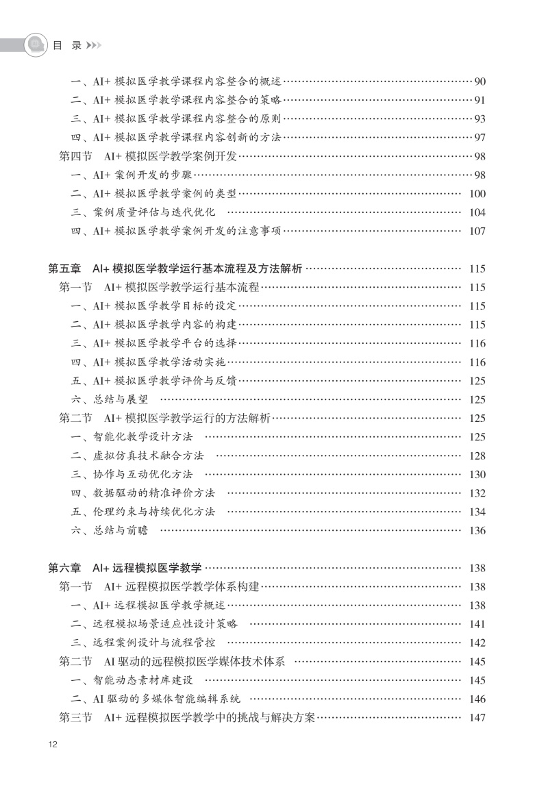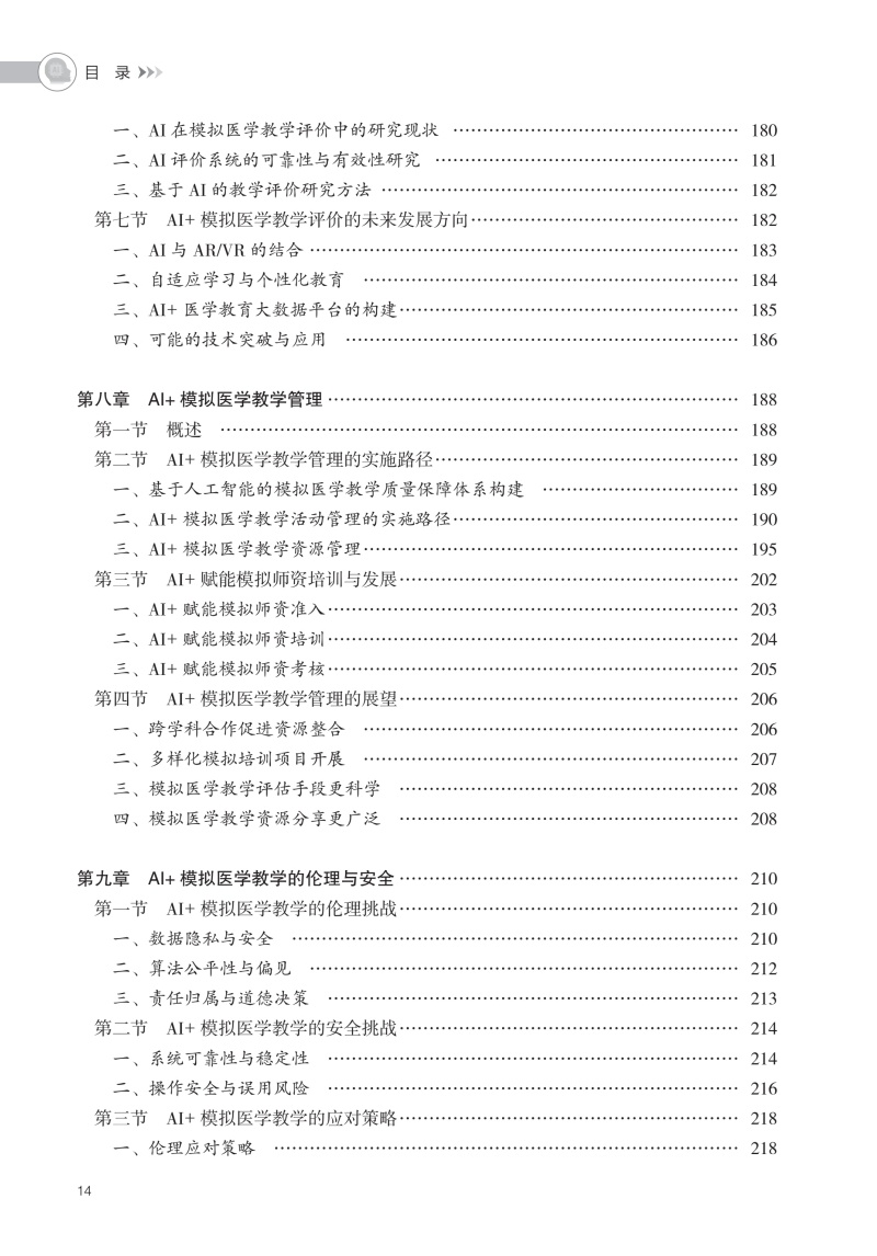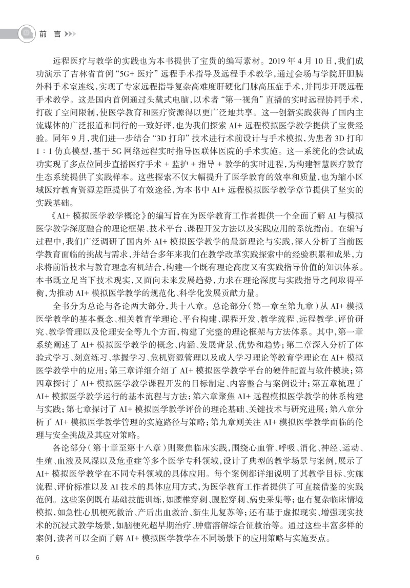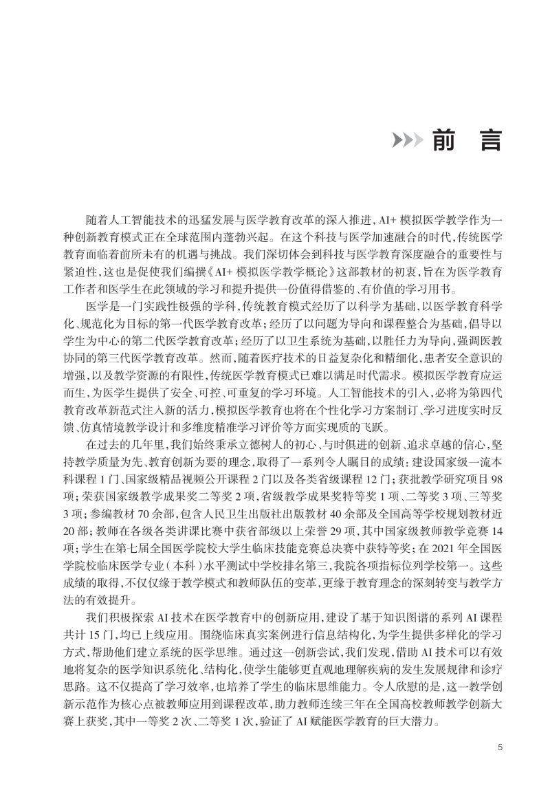 当前,AI技术迅猛发展并逐步渗透进医学教育领域,尤其是与模拟医学教学结合,正重塑着医学教育模式。全书分为9章,详细介绍AI+模拟教学工具与方法,内容包括:AI+模拟医学教学基础理论;AI+模拟医学教学相关教育学理论;AI+模拟教学平台构建;AI+模拟医学教学课程开发;AI+模拟医学教学课、AI+模拟医学教学运行基本方法与流程;AI+远程模拟教学;AI+模拟医学教学评价与研究;AI+模拟医学教学管理;人体各器官系统的AI+模拟教学应用场景。