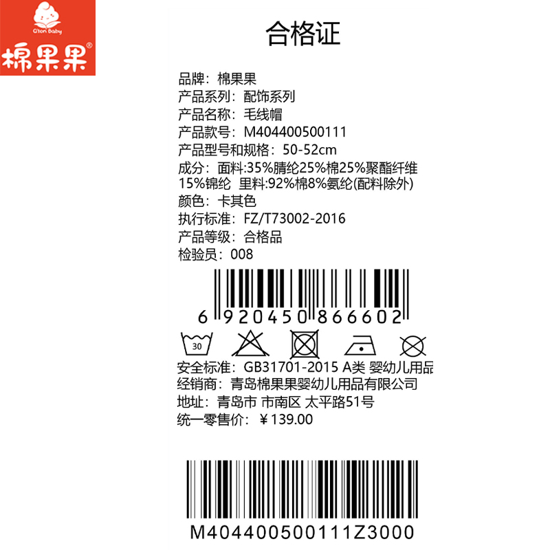 棉果果冬季新品男童可爱柔软保暖毛线帽M404400500111