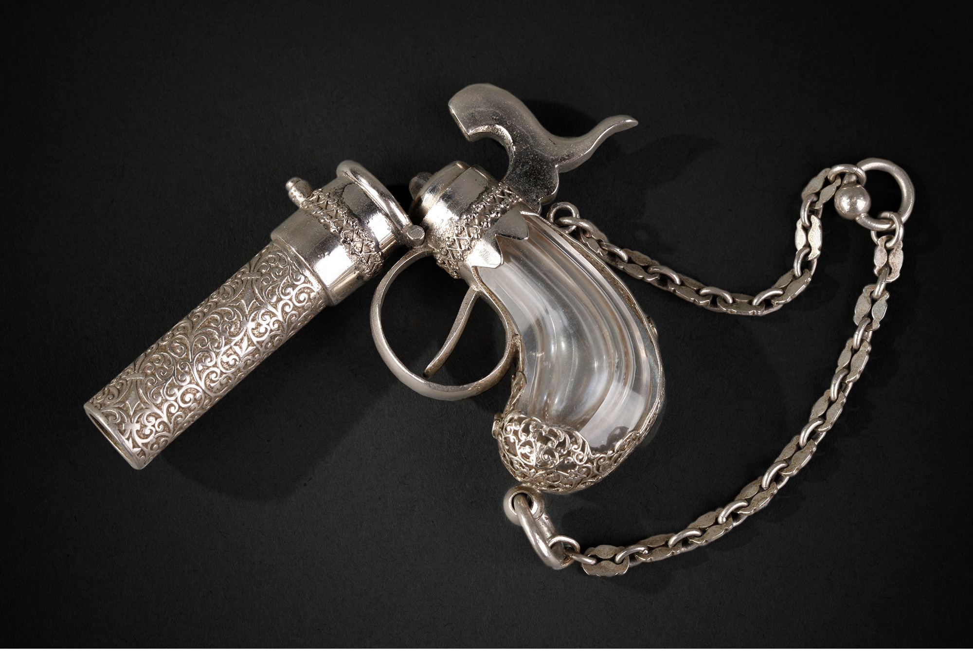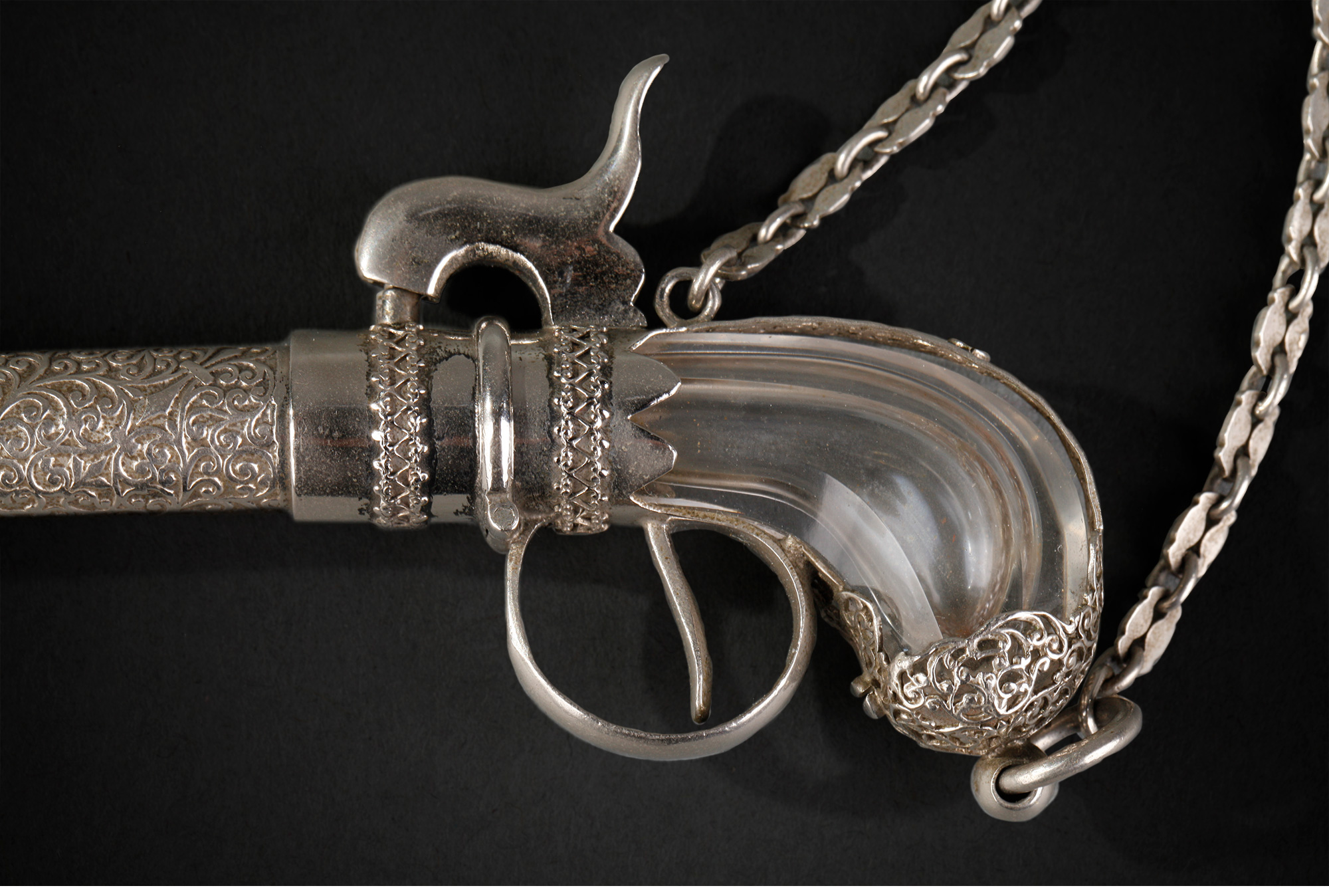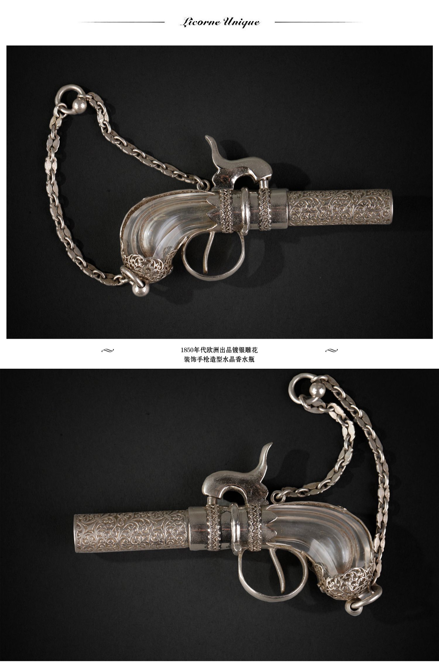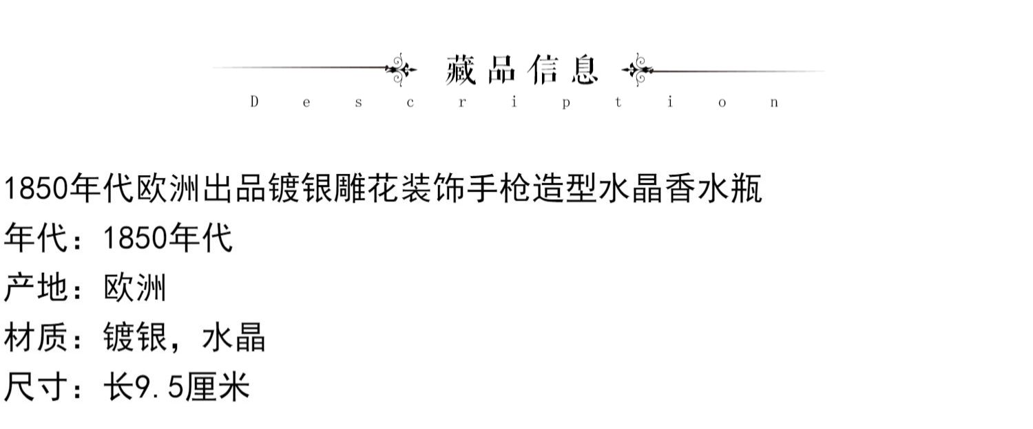 独角鹿西洋古董欧洲镀银雕花手枪造型水晶香水瓶