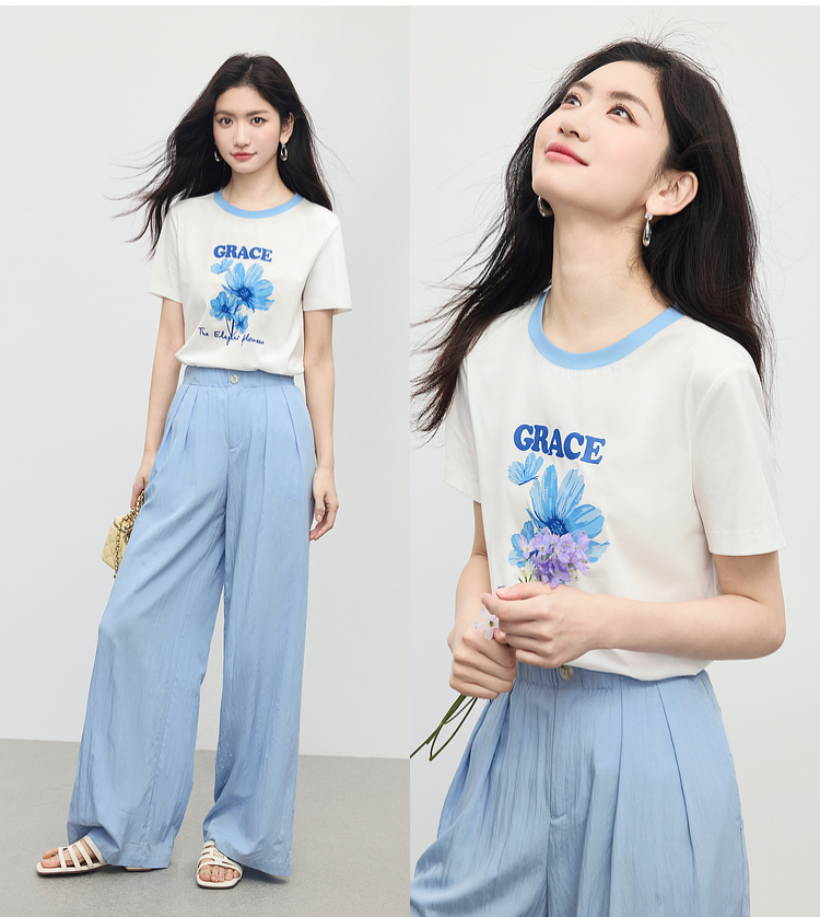 【专属特价】熙世界油画感印花T恤短袖女夏季新款休闲复古文艺风撞色圆领上衣
