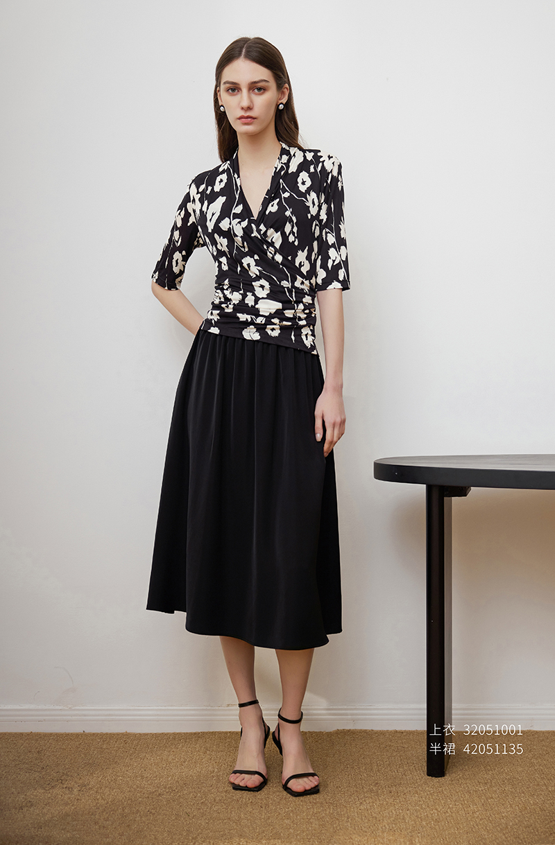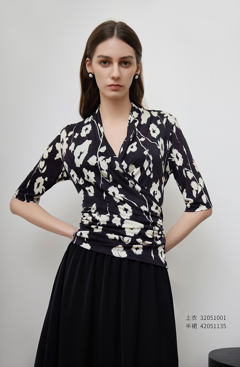 【V领真丝印花T恤】春夏新品女士100%桑蚕丝V领印花上衣