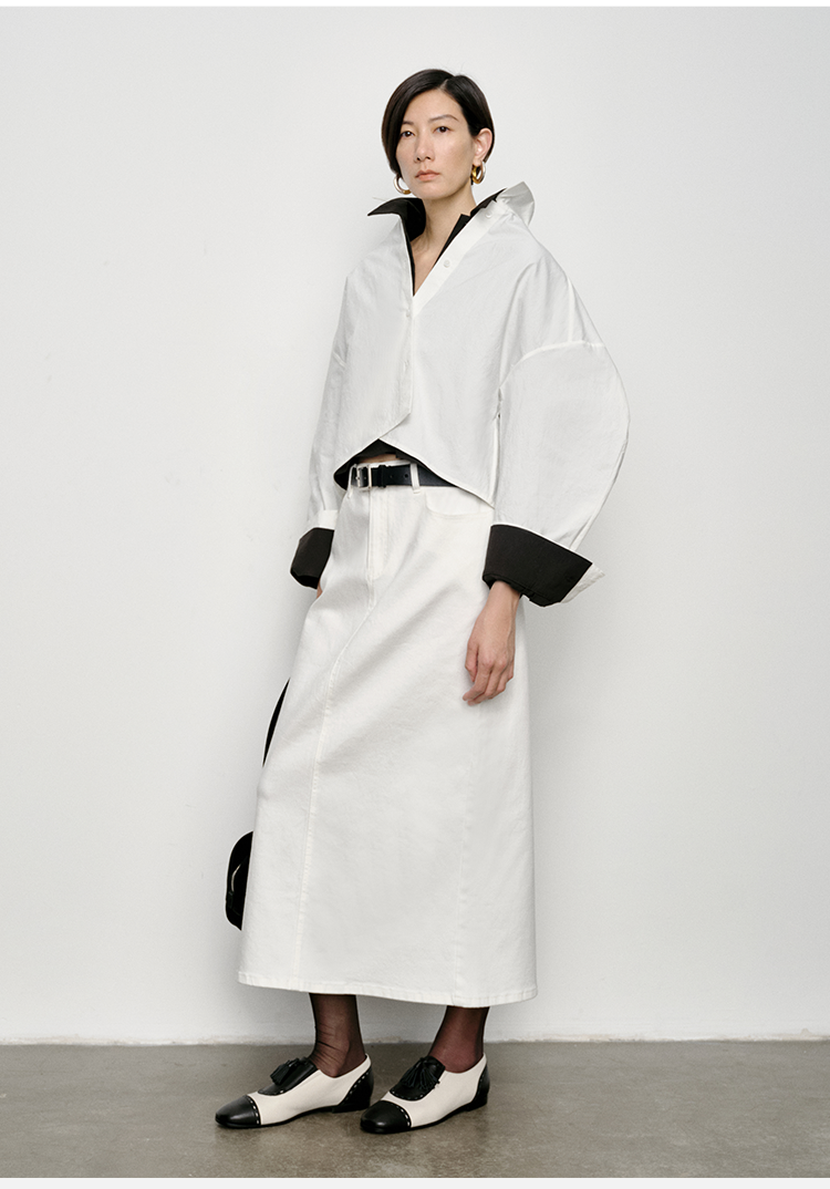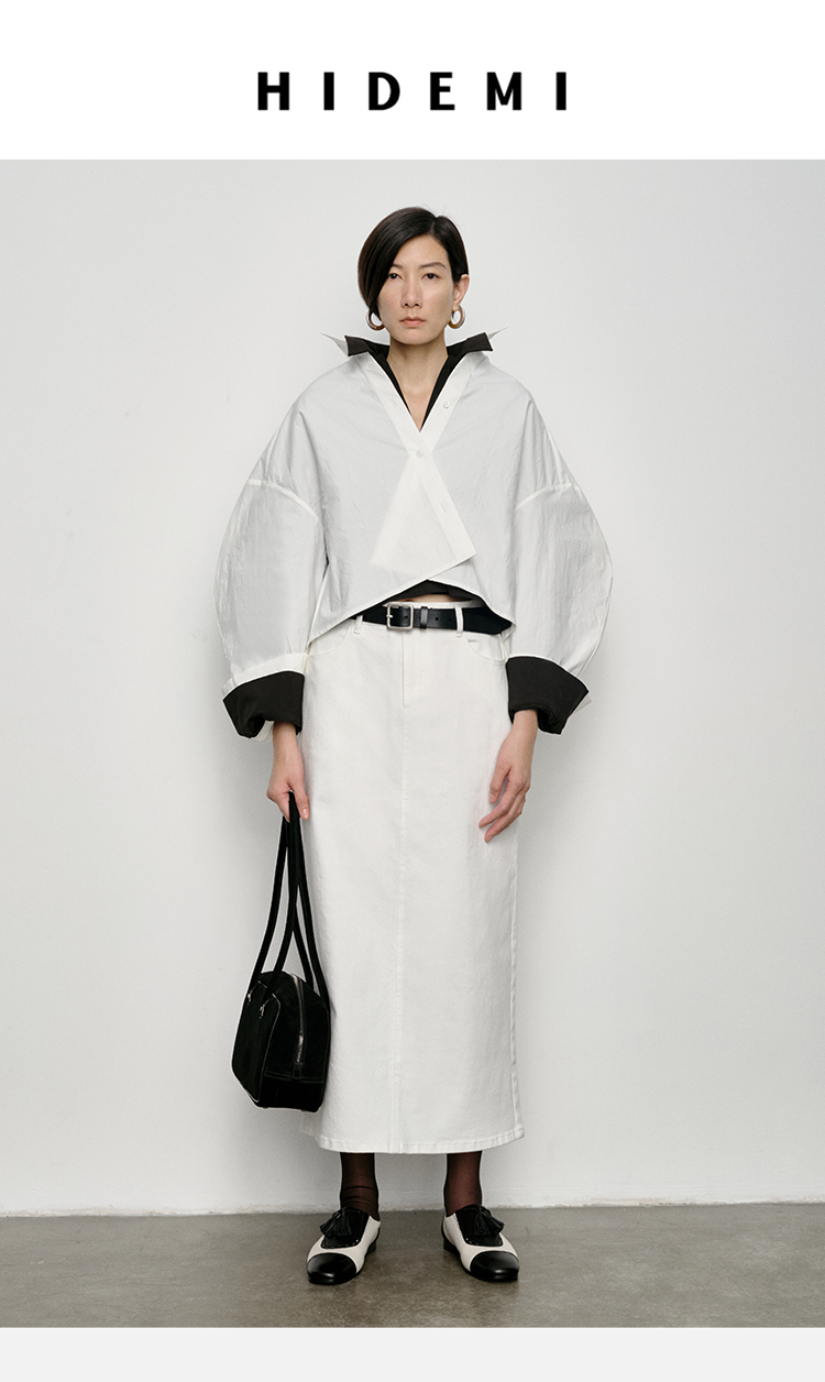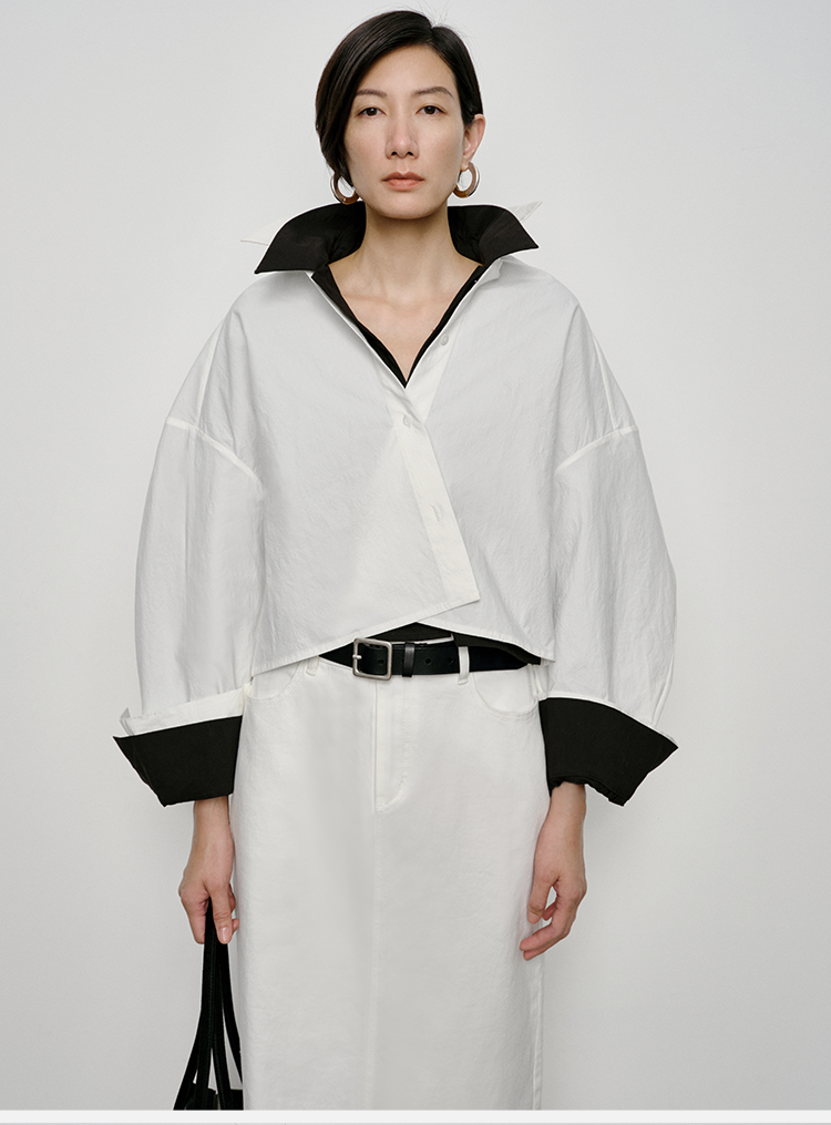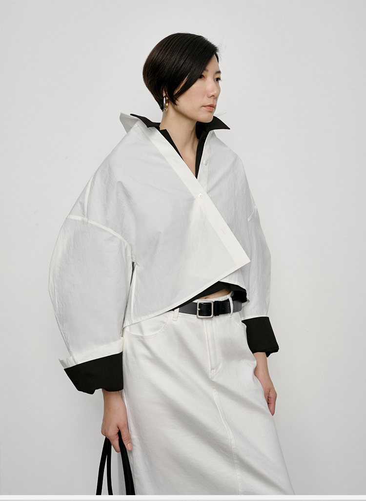 HIDEMI 特殊工艺纸感微浮雕艺术面料极简大廓形袖衬衫 都市白/黑色
