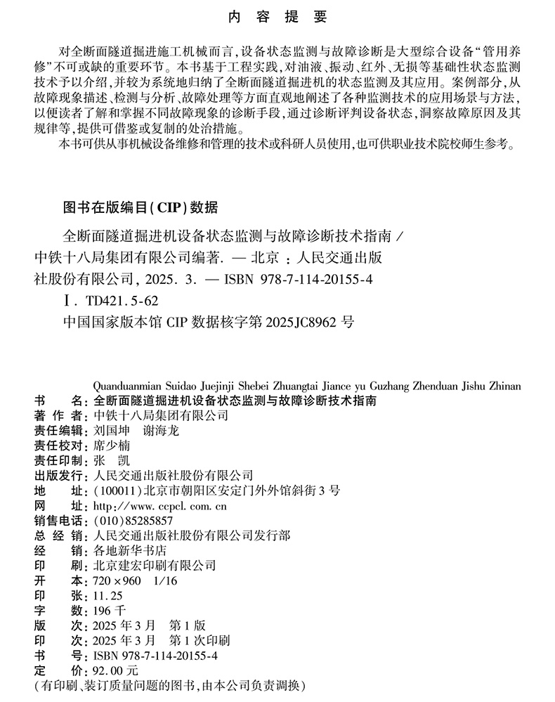 书名:全断面隧道掘进机设备状态监测与故障诊断技术指南