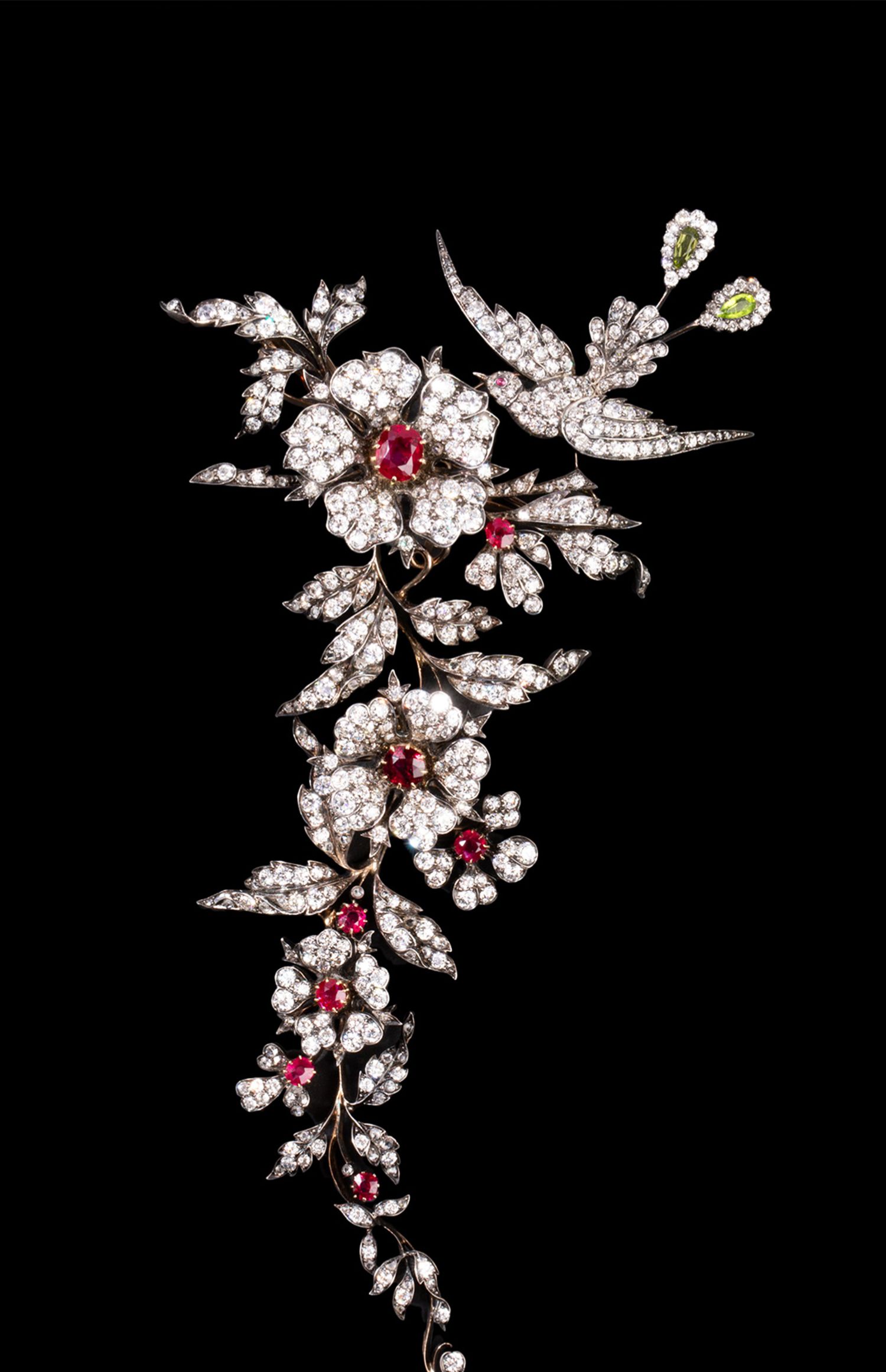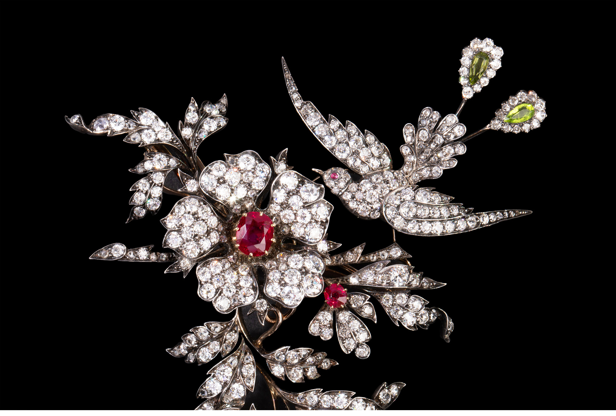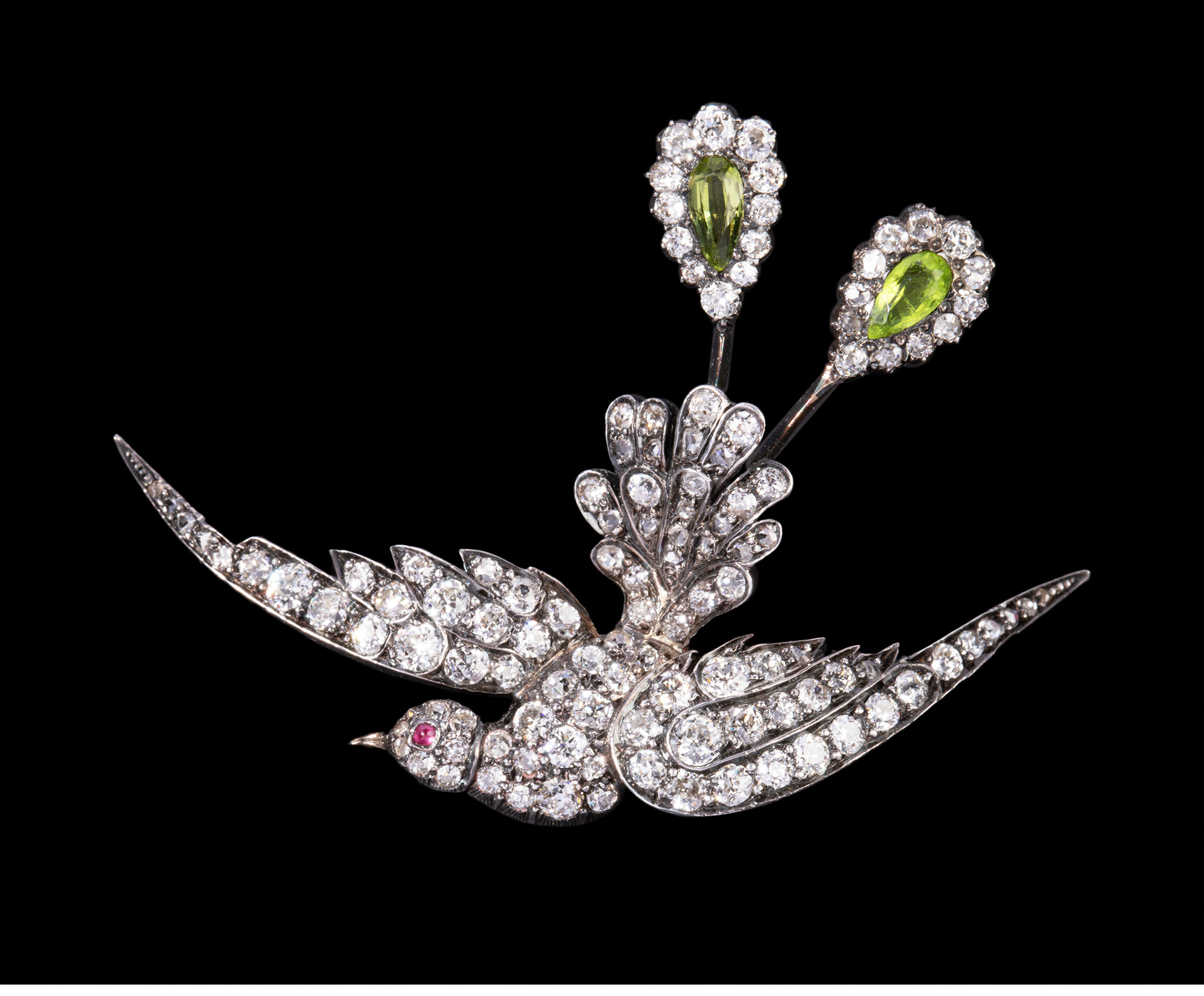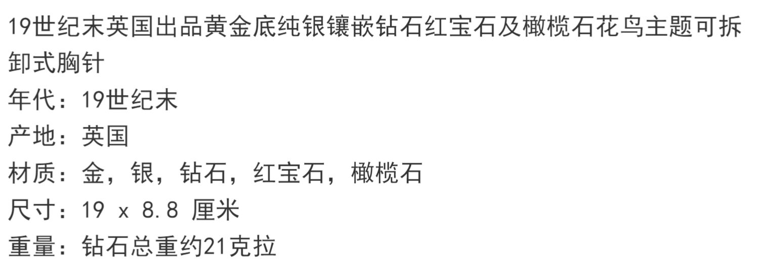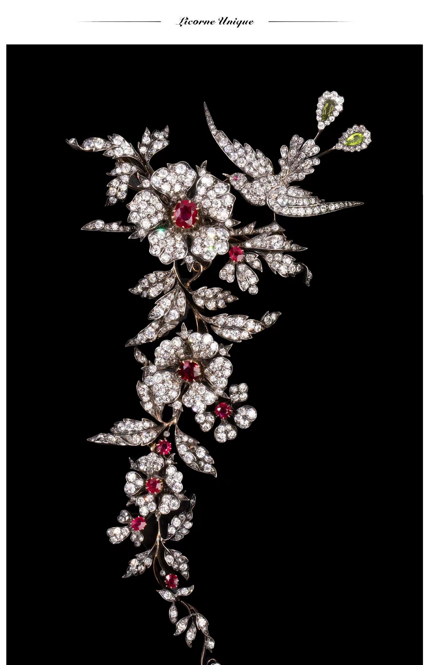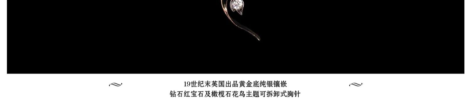 独角鹿西洋古董珠宝黄金纯银镶钻石红宝石橄榄石花鸟可拆卸胸针