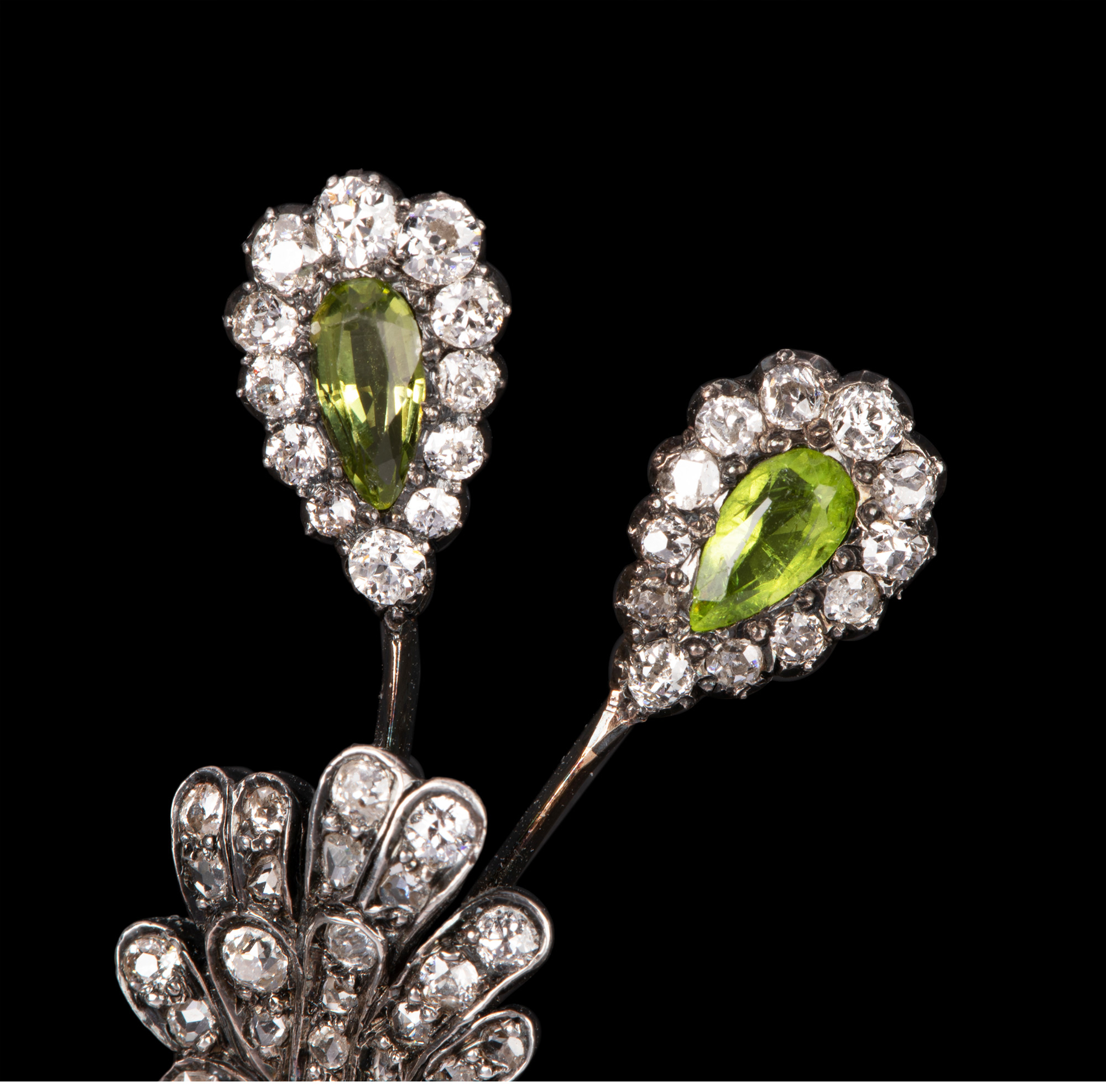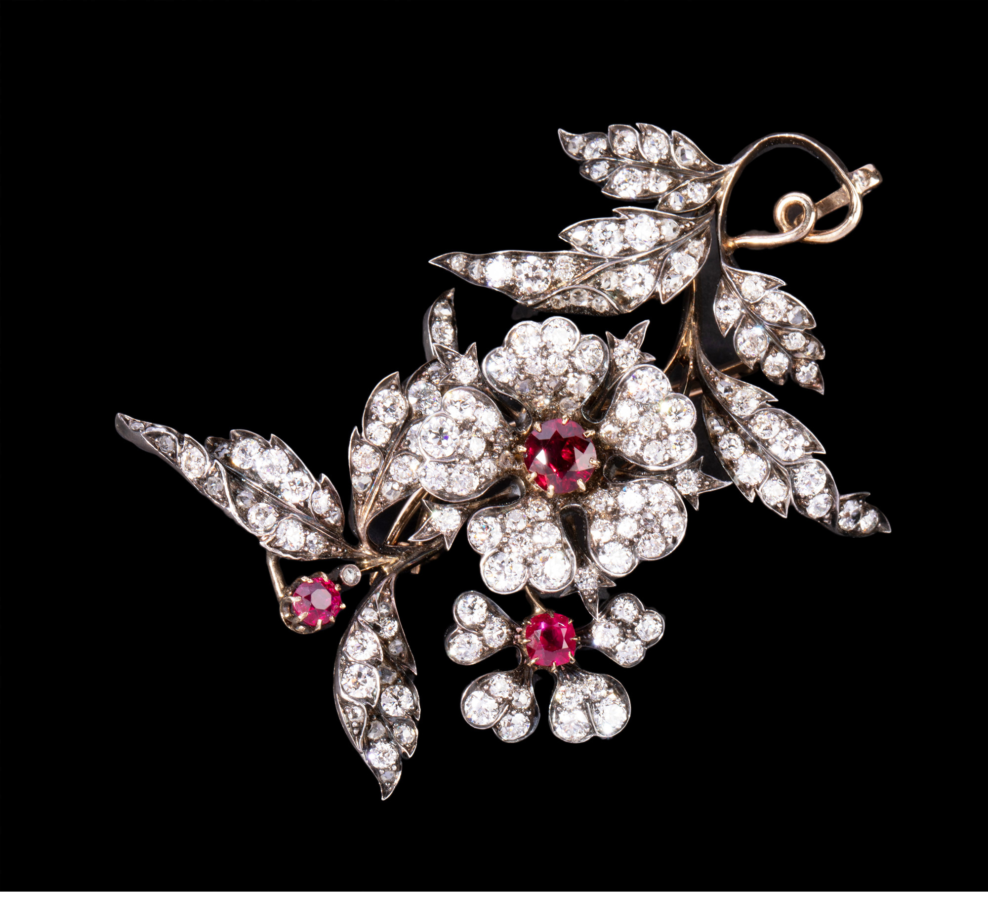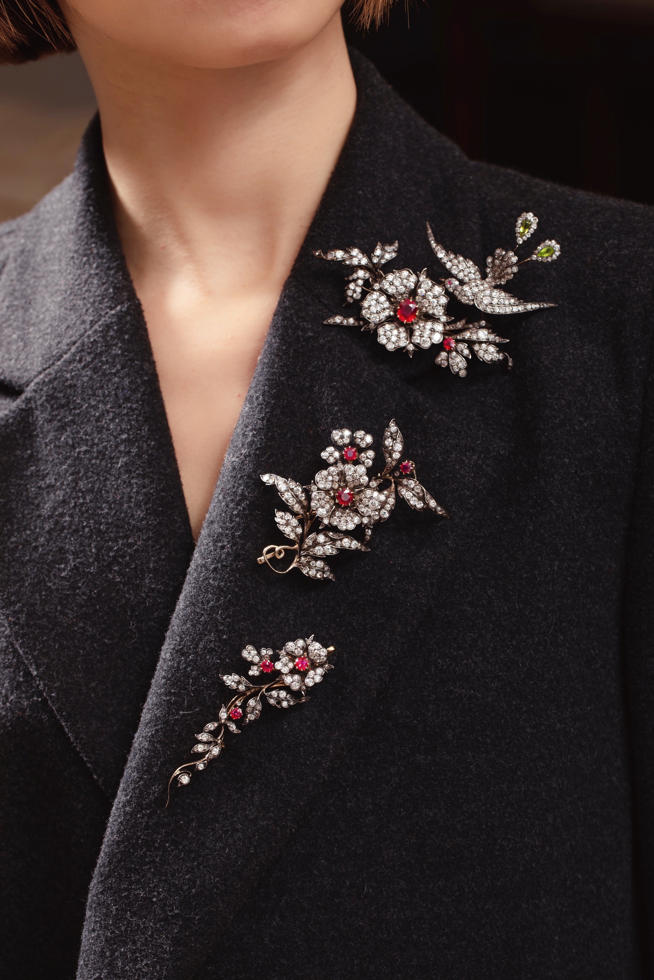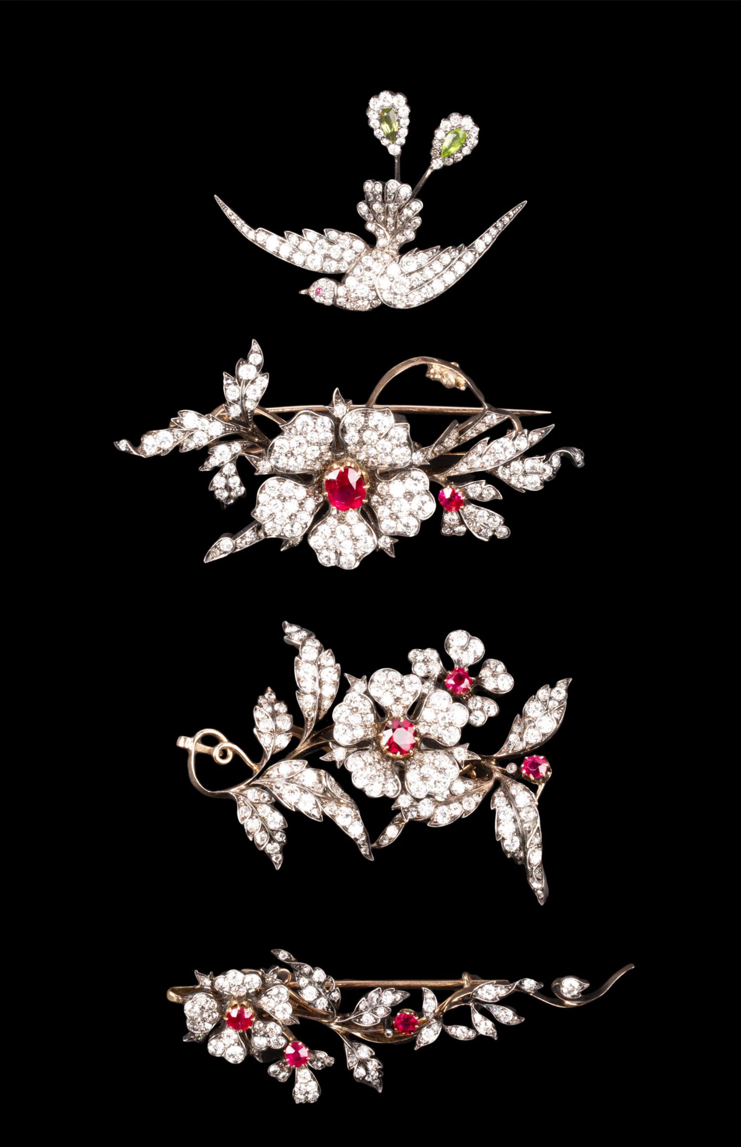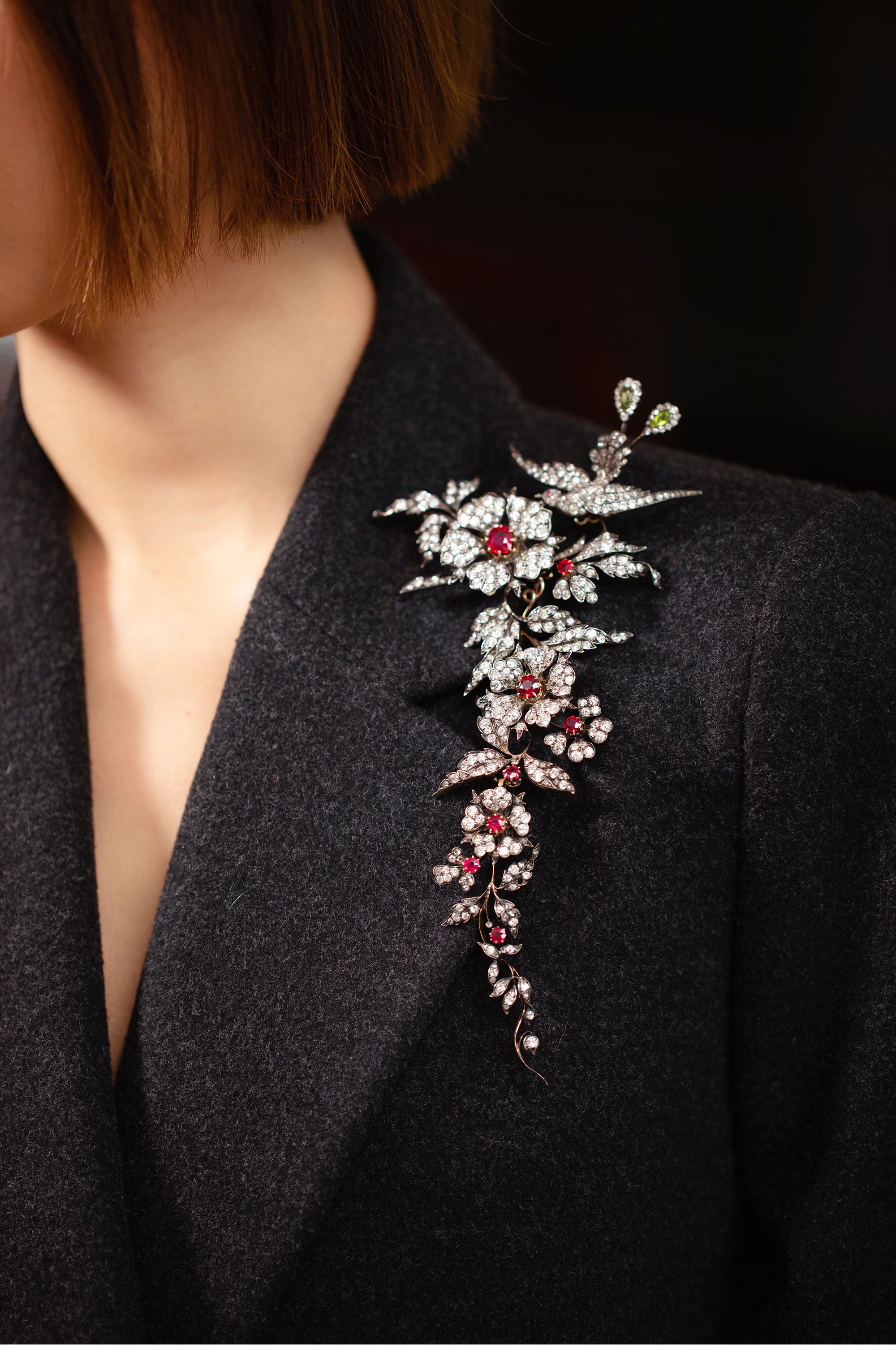 独角鹿西洋古董珠宝黄金纯银镶钻石红宝石橄榄石花鸟可拆卸胸针