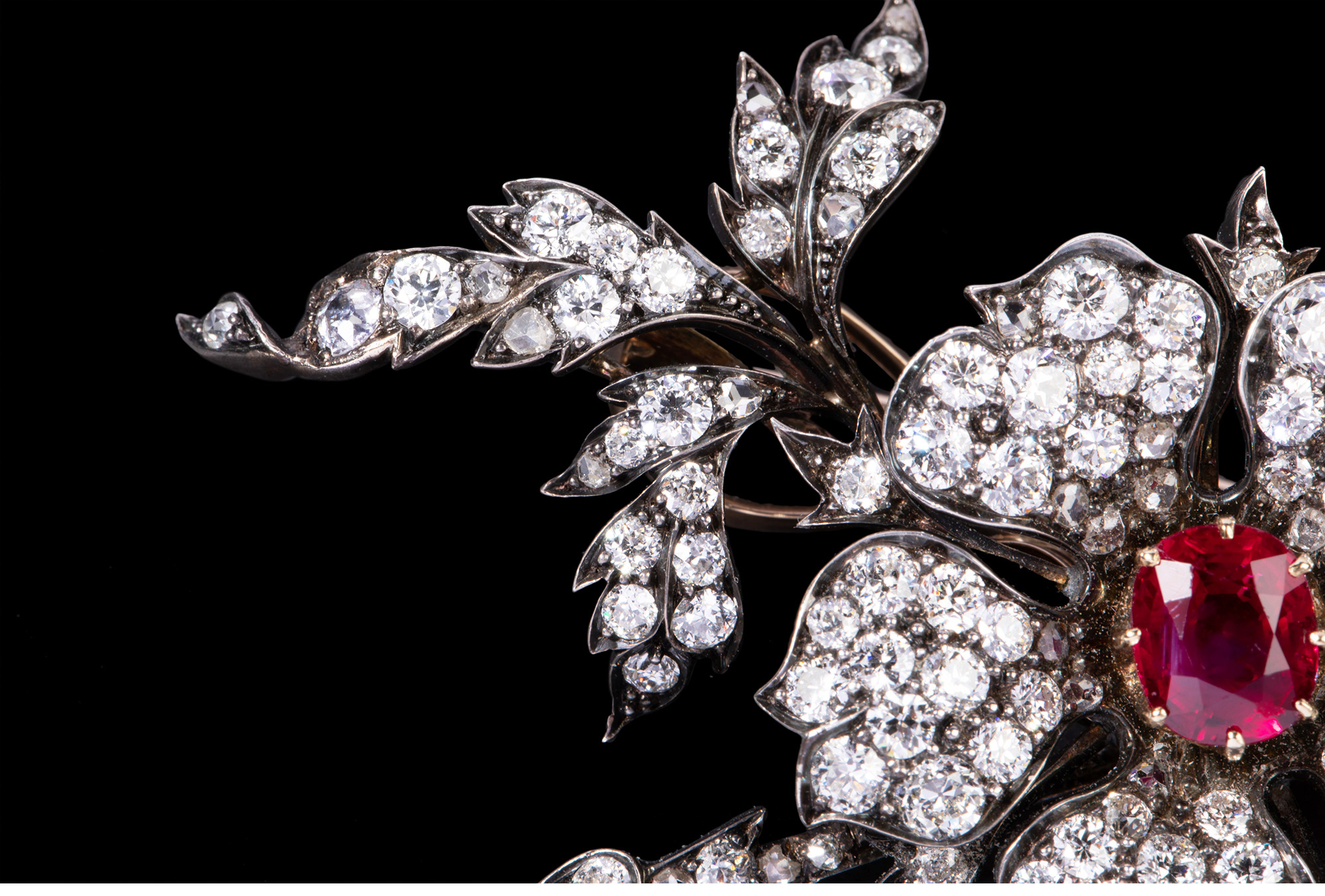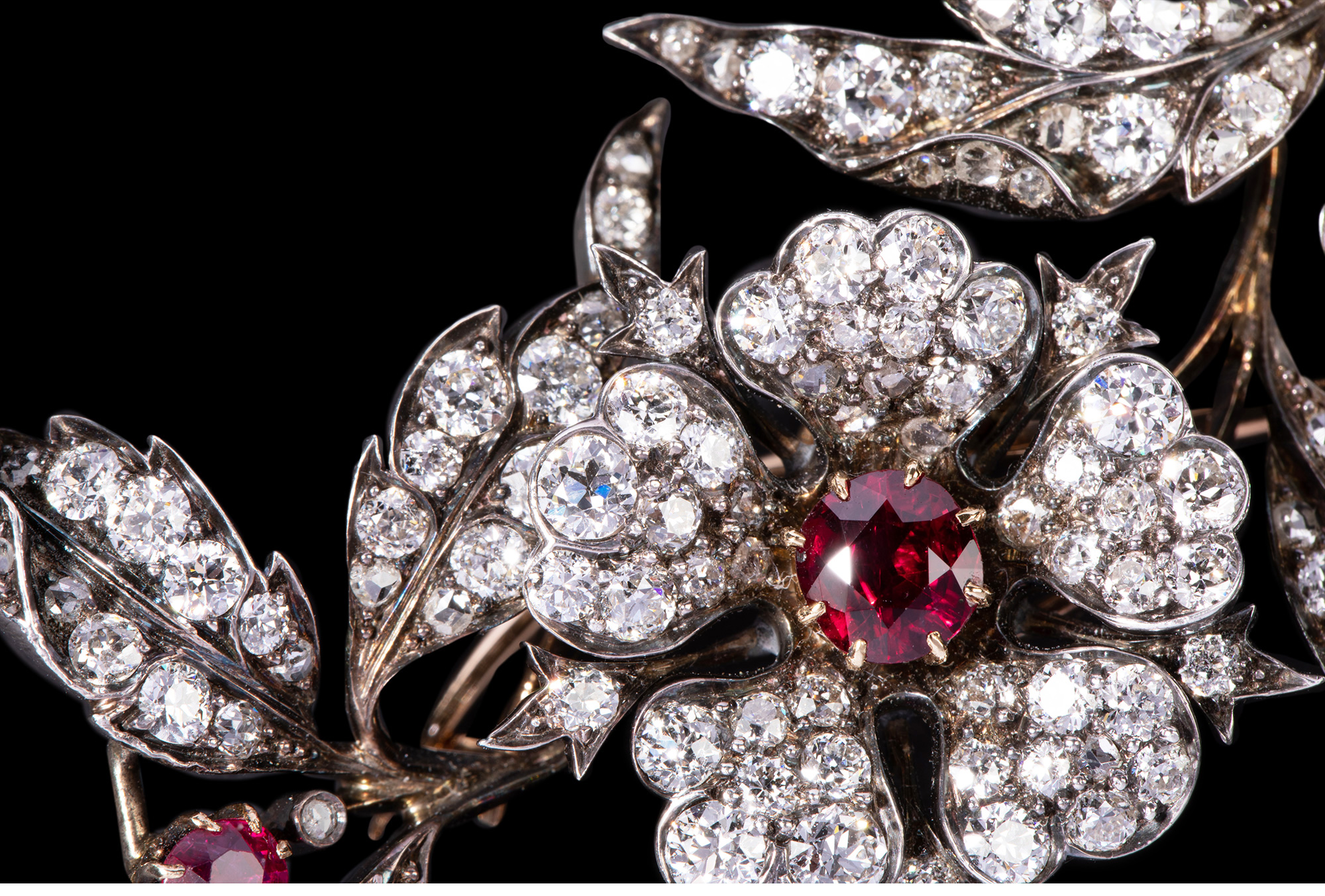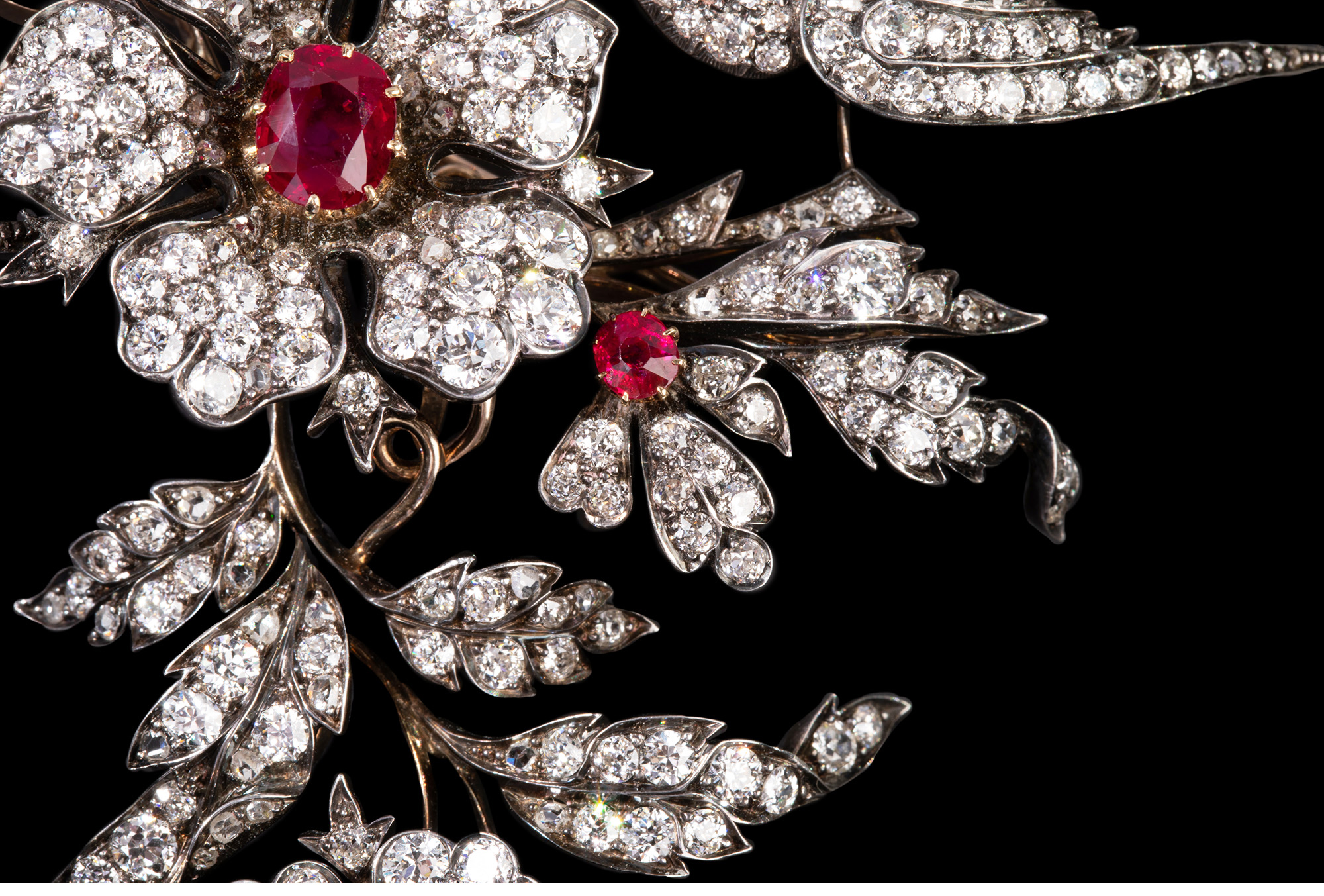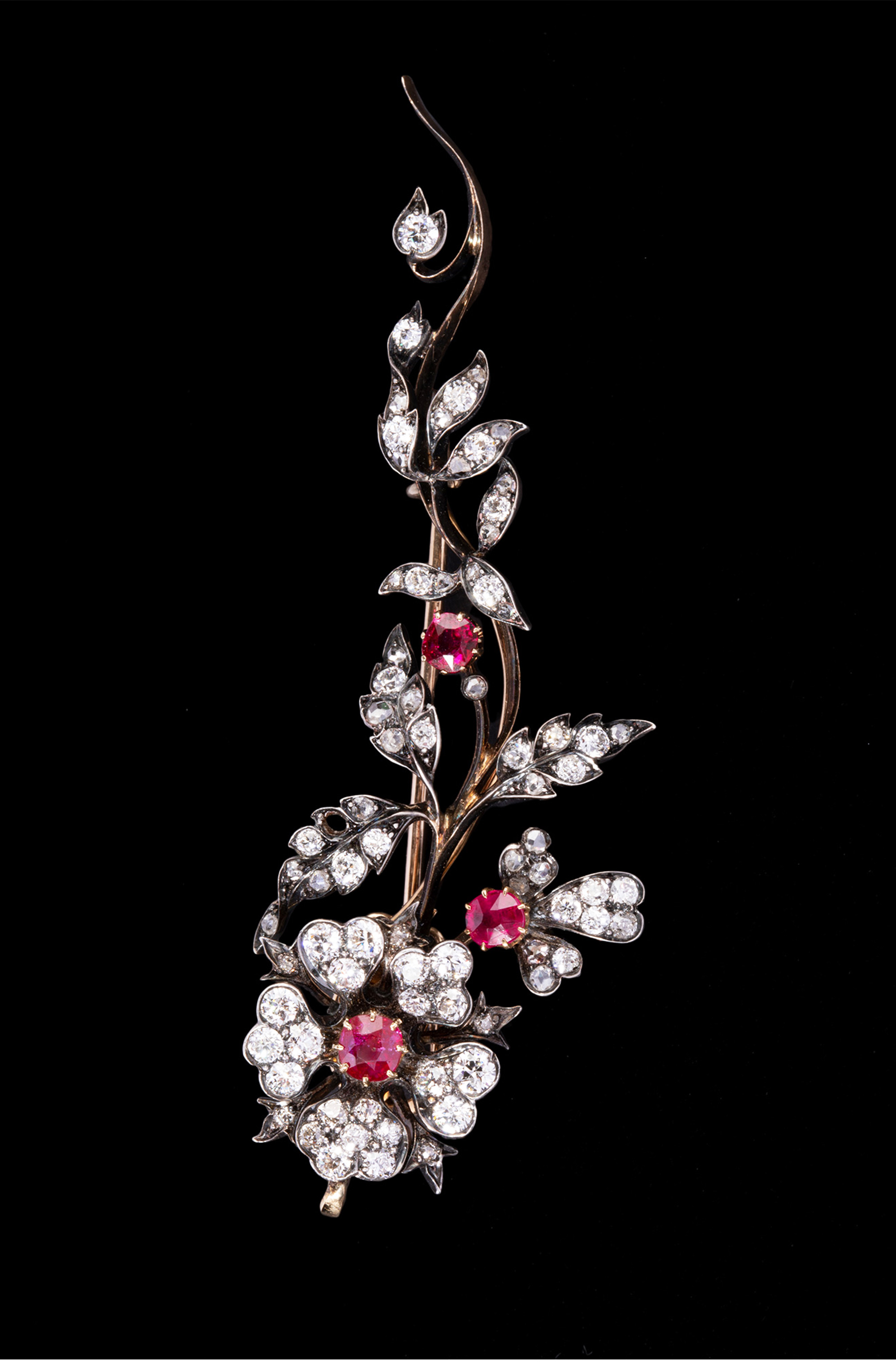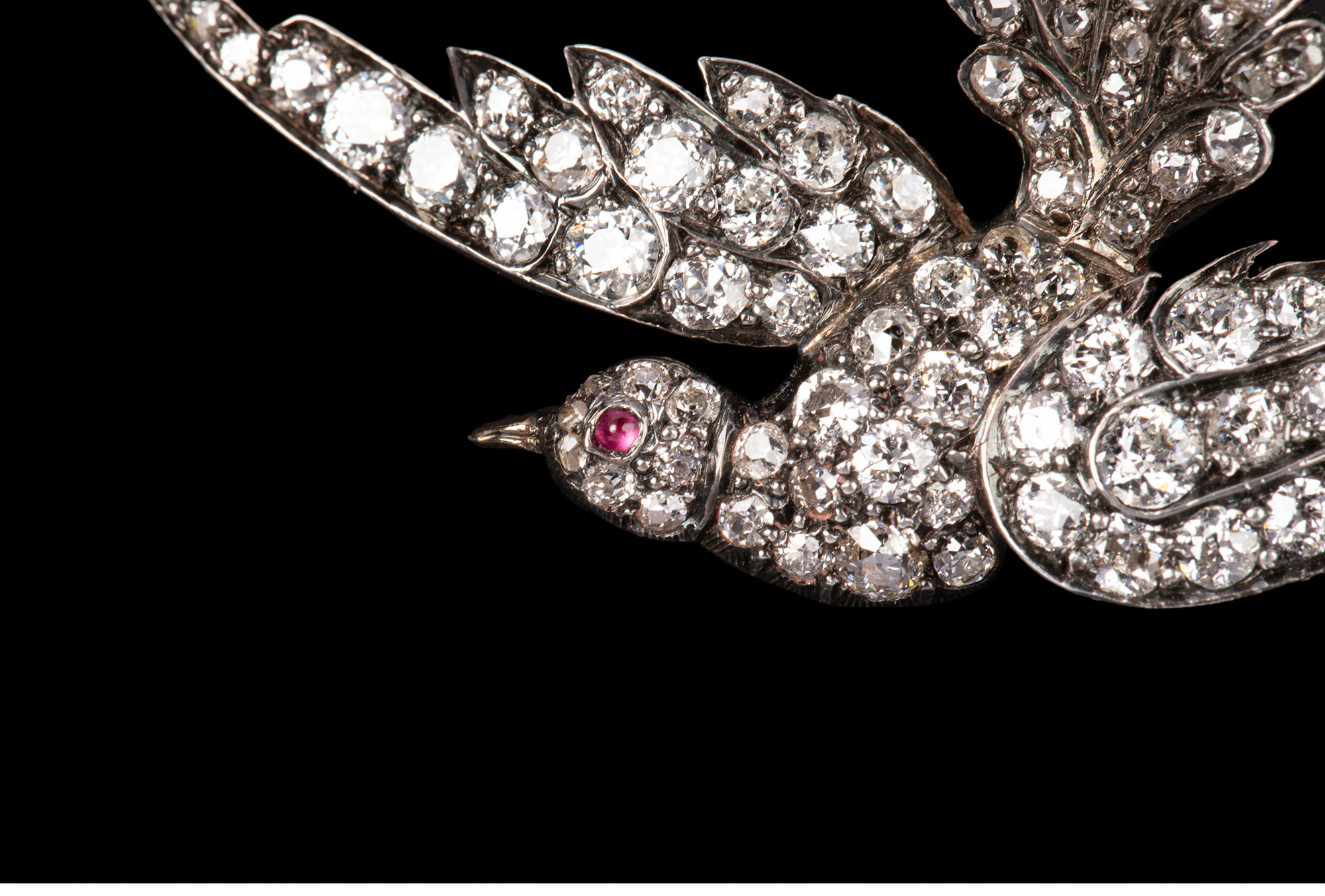 独角鹿西洋古董珠宝黄金纯银镶钻石红宝石橄榄石花鸟可拆卸胸针