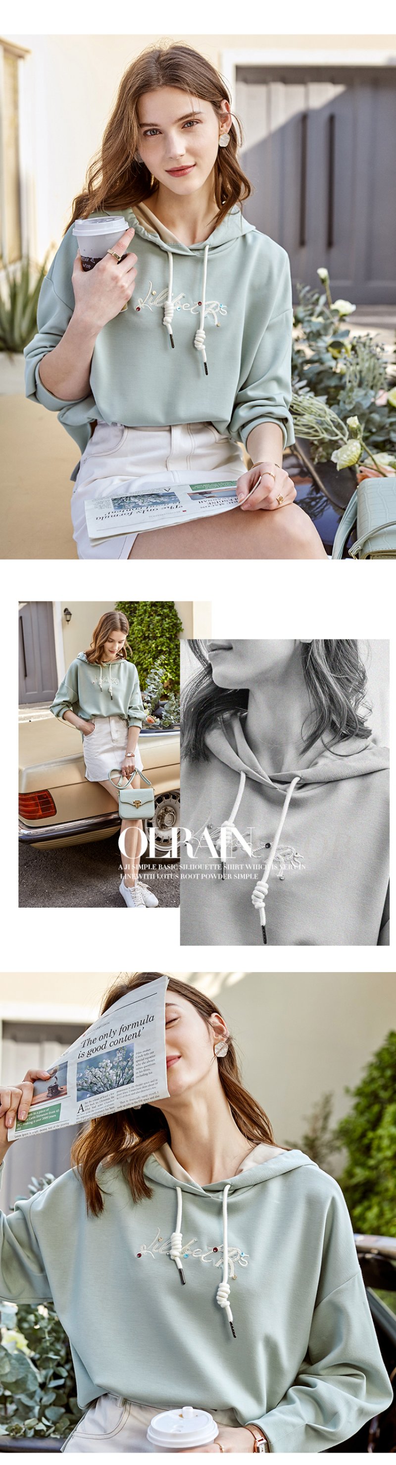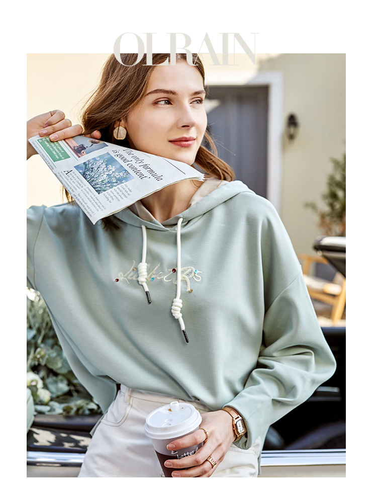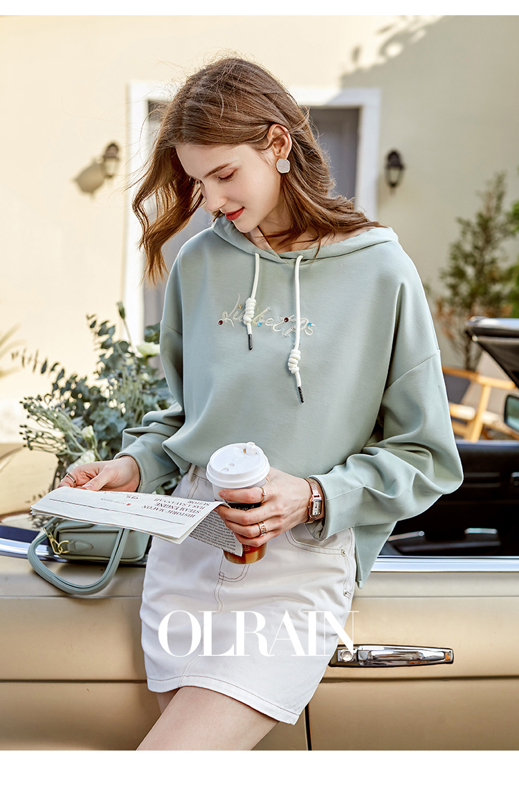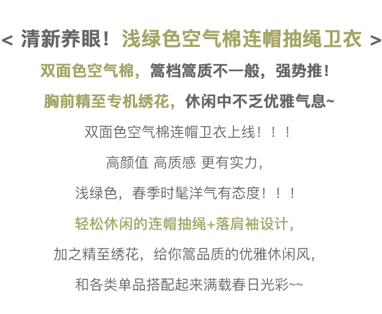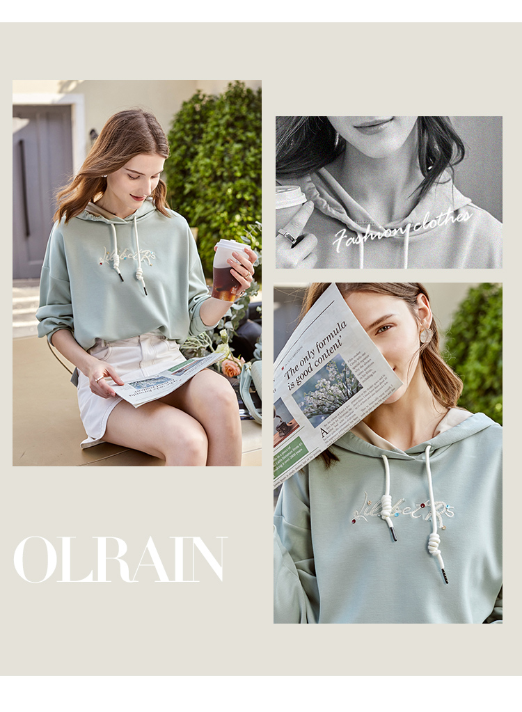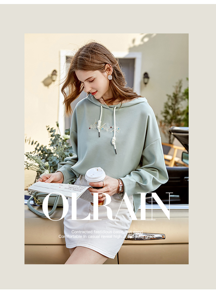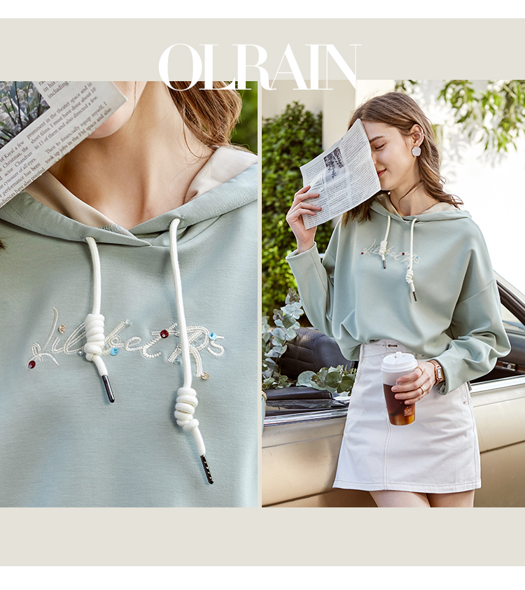 欧芮儿连帽抽绳卫衣女2021春新款空气棉绣花气质休闲优雅减龄上衣