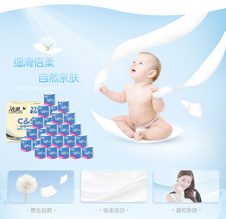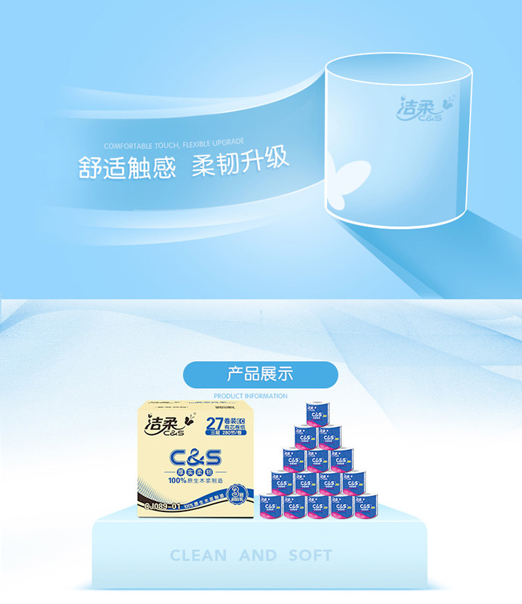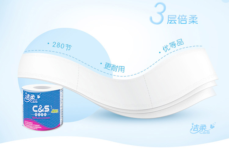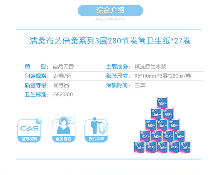 洁柔卷纸(C&S)优等品 倍柔3层280节卫生纸*27卷 整箱销售 (100%原生木浆厚实柔韧 冲水速溶不堵塞马桶)