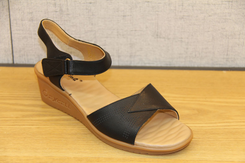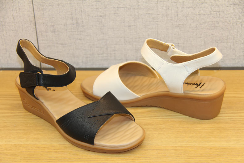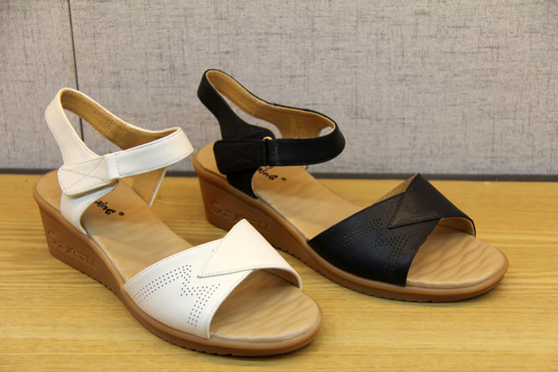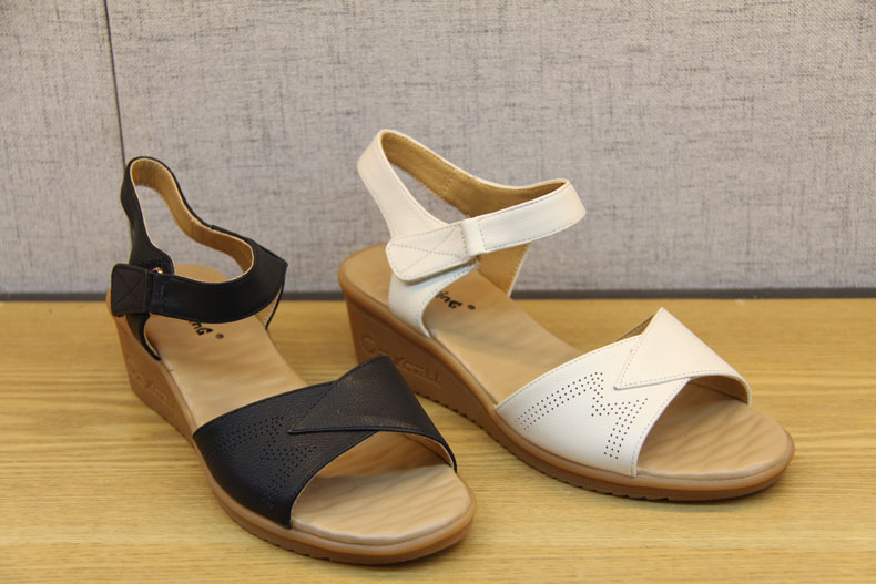 豪行女鞋21258081真皮坡跟高跟凉鞋百搭露趾厚底时尚粘扣女士凉鞋 专柜正品 跟高5CM