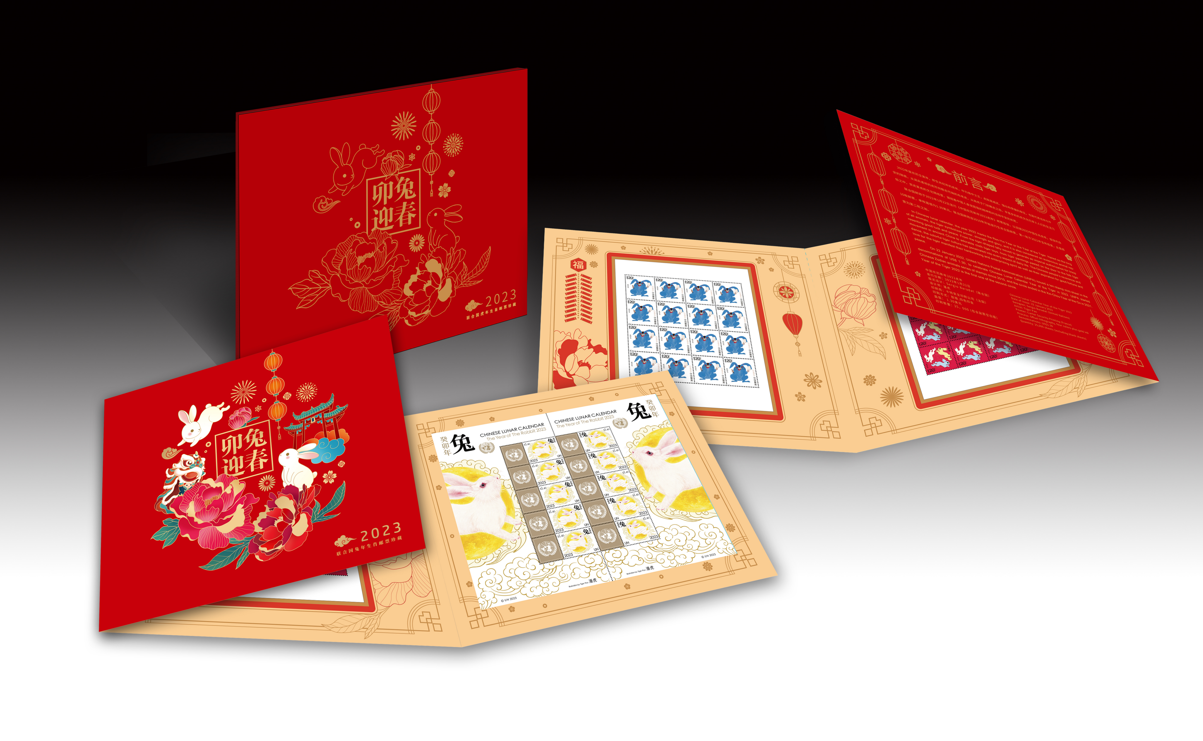 首次推出世界共享生肖文化的概念,将中国邮政与联合国邮政发行兔年生肖邮票置于一个邮折内,是新年馈收藏、馈赠佳品。