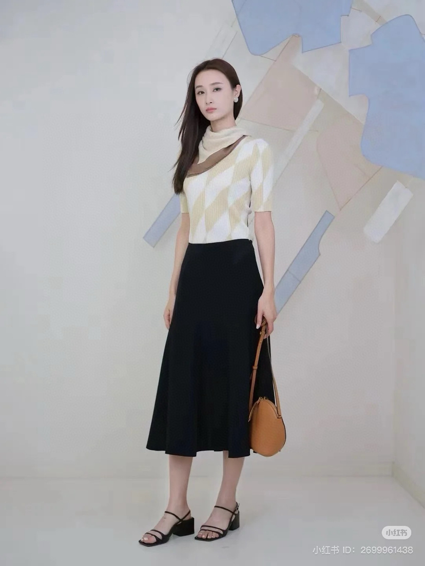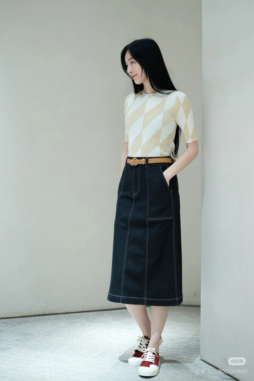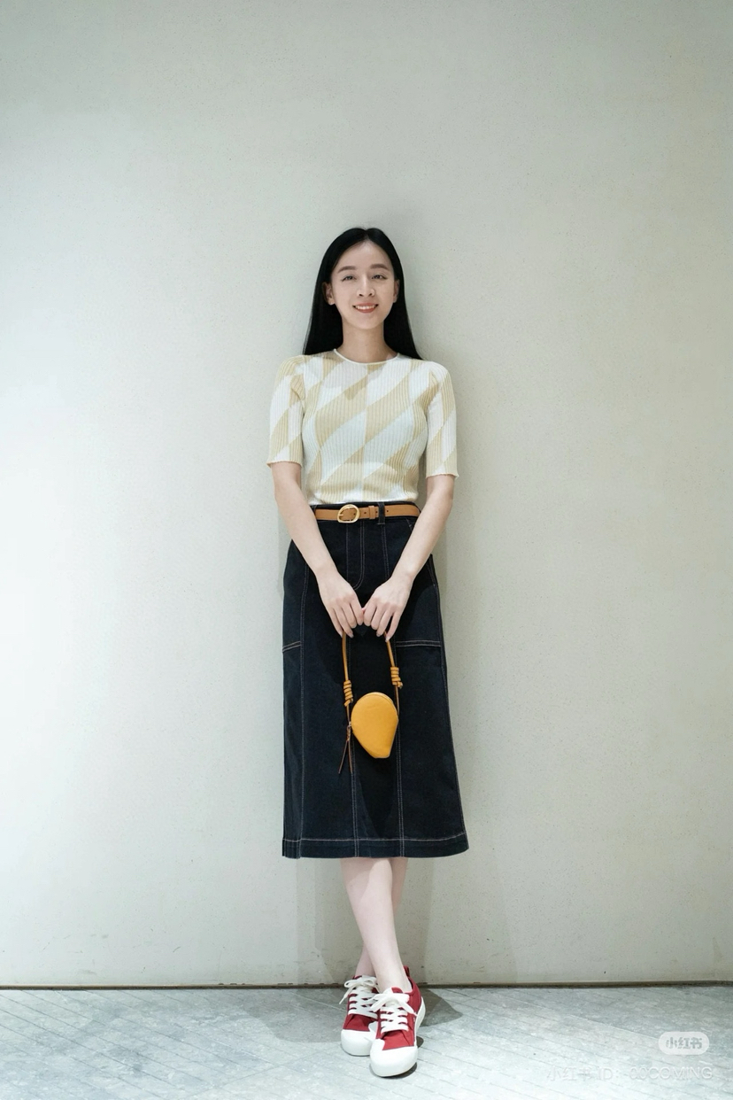 搭配牛仔裙半啊,长裤啊,裤中啊,西裤啊,都很合,适修身不紧绷的款式苗,条的穿上更身显材