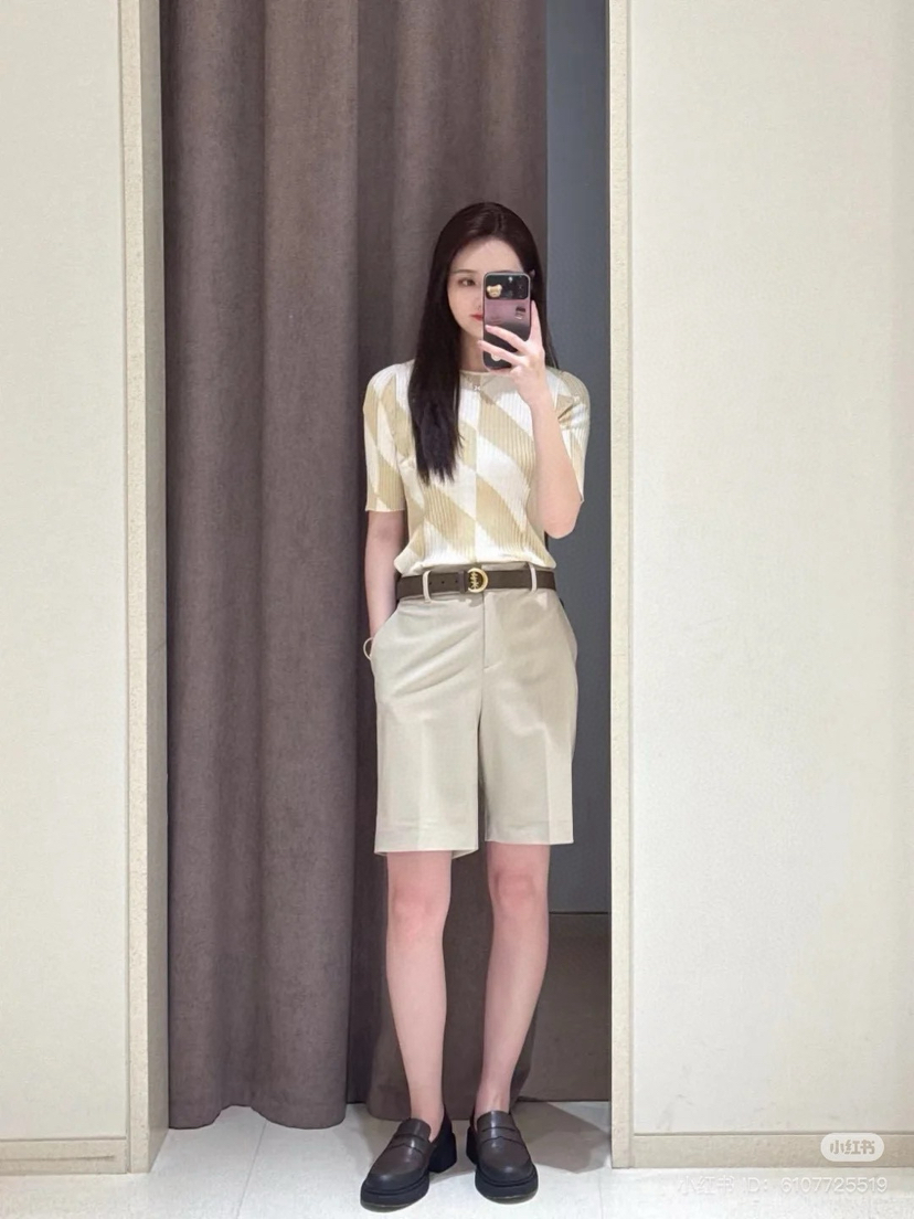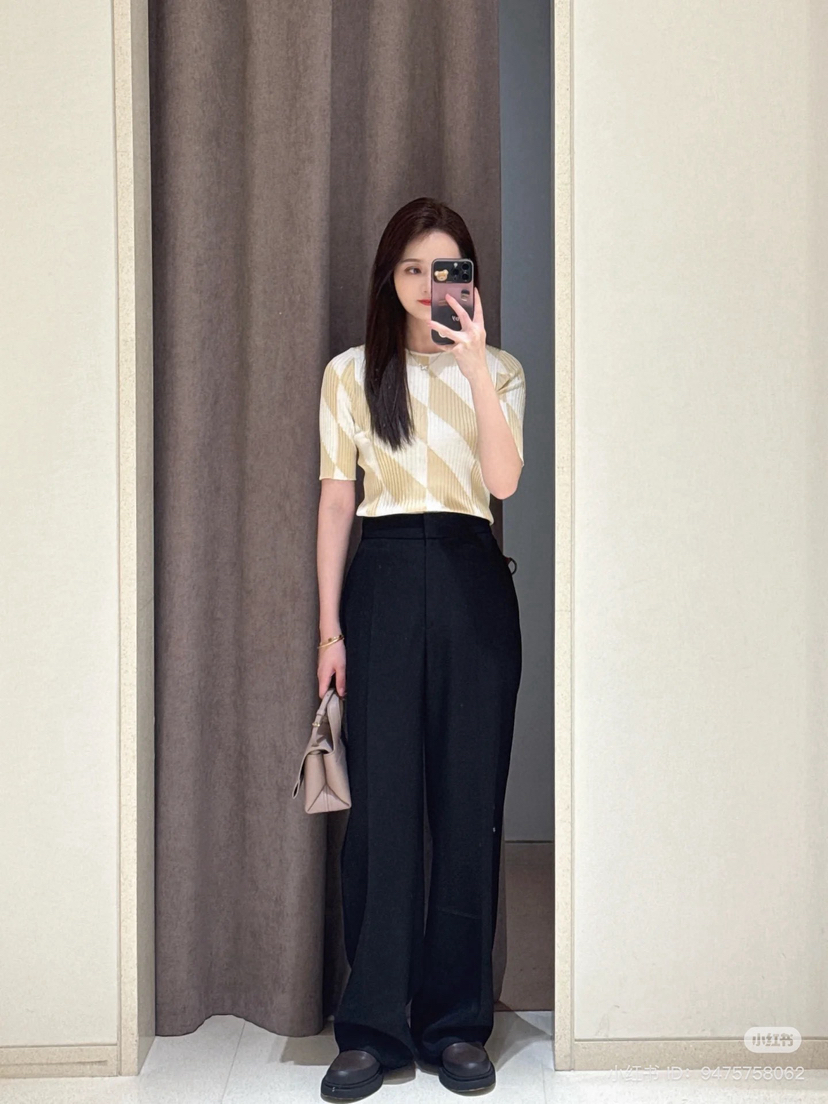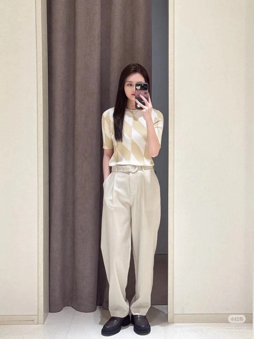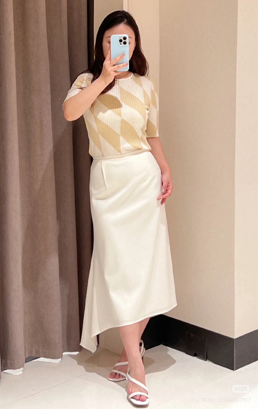 搭配牛仔裙半啊,长裤啊,裤中啊,西裤啊,都很合,适修身不紧绷的款式苗,条的穿上更身显材