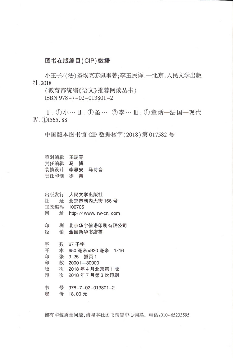 小王子 圣埃克苏佩里著 学生版 部编版统编语文小学生三四五六3456年级课外读物阅读书目经典名著人民文学出版社 世界名著