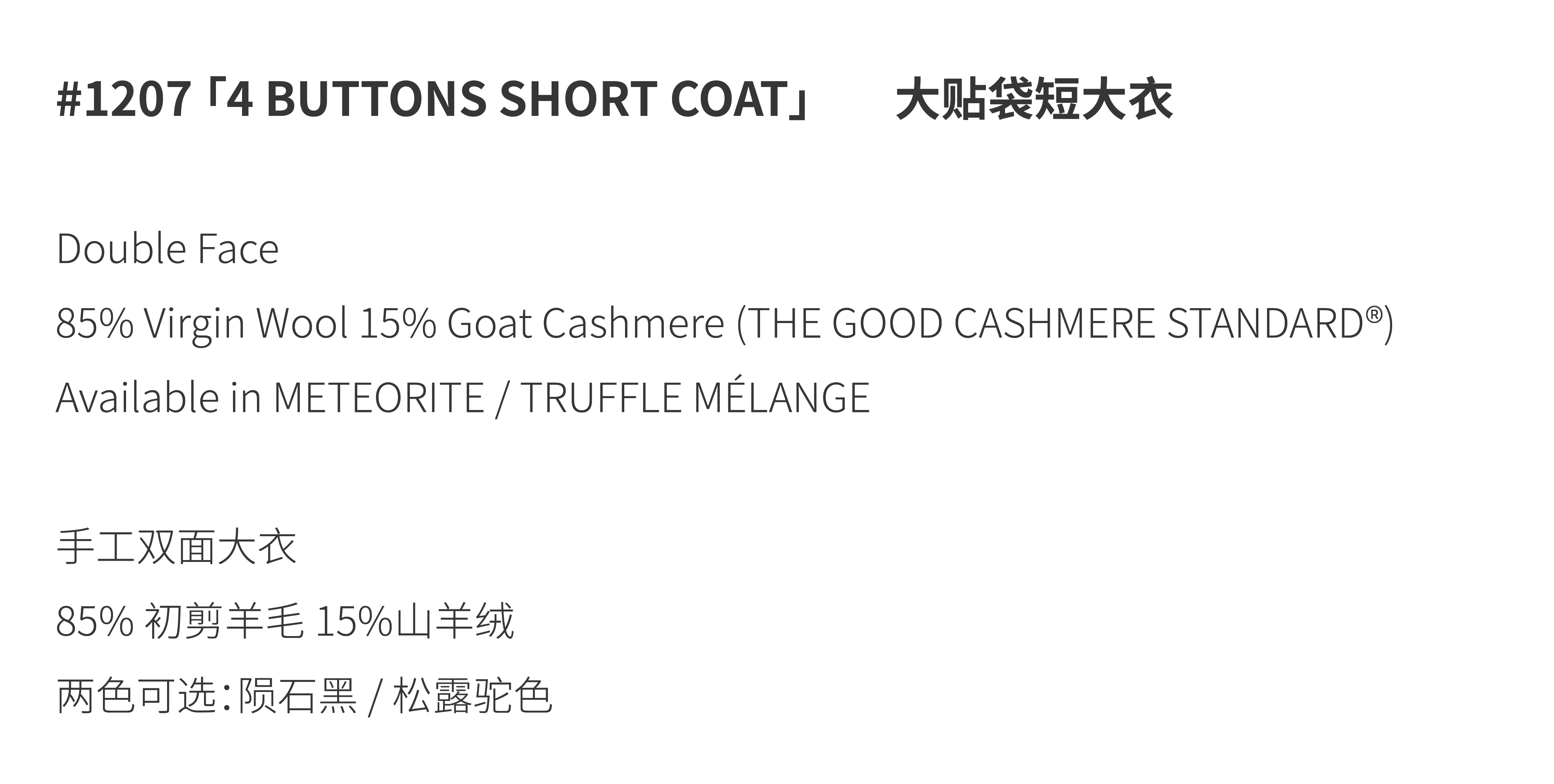 #1207「4 BUTTONS SHORT COAT 」85% WOOL 15% CASHMERE 大贴袋短大衣