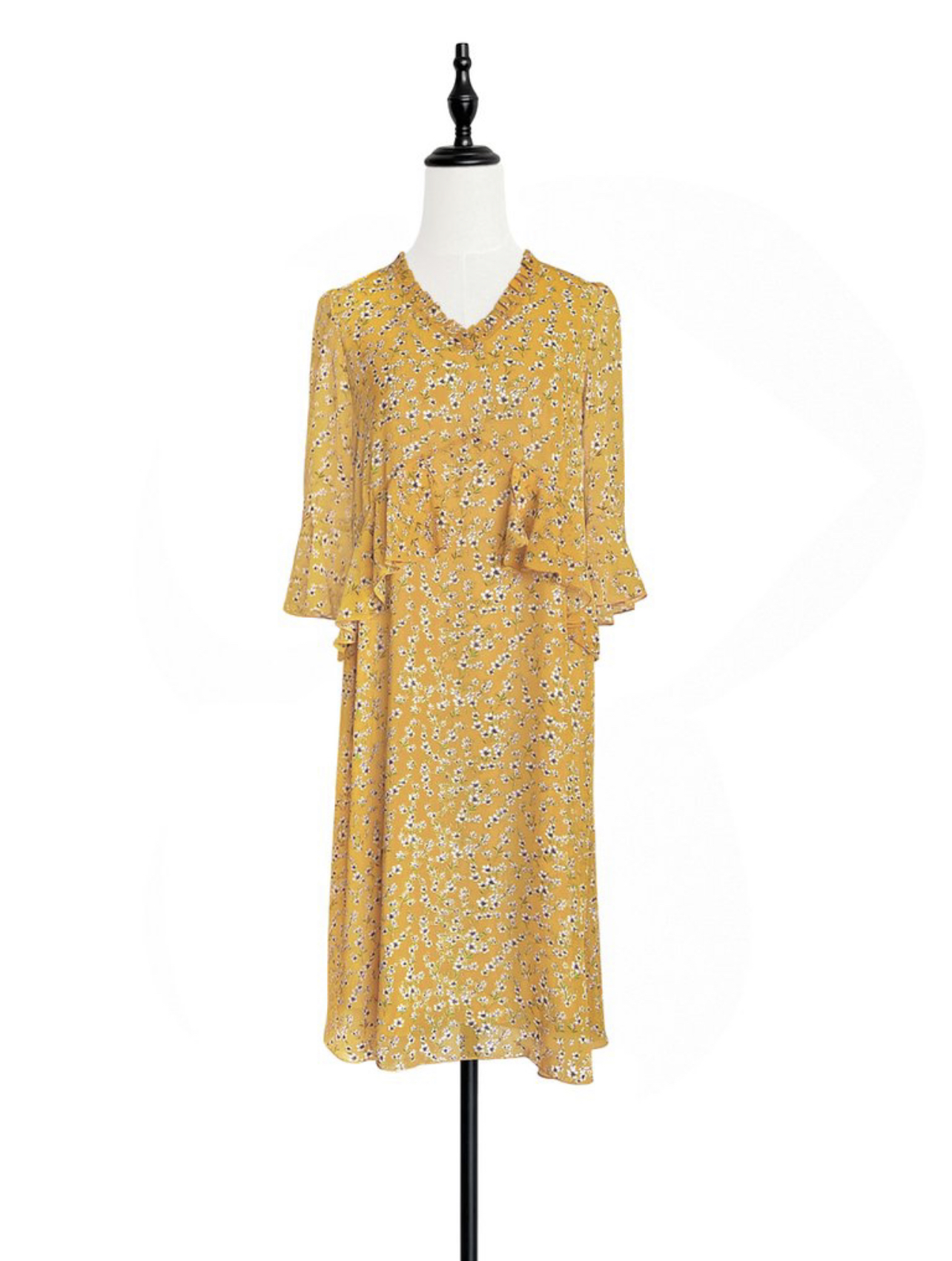 TYNVIE 荷叶边袖口中袖连衣裙 - 黄印花 商品图1