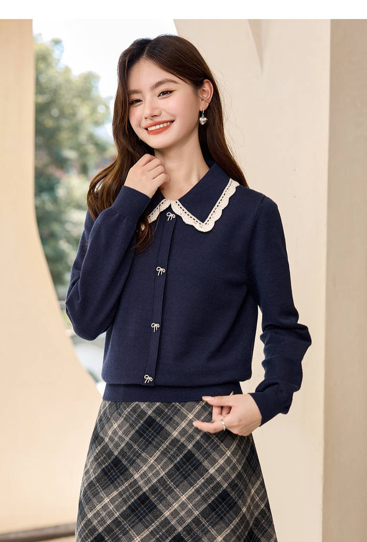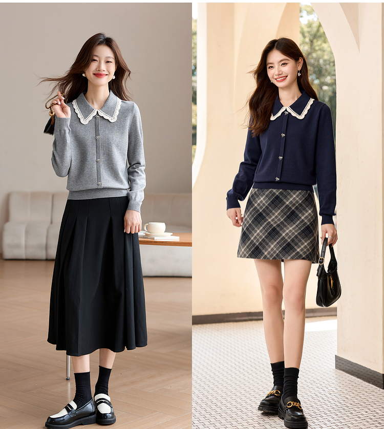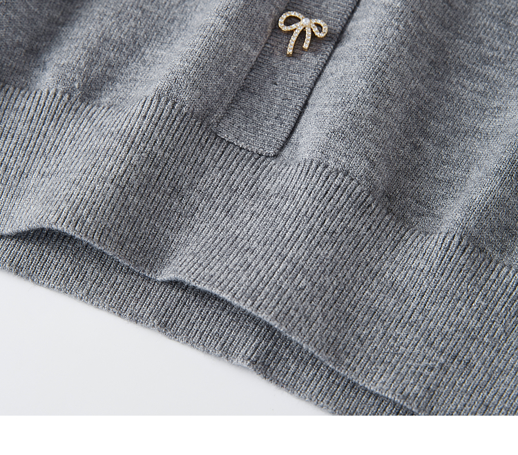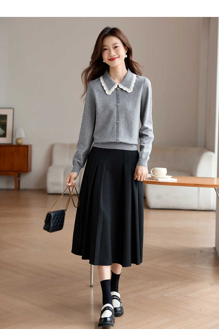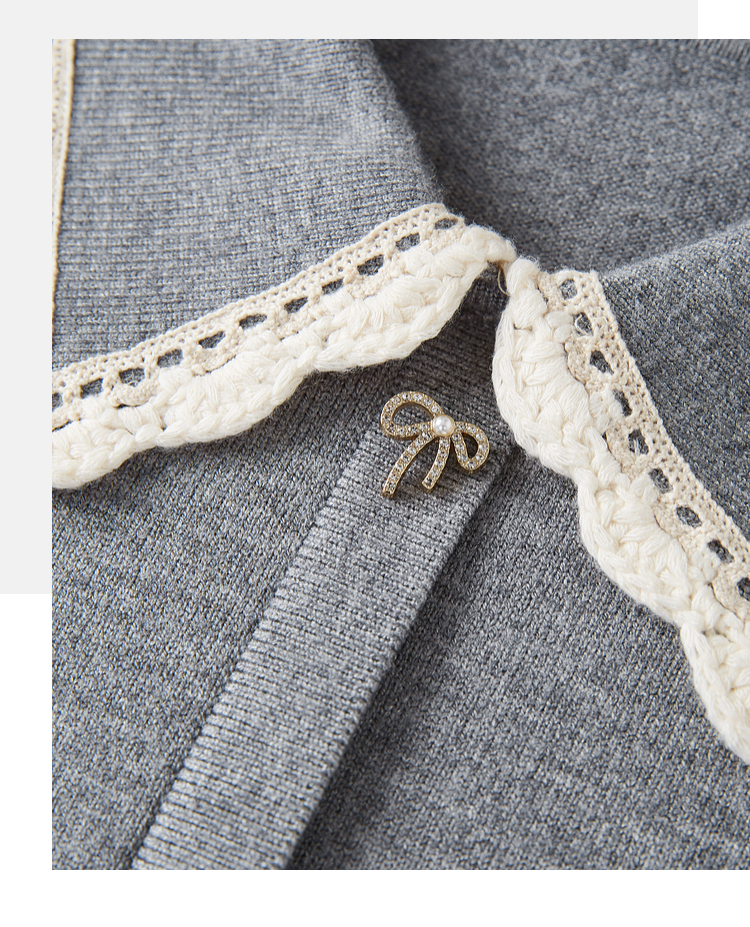 【1件75折】熙世界灰色花边织带翻领毛衣女设计感内搭打底针织衫2025秋冬新款