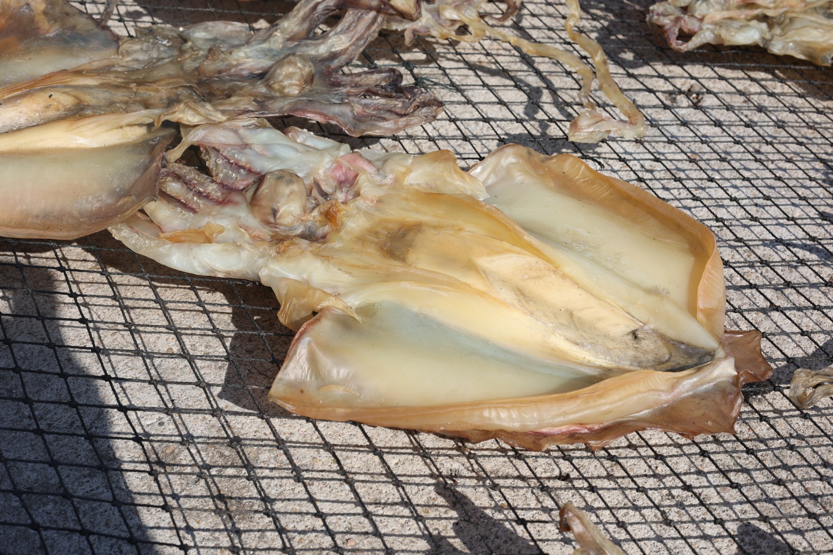 6斤鲜墨鱼最终只能晒成1斤墨鱼干,需要历经多个日夜的晾晒,晒干的墨鱼干表面平整,皮薄肉厚,呈半透明金黄色,干度足,是一眼能看见的美味哟。