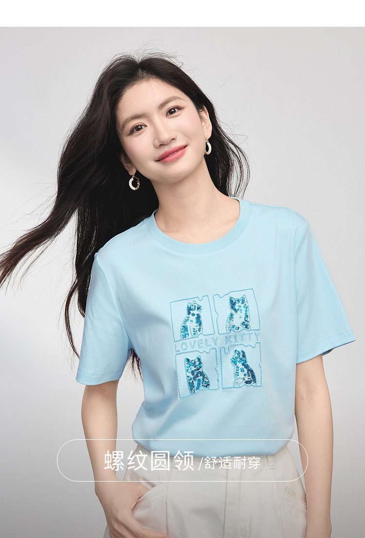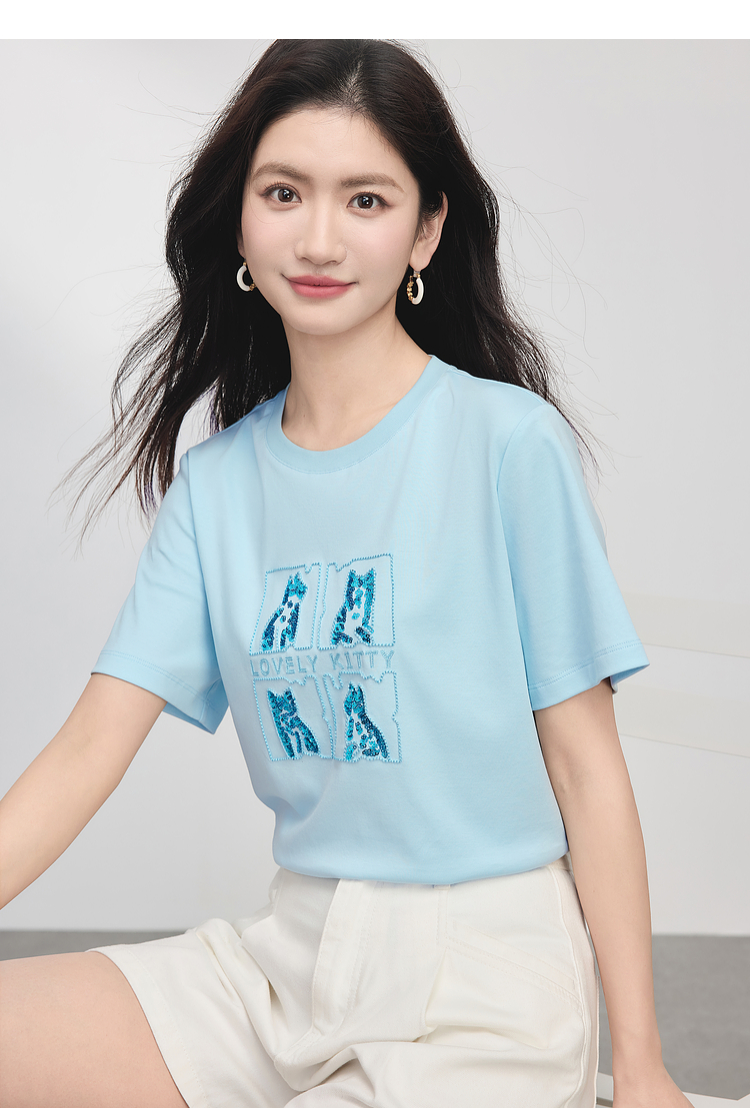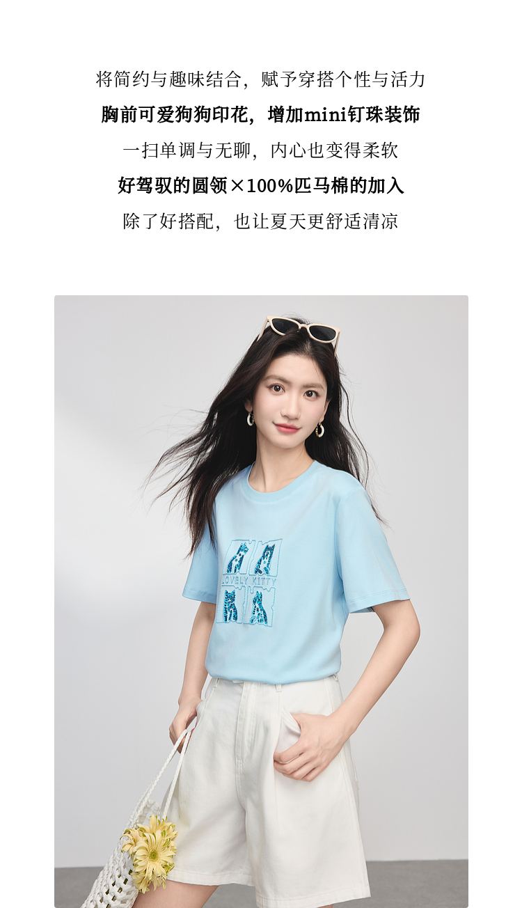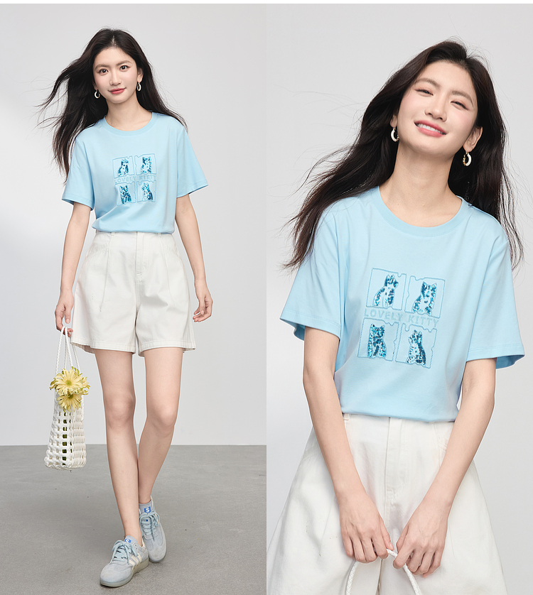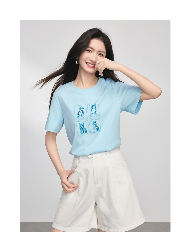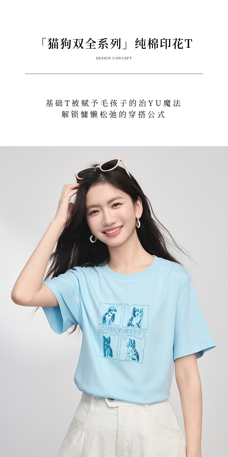 【专属特价】熙世界趣味减龄猫狗印花T恤女夏季短袖休闲风纯棉体恤2025年新款