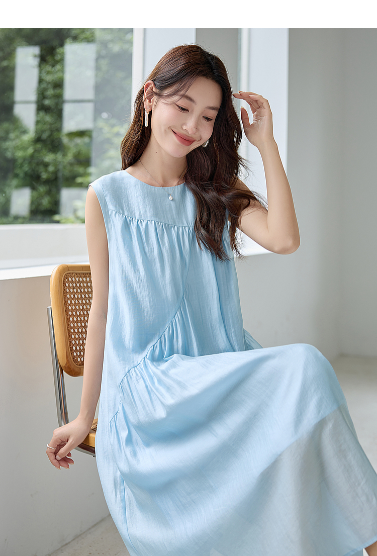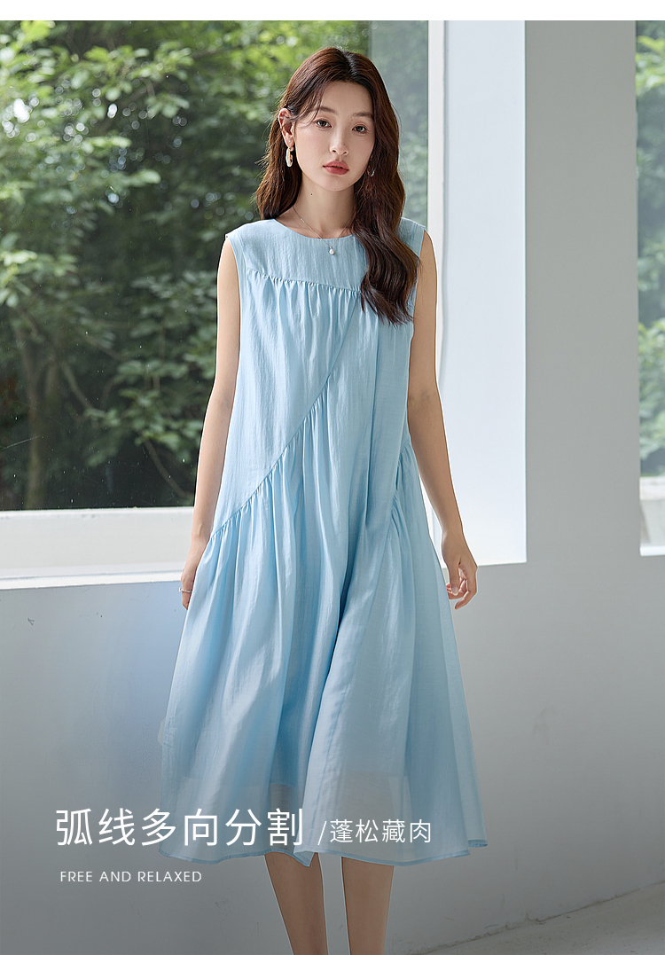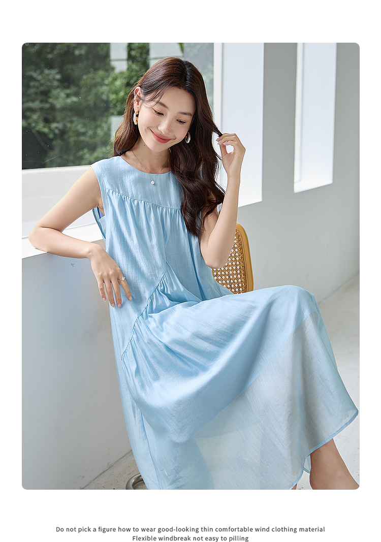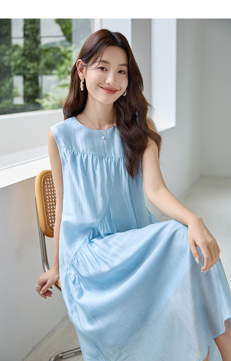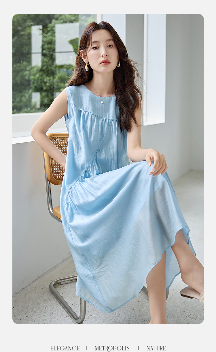 【专属特价】熙世界莱赛尔天丝无袖连衣裙夏季新款气质圆领法式度假蓝色裙子