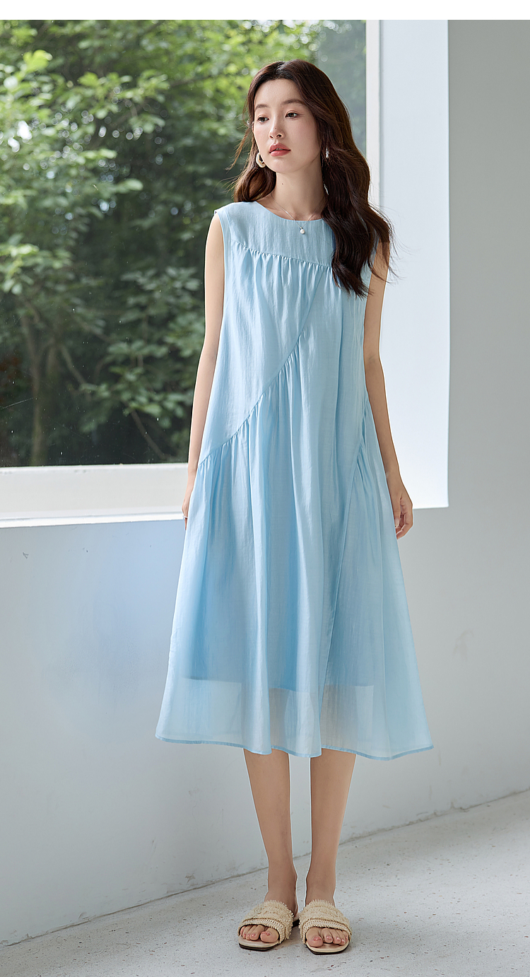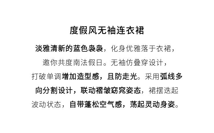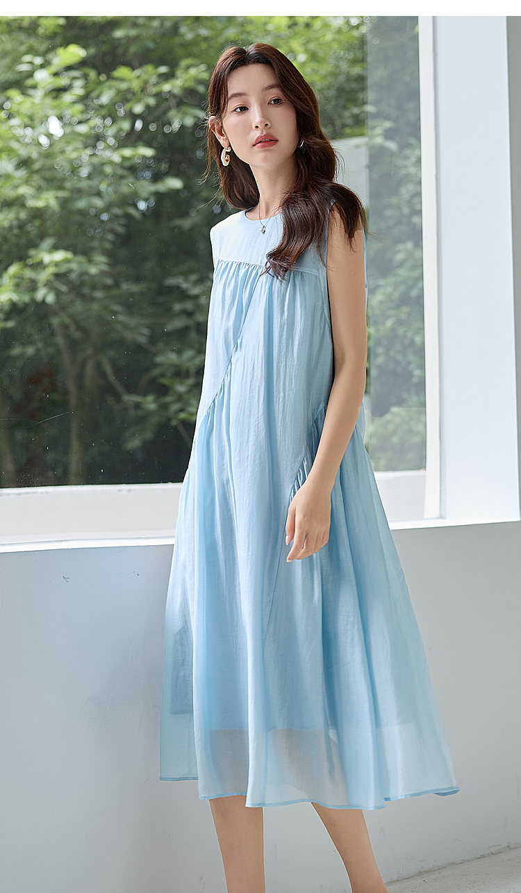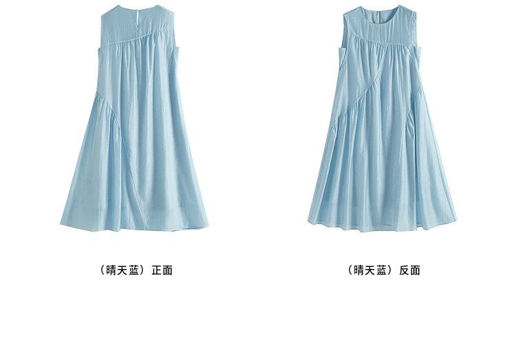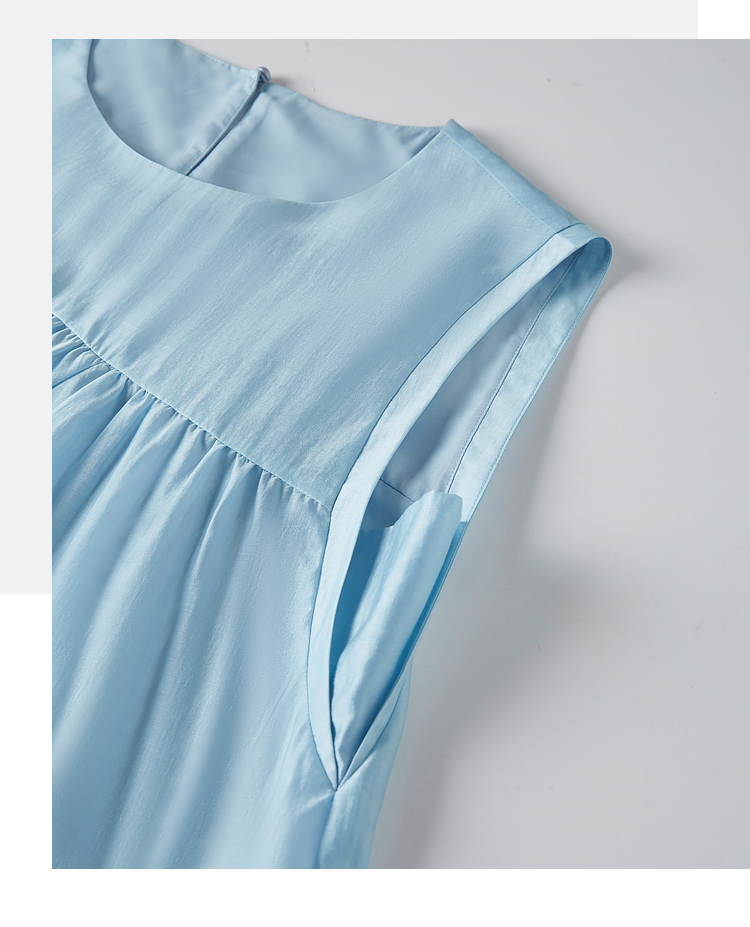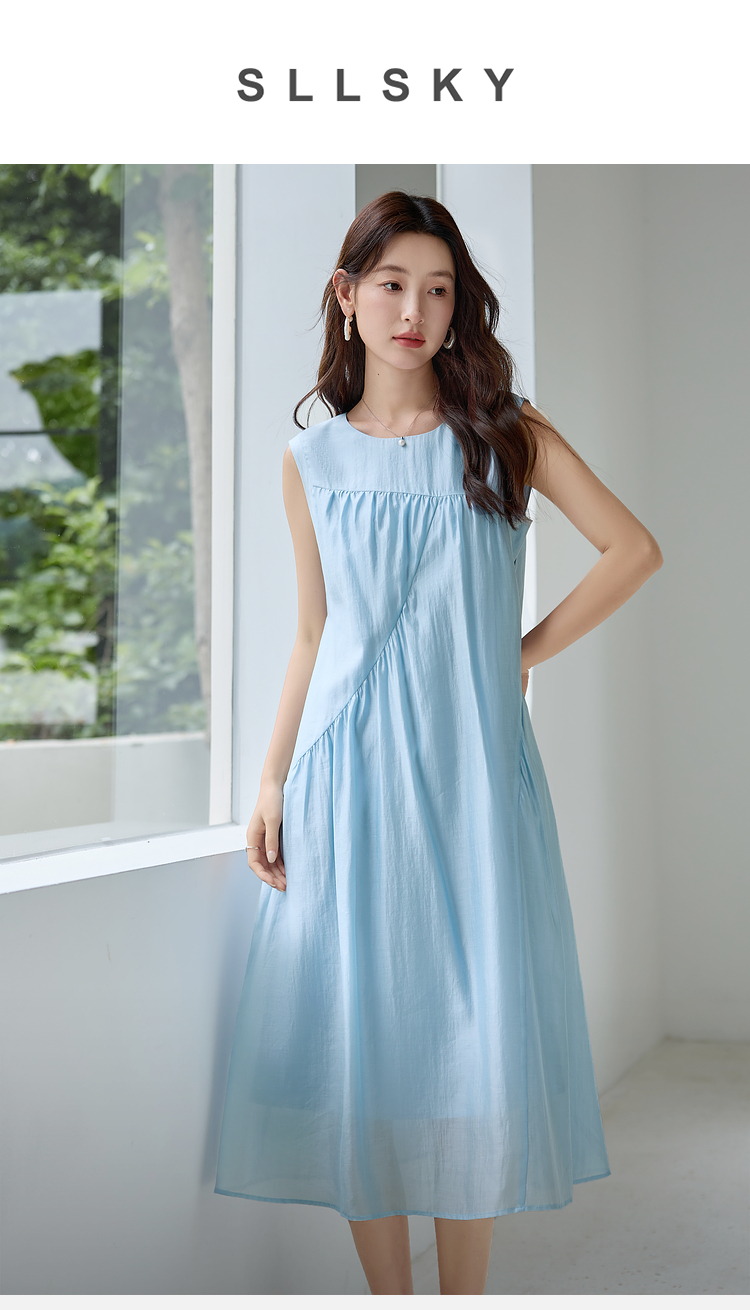【专属特价】熙世界莱赛尔天丝无袖连衣裙夏季新款气质圆领法式度假蓝色裙子