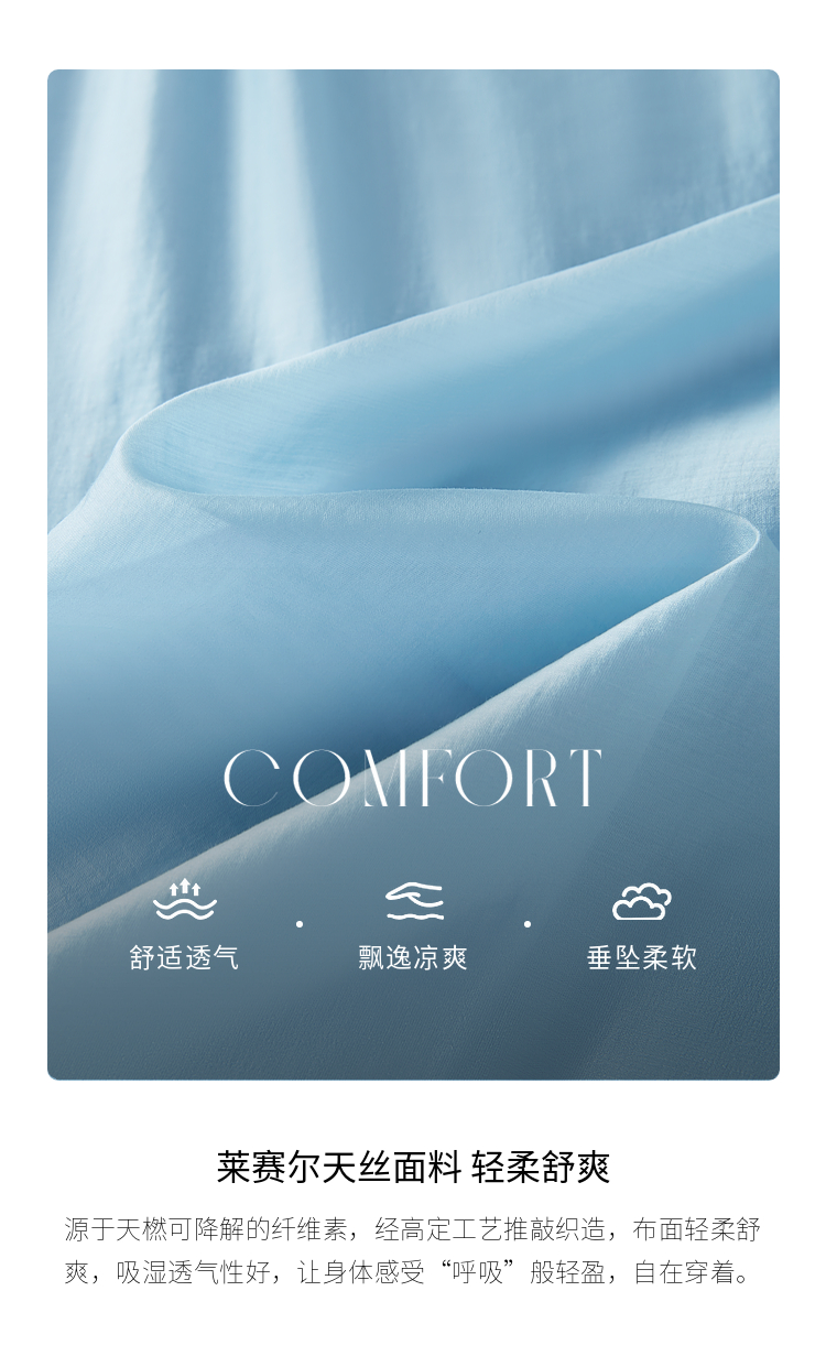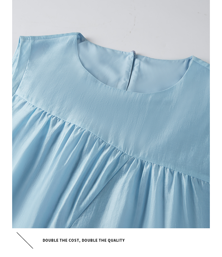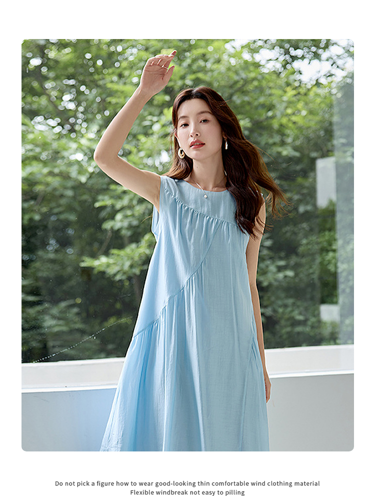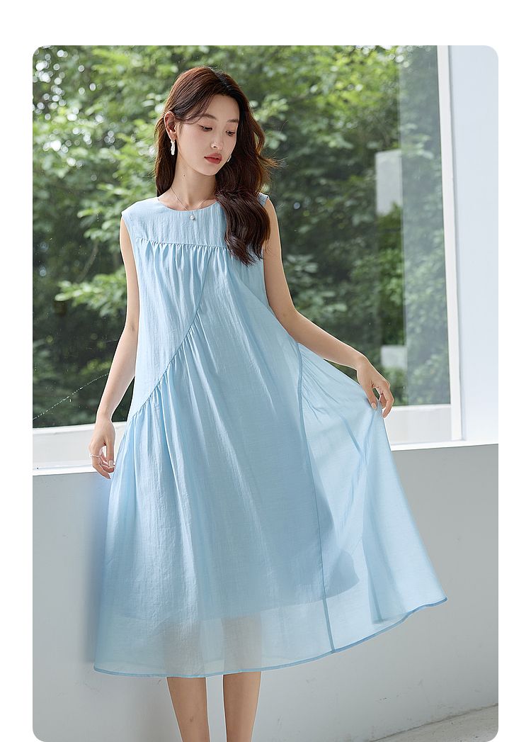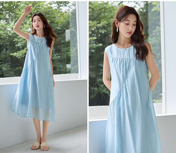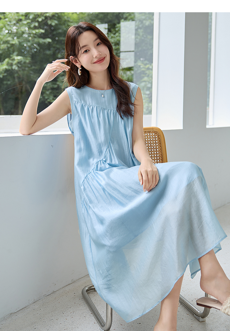 【专属特价】熙世界莱赛尔天丝无袖连衣裙夏季新款气质圆领法式度假蓝色裙子